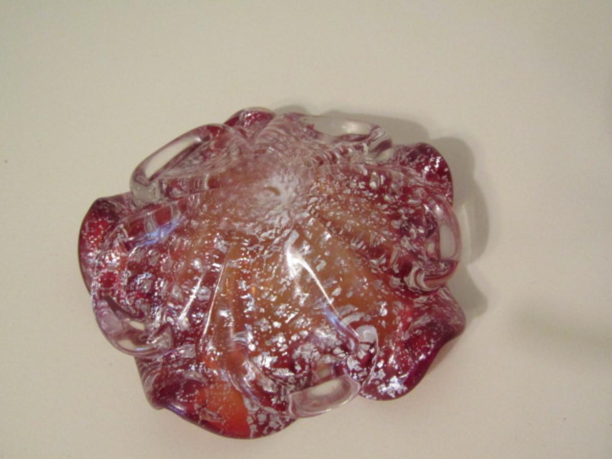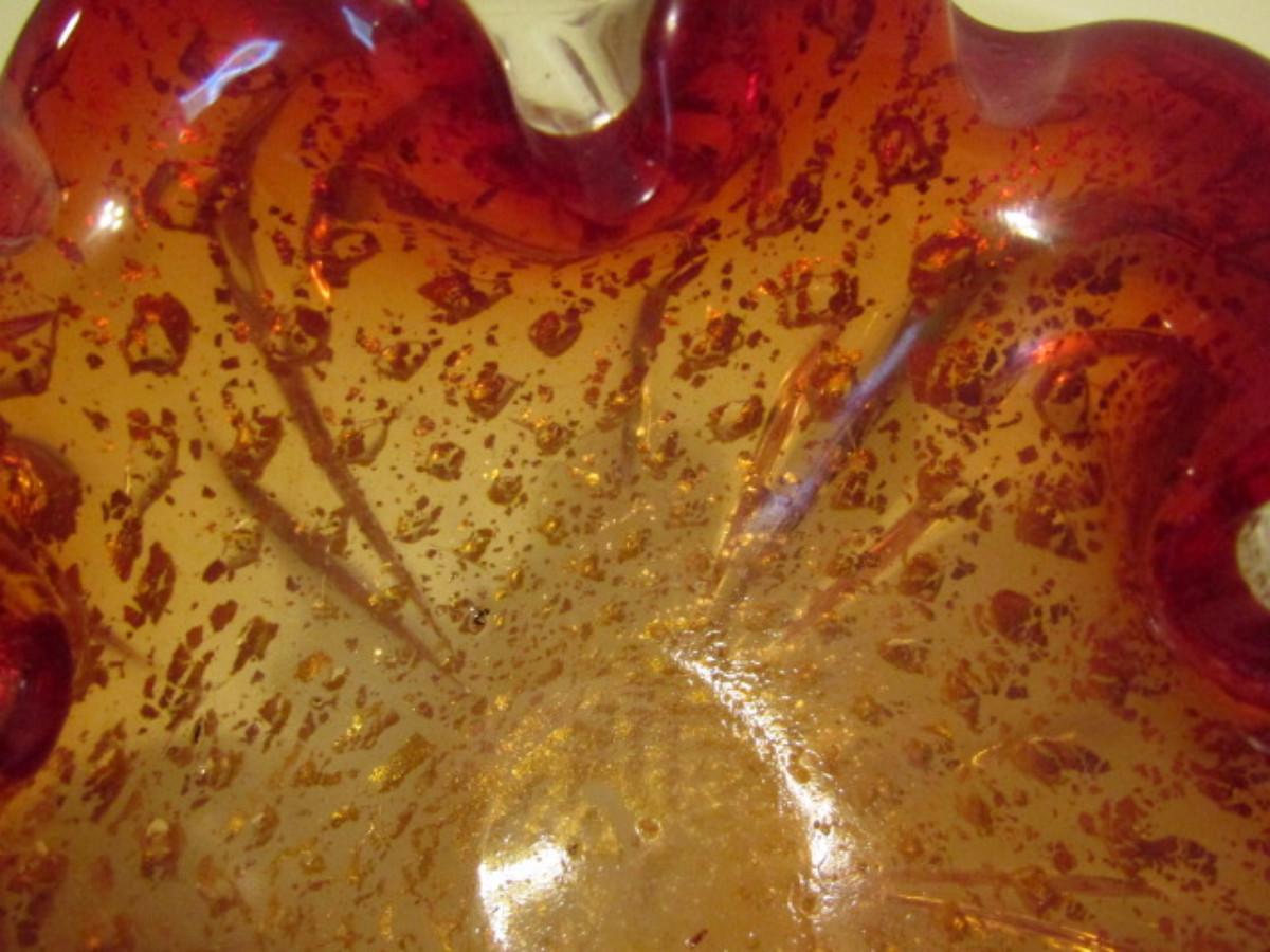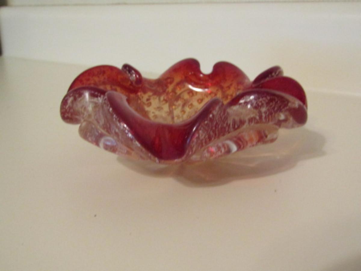 Vintage Art Glass Ashtray/Trinket Dish Aventurine Red Gold Ruffled Edge