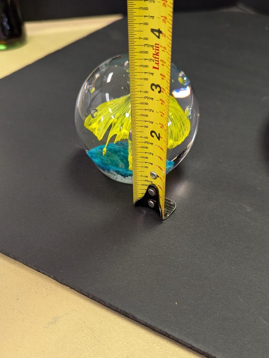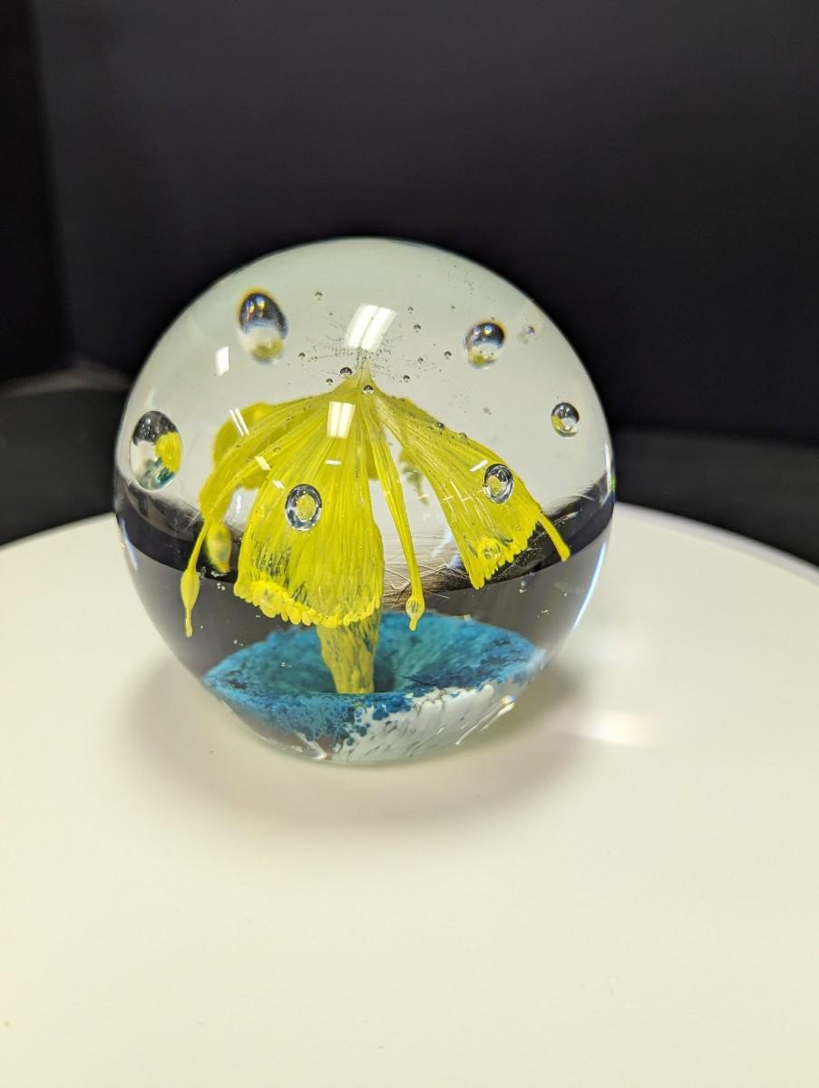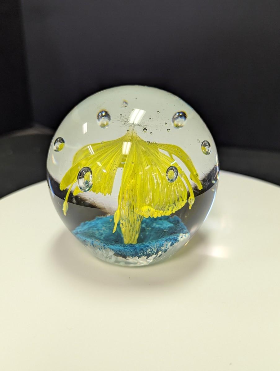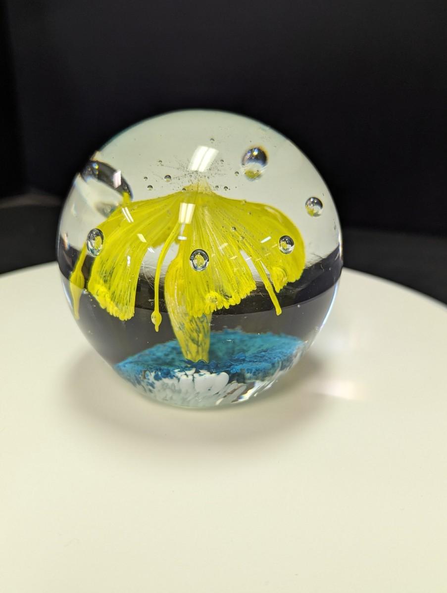 Paperweight Is Hand-Blown & Features A Yellow Flower Design With A Blue Base & Controlled Bubbles
