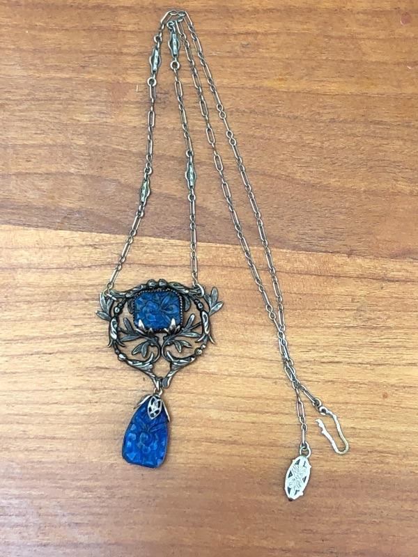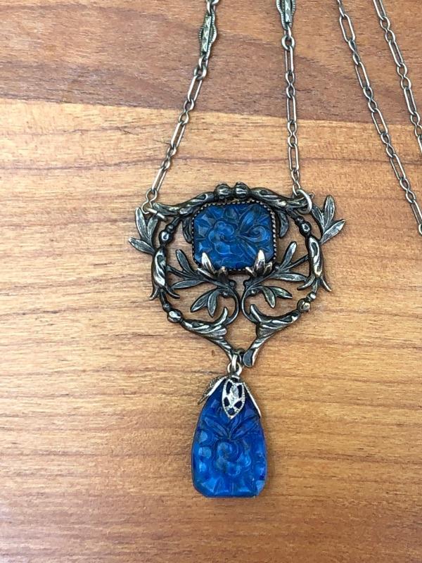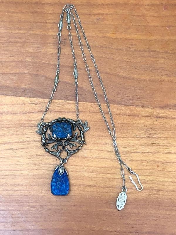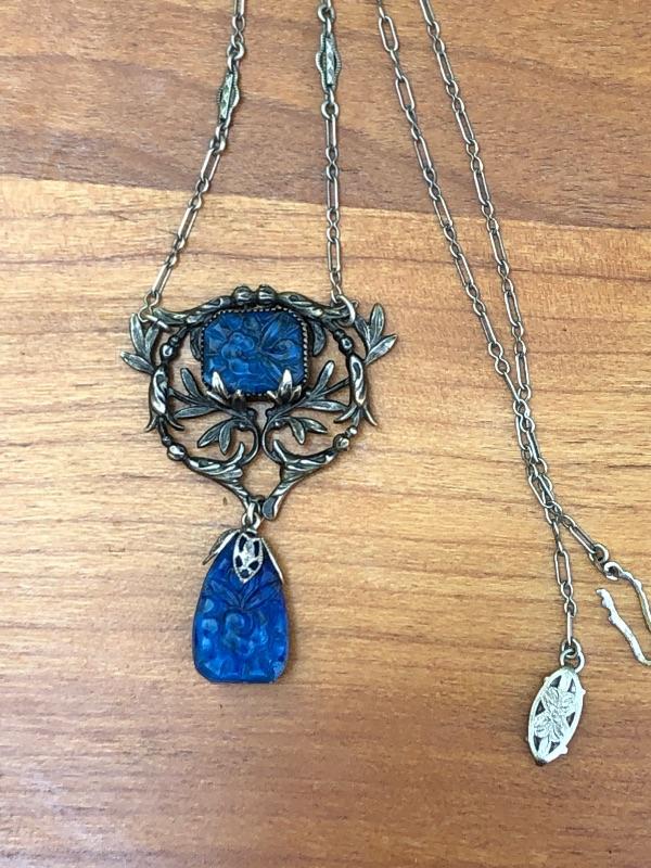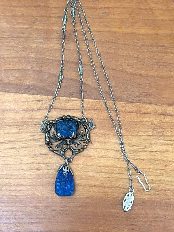Vintage Art Nouveau Carved Sodalite Stones Pendant Necklace