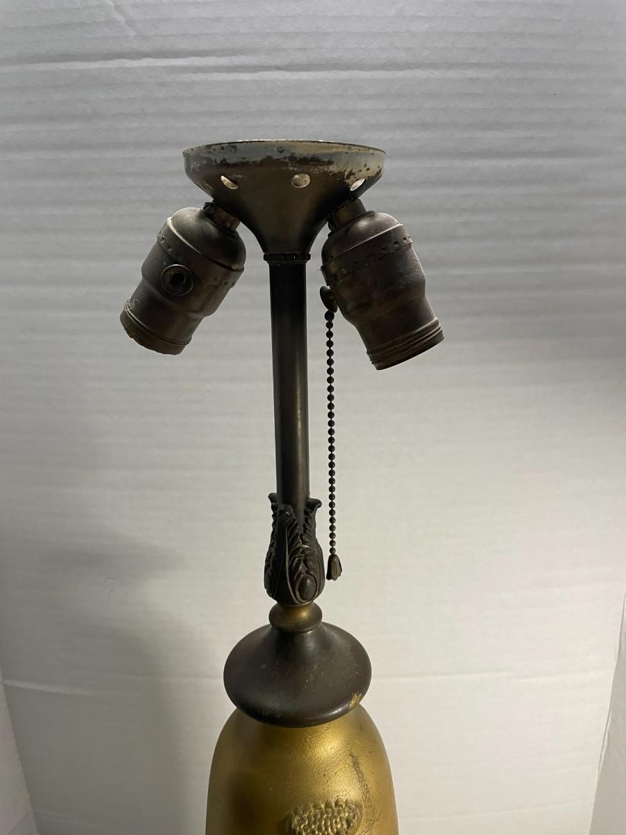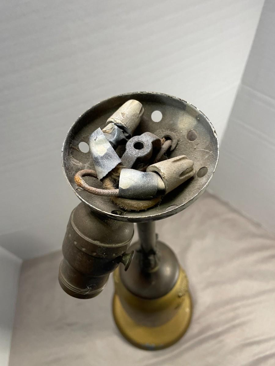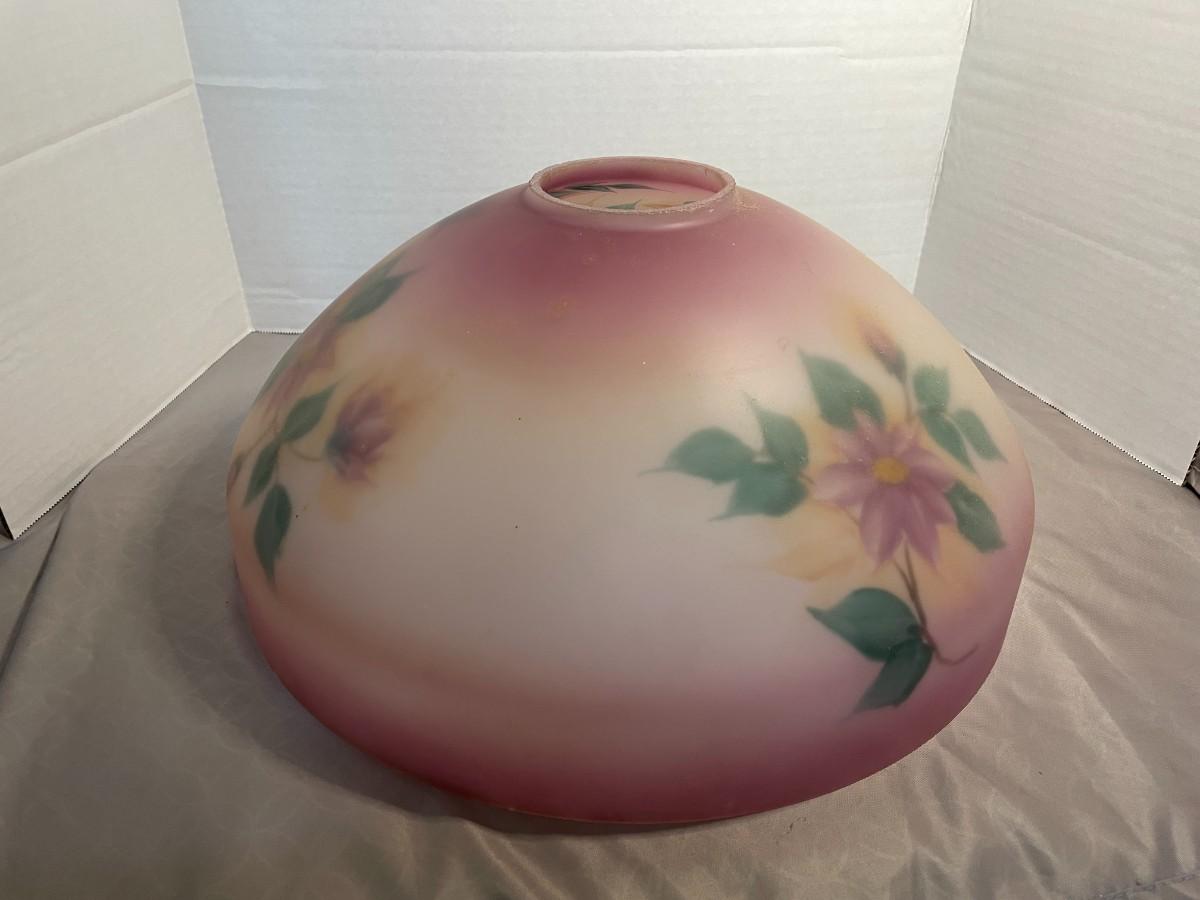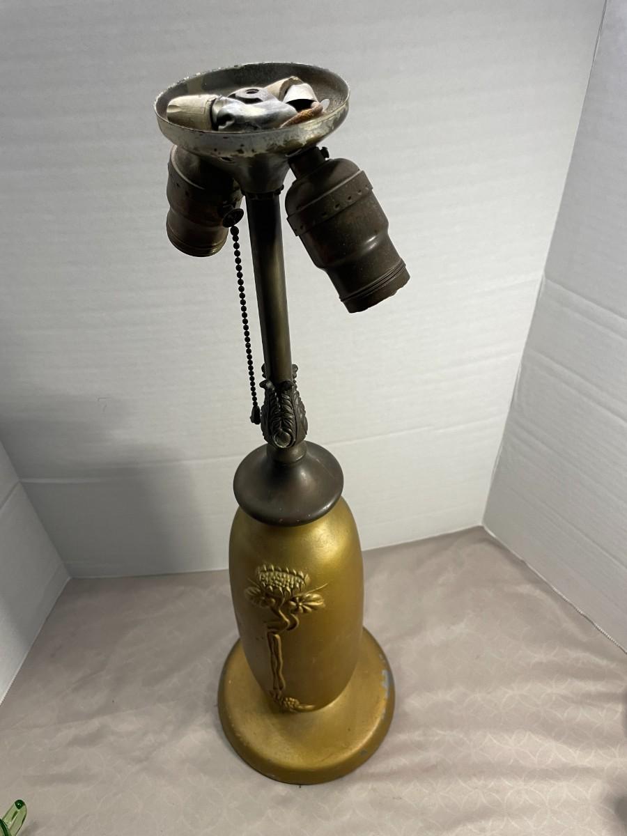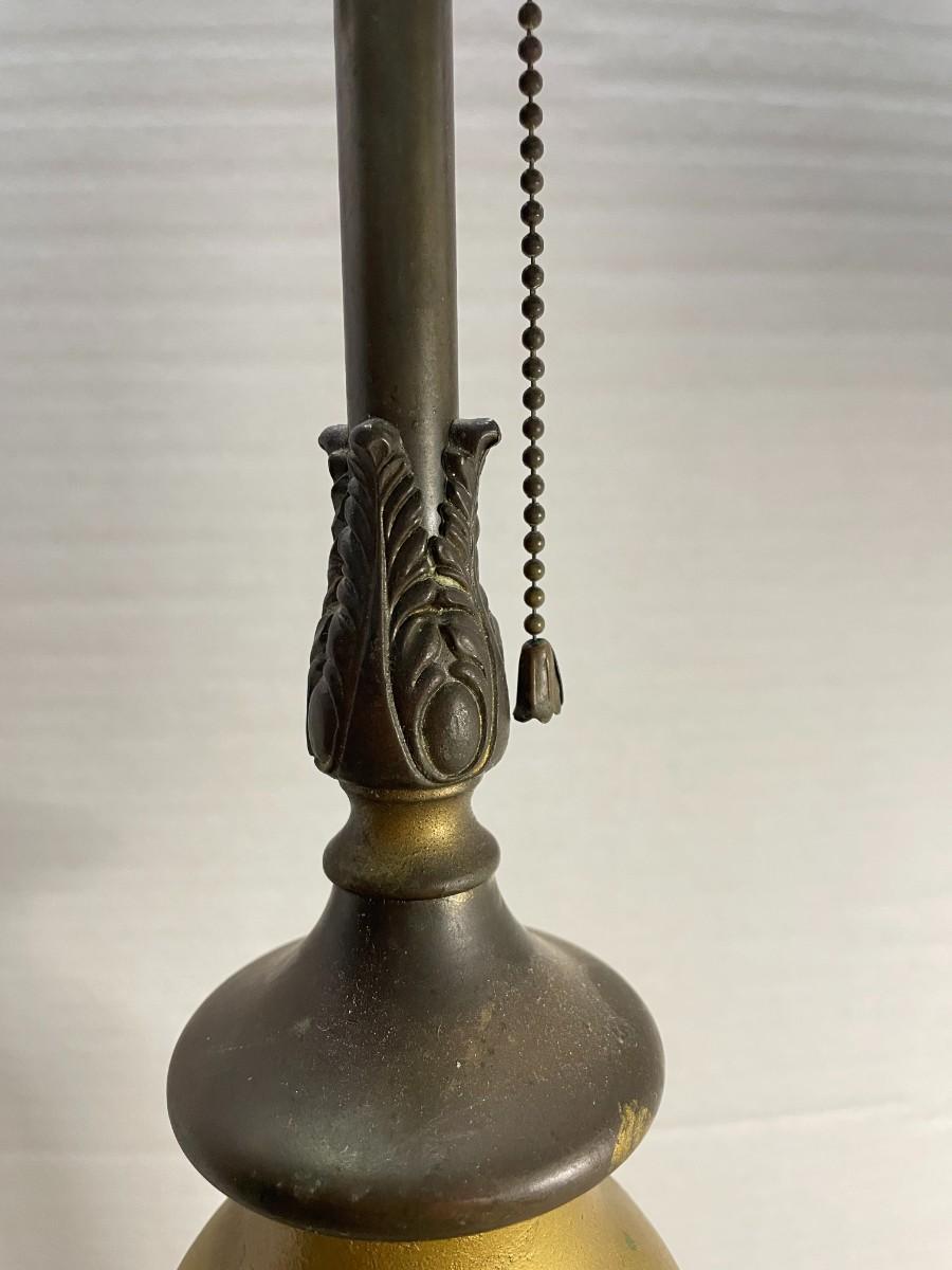 This lamp has a lot of character, but does need a little work. It feels and weighs like it is cast iron or some other type of heavy metal. It is just shy of 23 inches tall and would be worth the effort to restore it! It has a beautiful, large glass shade. This lamp shade is about 15.75 inches in diameter and the center is about 3.25 inches in diameter. It is painted on the inside and is in excellent condition with no issues noted. LOCAL PICK UP ONLY