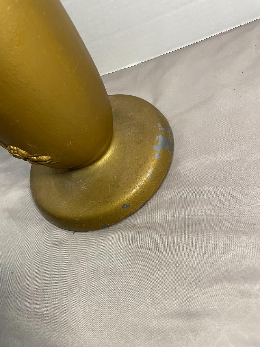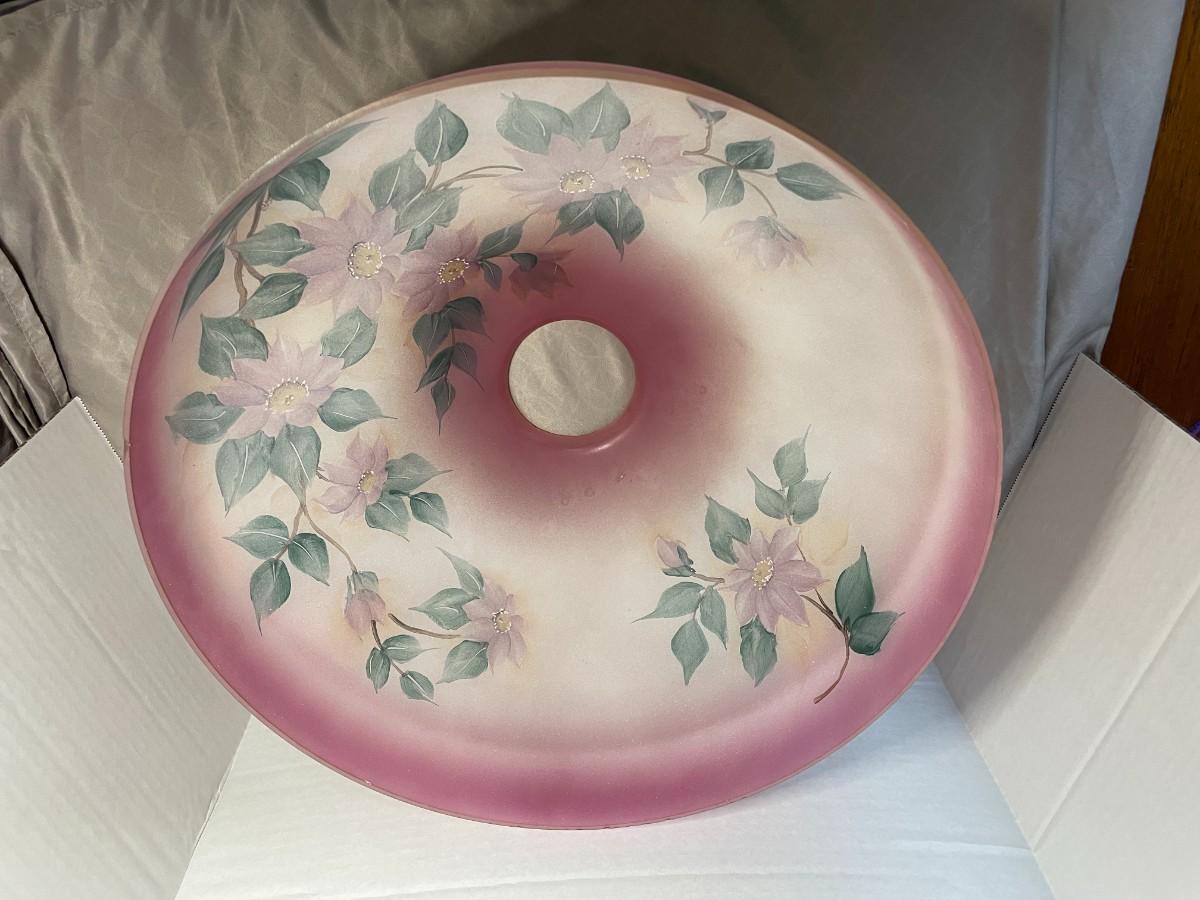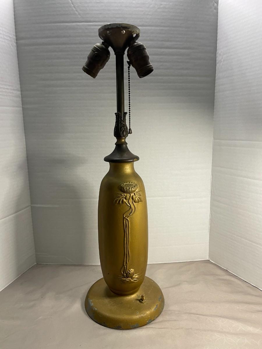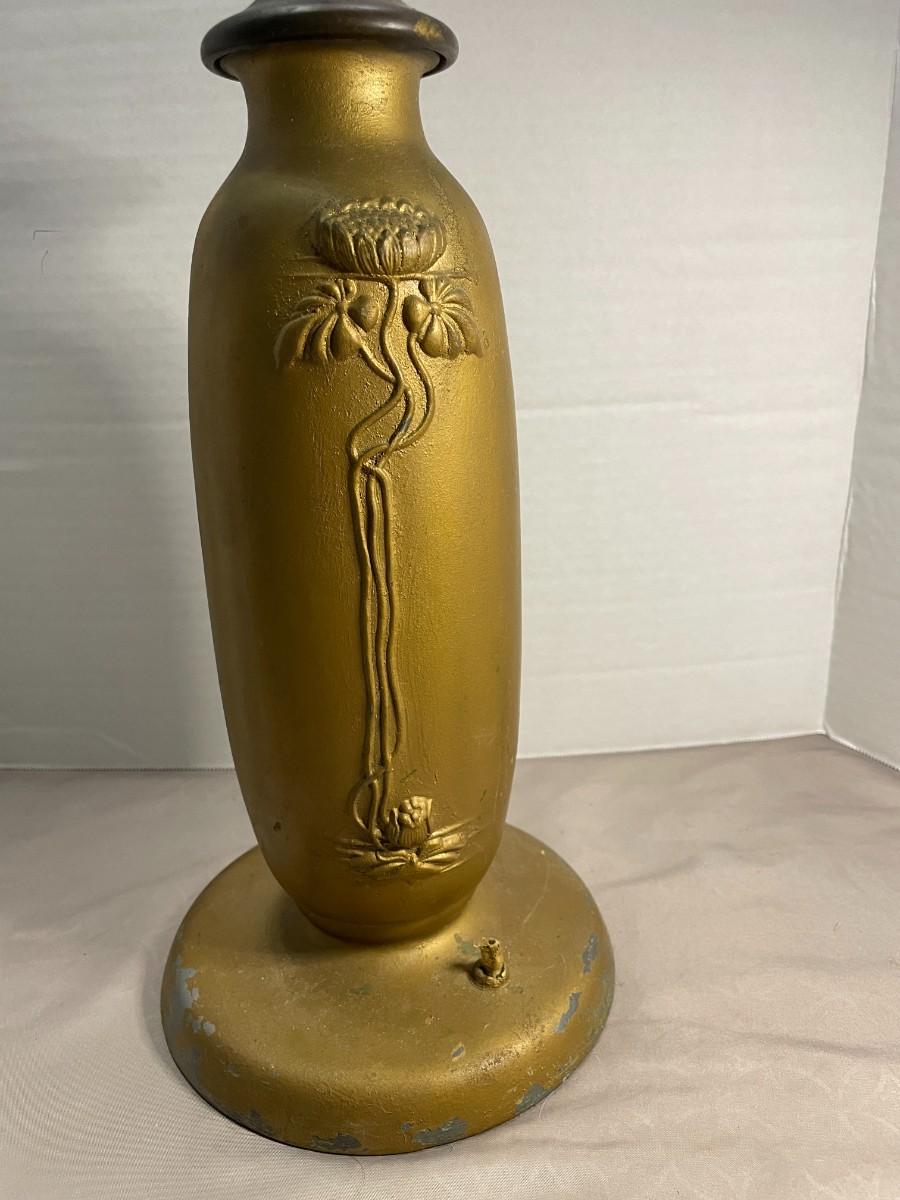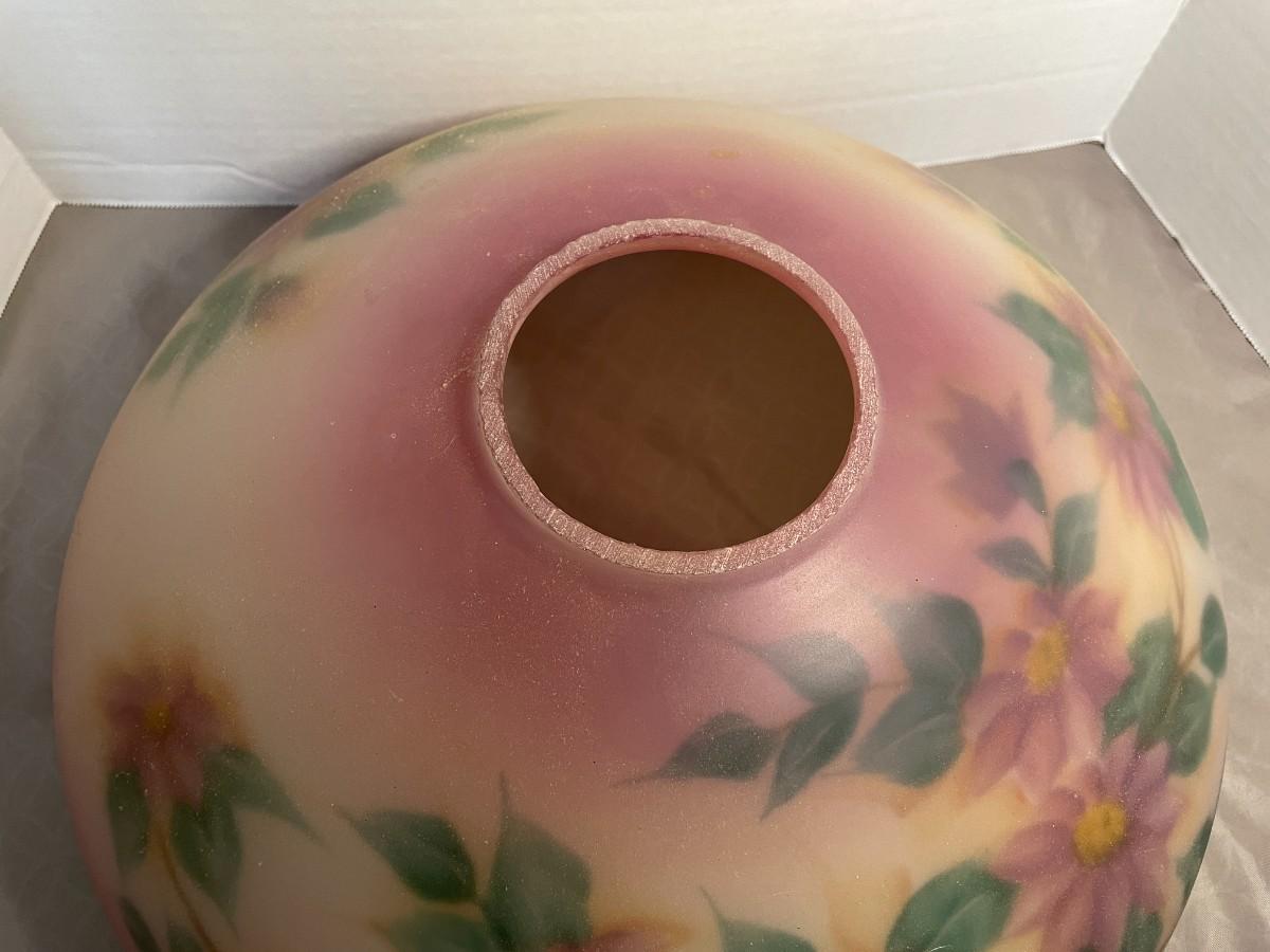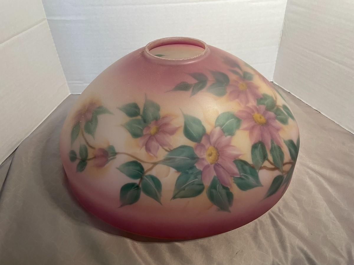 This lamp has a lot of character, but does need a little work. It feels and weighs like it is cast iron or some other type of heavy metal. It is just shy of 23 inches tall and would be worth the effort to restore it! It has a beautiful, large glass shade. This lamp shade is about 15.75 inches in diameter and the center is about 3.25 inches in diameter. It is painted on the inside and is in excellent condition with no issues noted. LOCAL PICK UP ONLY