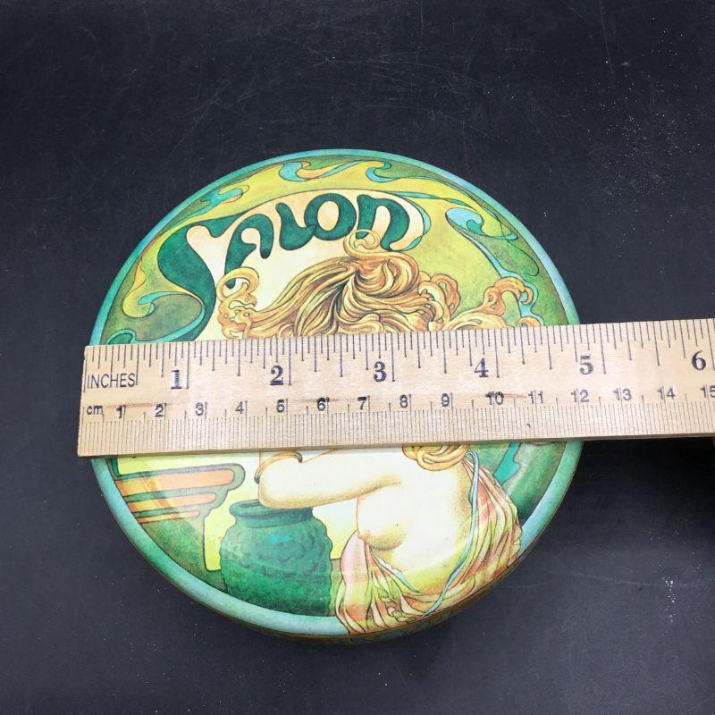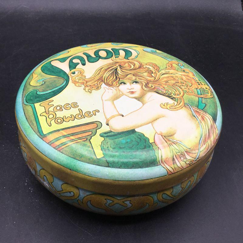 Vintage art nouveau style tin. Salon Face Powder. Features a topless woman with flowy hair. About 5" size. Good condition.