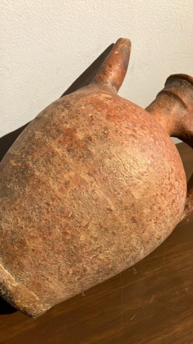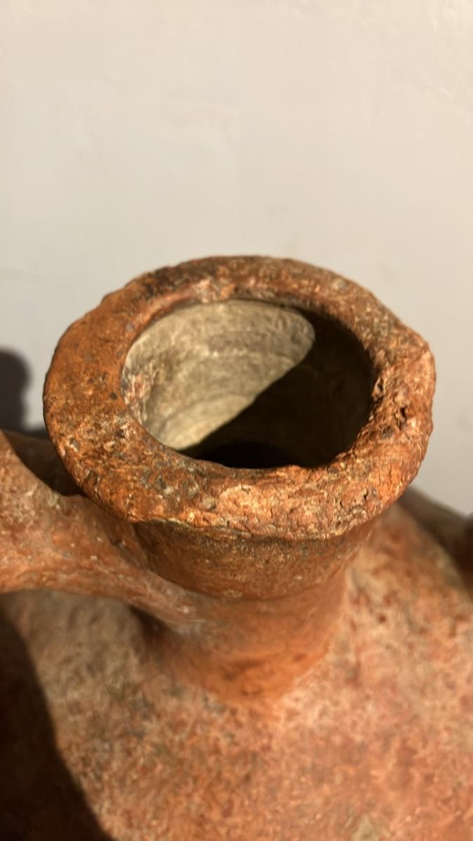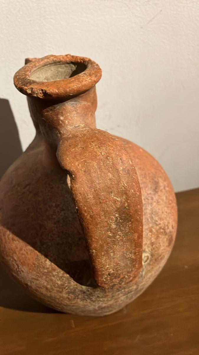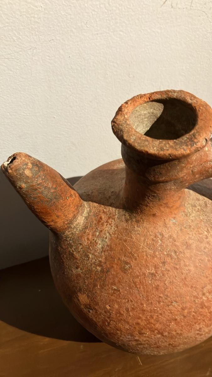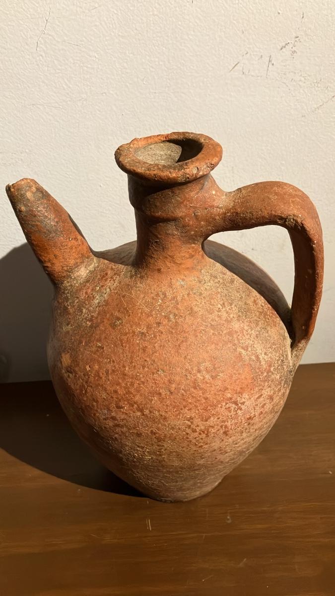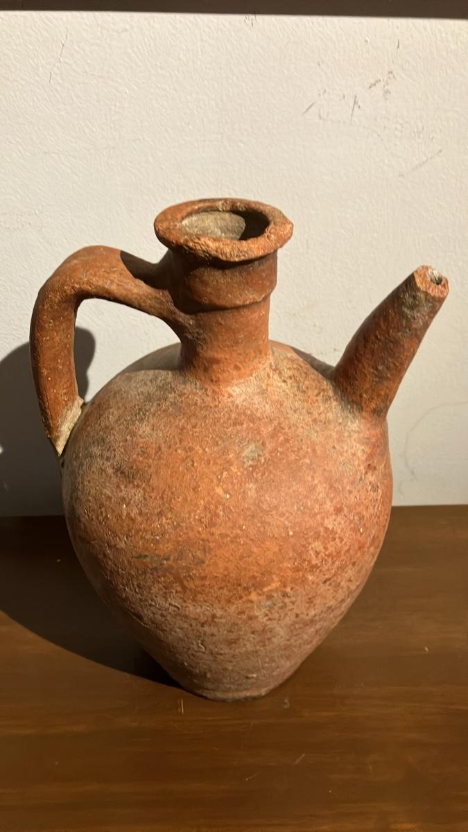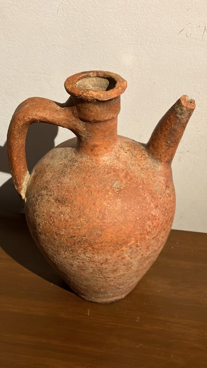 This attractive antique terracotta vessel, measuring approximately 11 inches in height and 7 inches at its widest point, features a piriform (pear-shaped) body with a short cylindrical neck and everted rim for filling, a prominent curved side spout for controlled pouring, and a sturdy strap handle connecting the neck to the shoulder. The plain reddish-orange terracotta body exhibits a natural earthy patina with areas of lighter encrustation and mineralization, consistent with age and burial or long-term soil exposure, while the interior of the neck shows authentic aged buildup. Remarkably well-preserved for its era, the piece displays no major cracks, repairs, or significant chipping—only minor surface wear and small rim nicks typical of functional pottery.