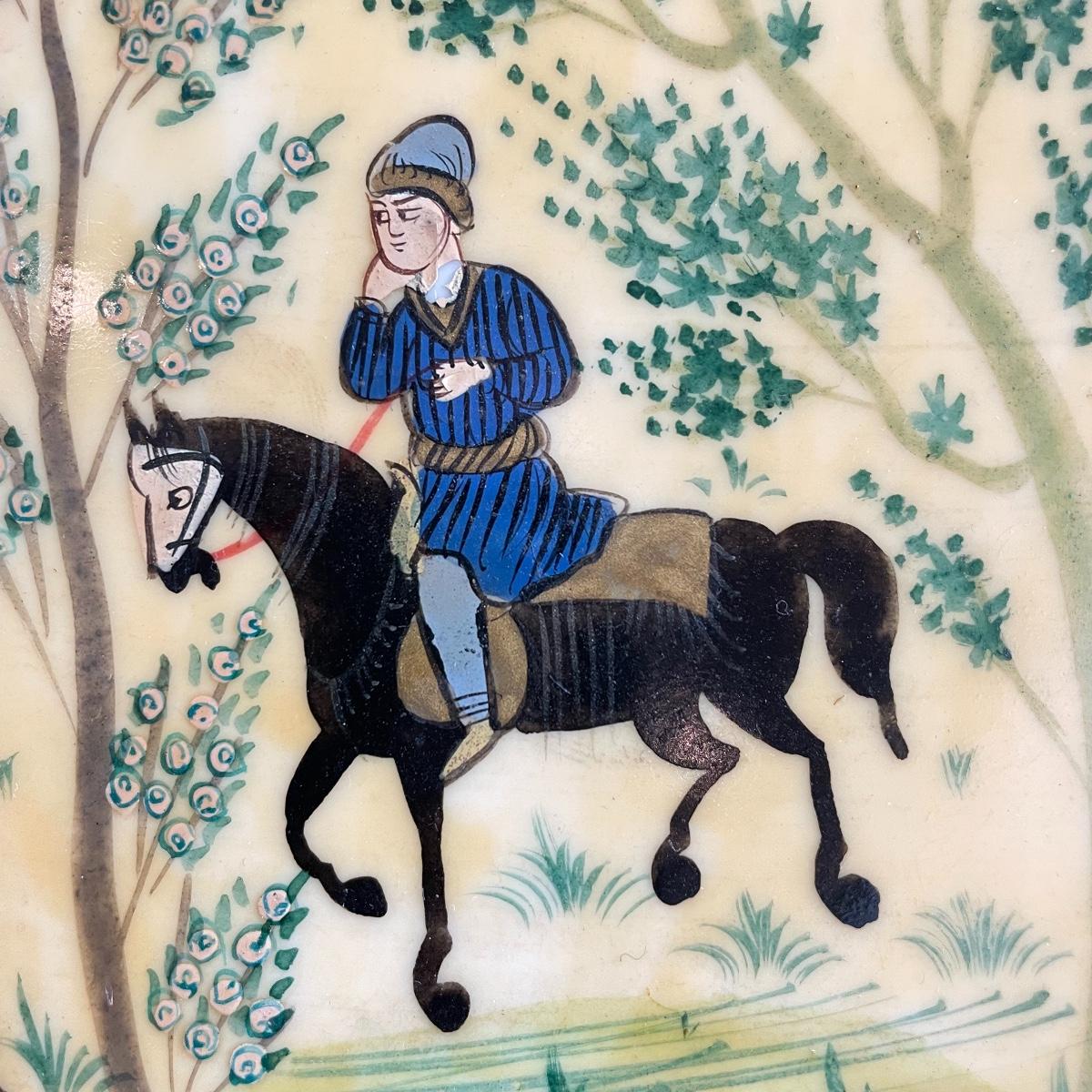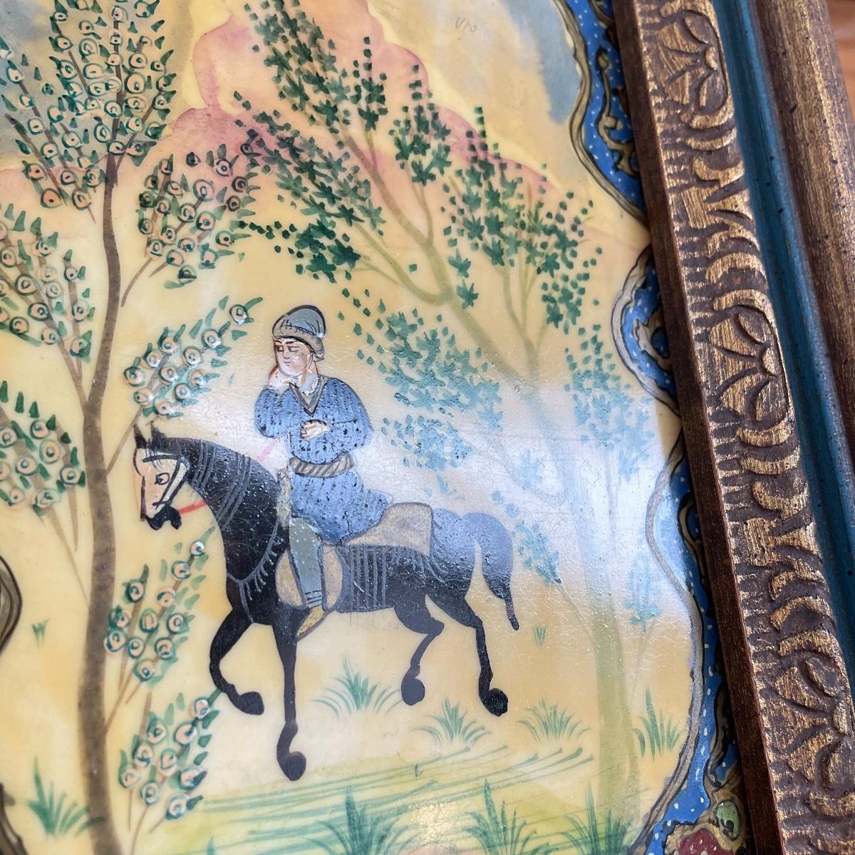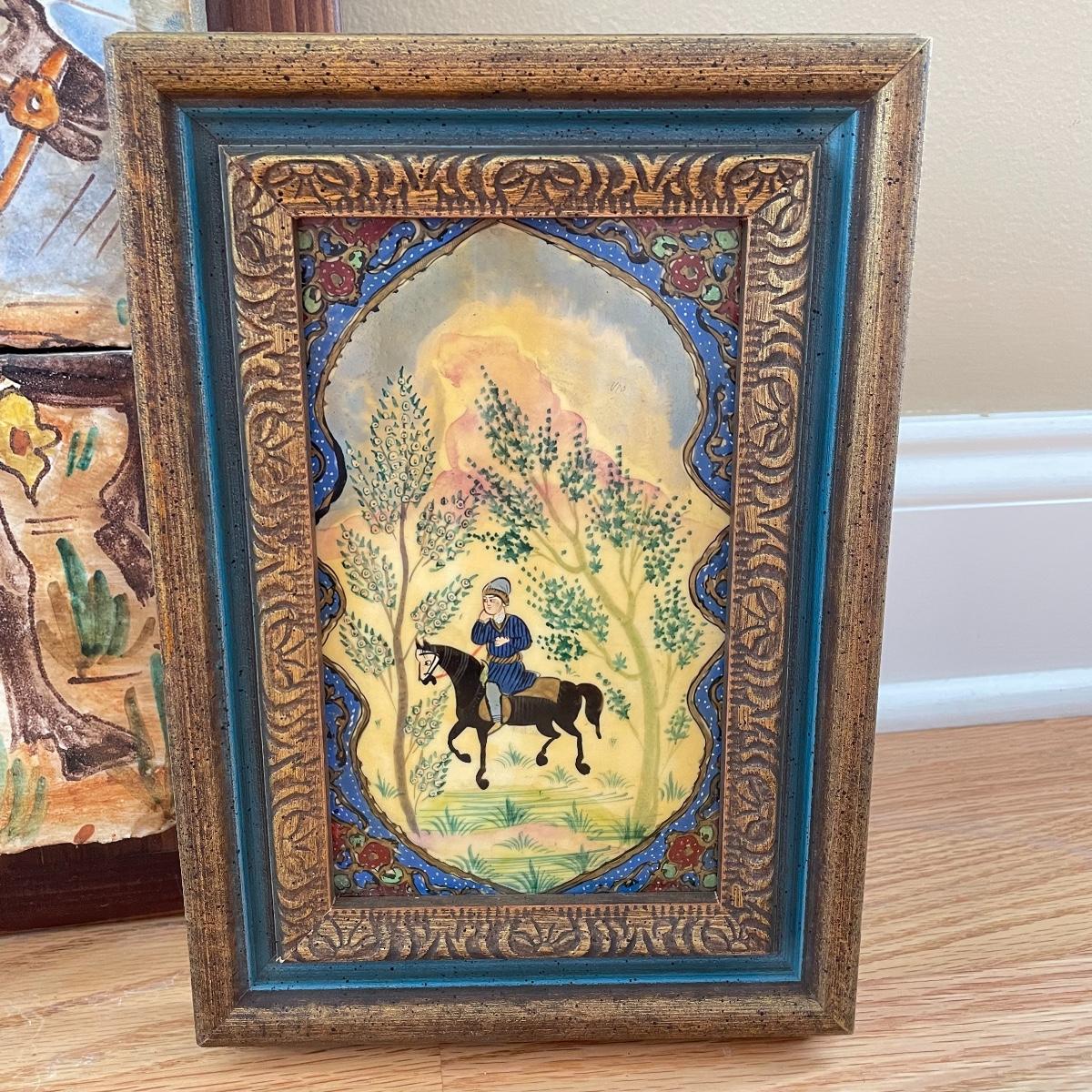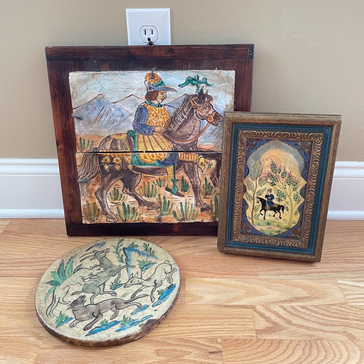 Royal portrait painted on two slabs that appear to be concrete and held on a 15”sq solid wood frame by iron nails. Circular art is 9.75”d, made of a heavy resin and shows crazing in the glaze. Lastly, a hand painted art in a 7.5” x 11” wooden frame. Art is possibly painted on a plastic-like paper with a barely noticeable chip on the rider’s neck. Under the tape on the back states “Signed in Persian” but we did not locate signature on the framed piece. Shipping available. Please call UPS with dimensions at 828-252-6930 for a shipping quote prior to bidding.