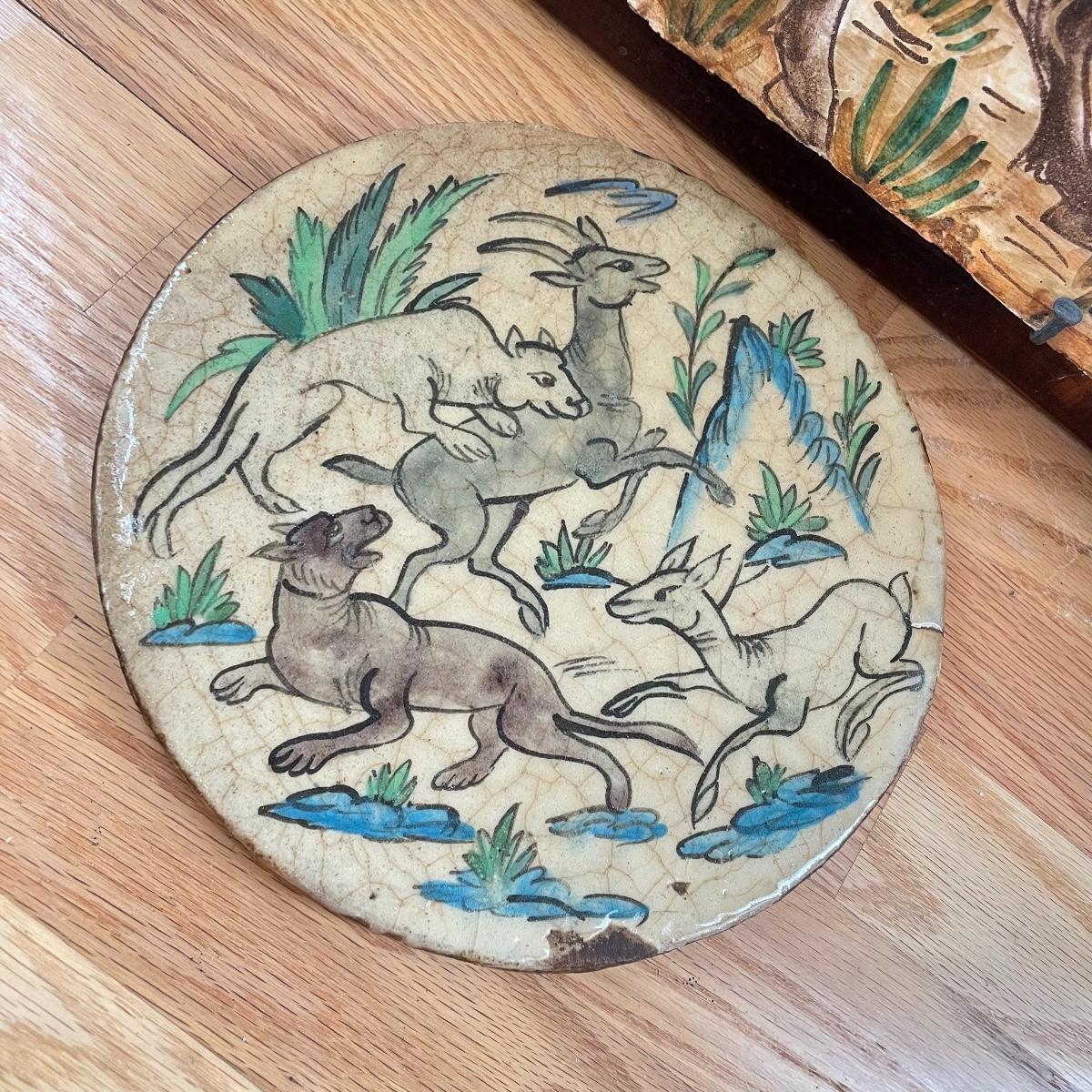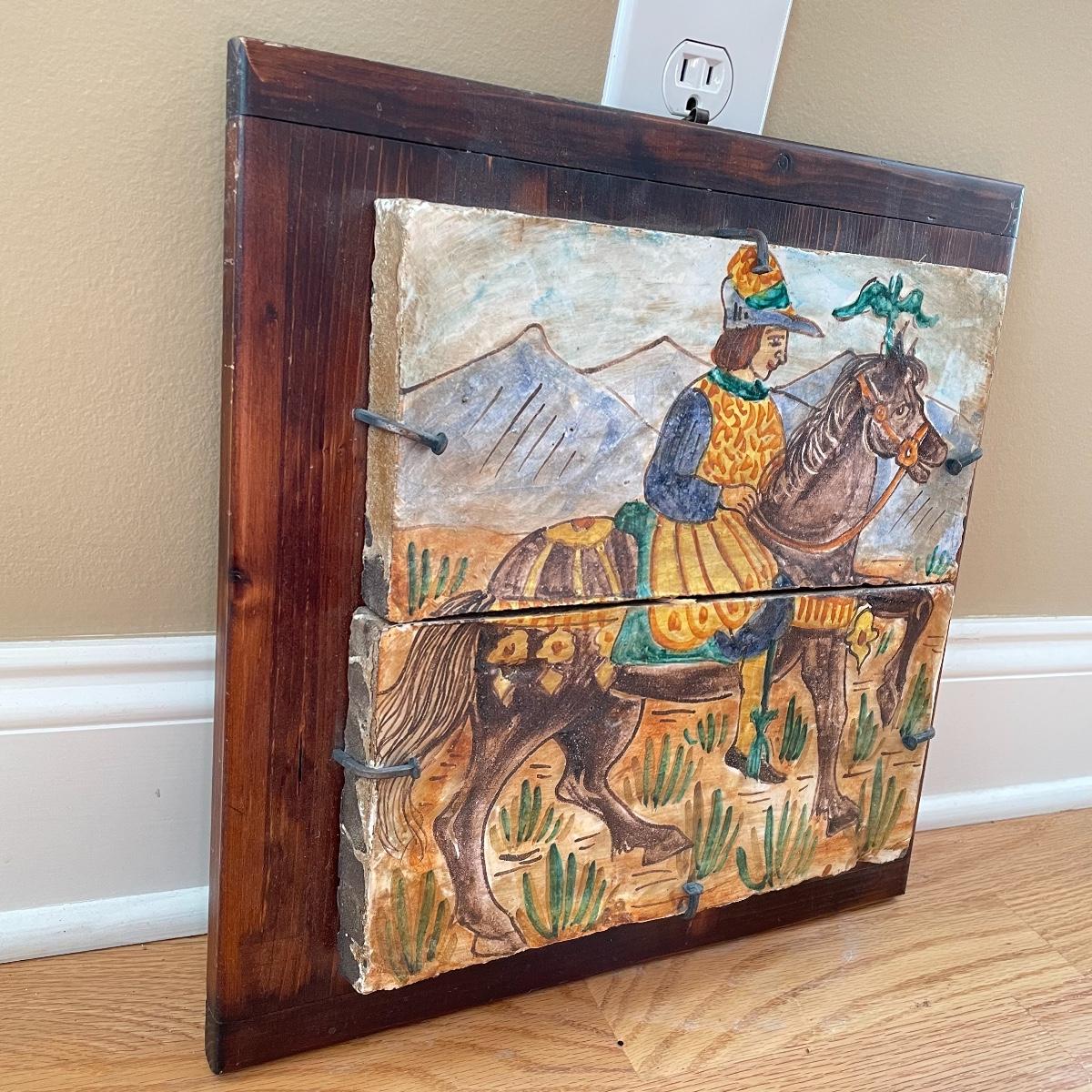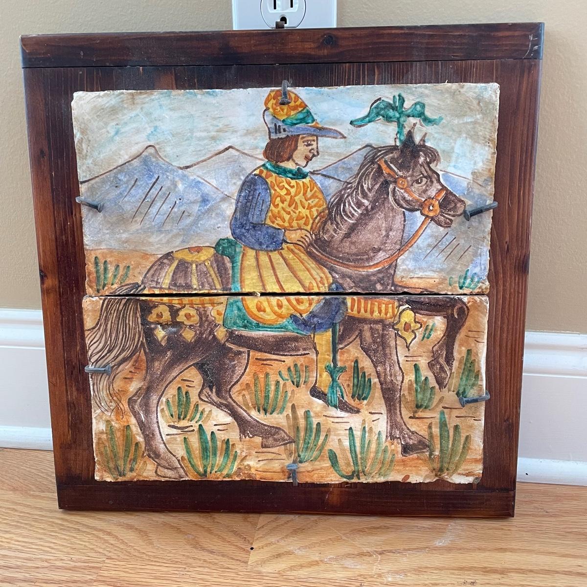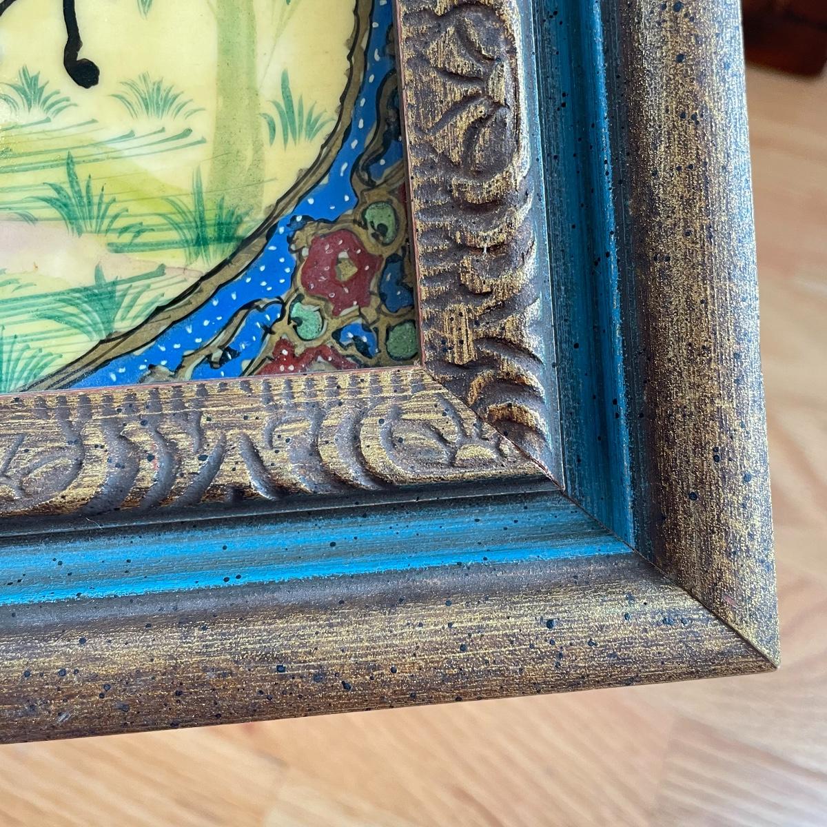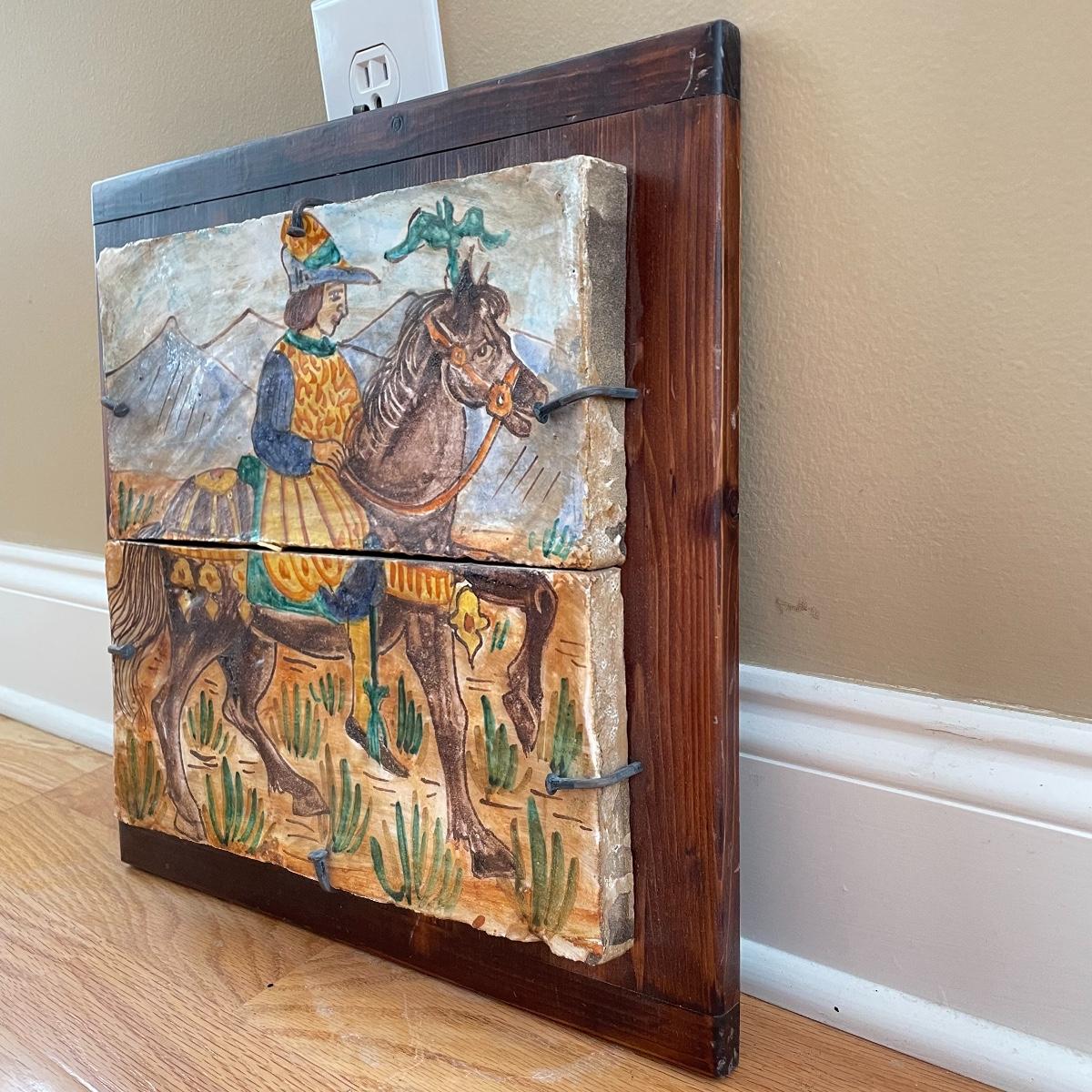 Royal portrait painted on two slabs that appear to be concrete and held on a 15”sq solid wood frame by iron nails. Circular art is 9.75”d, made of a heavy resin and shows crazing in the glaze. Lastly, a hand painted art in a 7.5” x 11” wooden frame. Art is possibly painted on a plastic-like paper with a barely noticeable chip on the rider’s neck. Under the tape on the back states “Signed in Persian” but we did not locate signature on the framed piece. Shipping available. Please call UPS with dimensions at 828-252-6930 for a shipping quote prior to bidding.