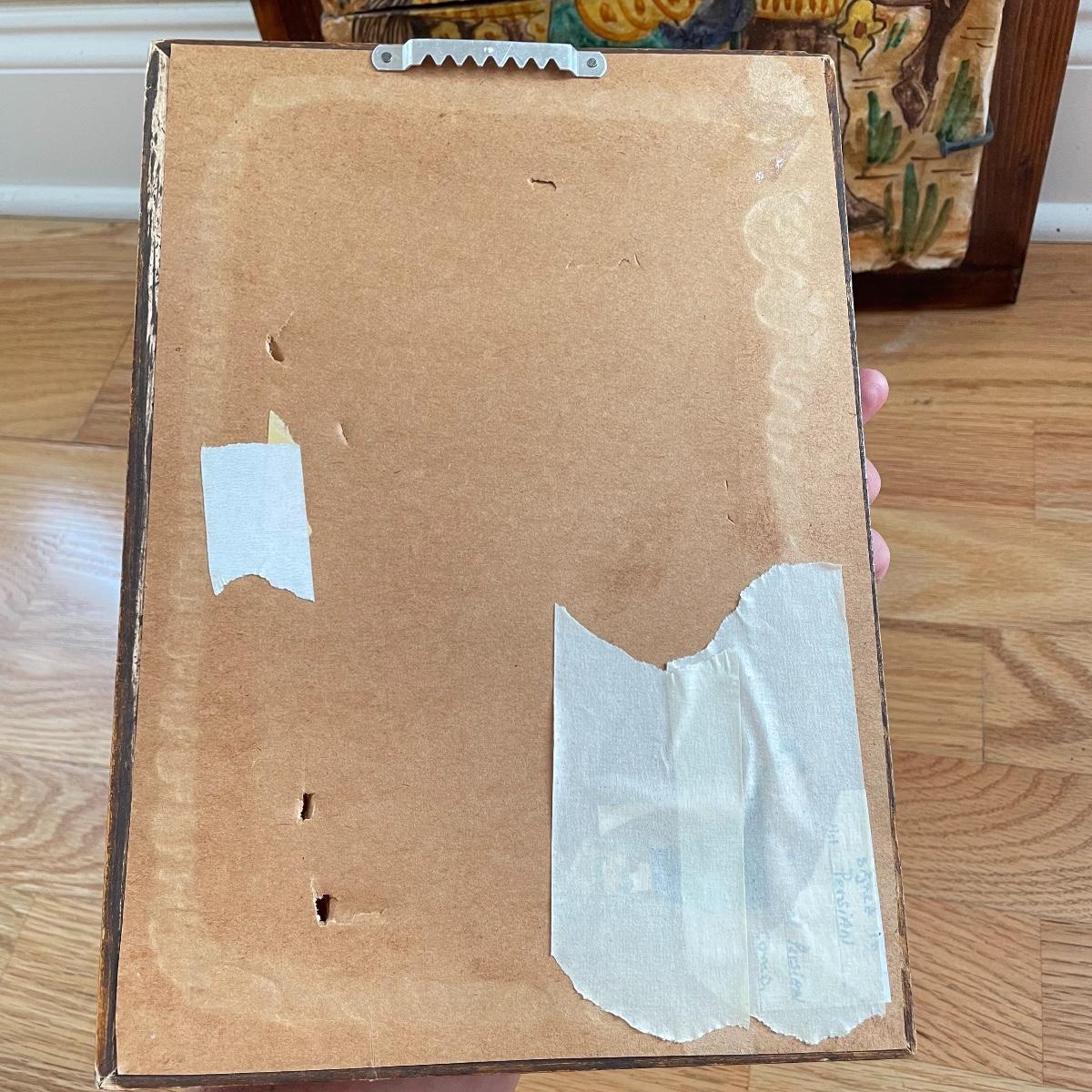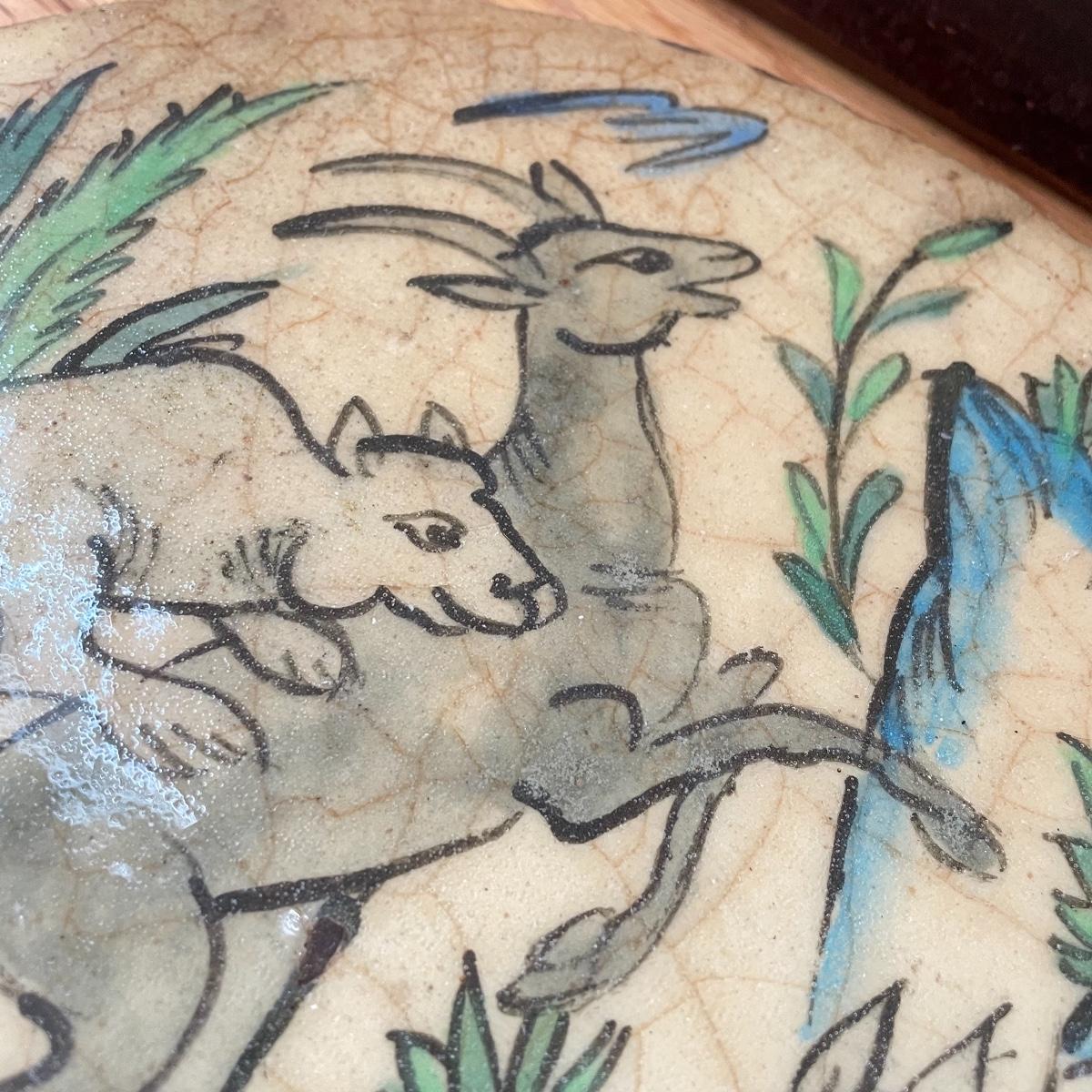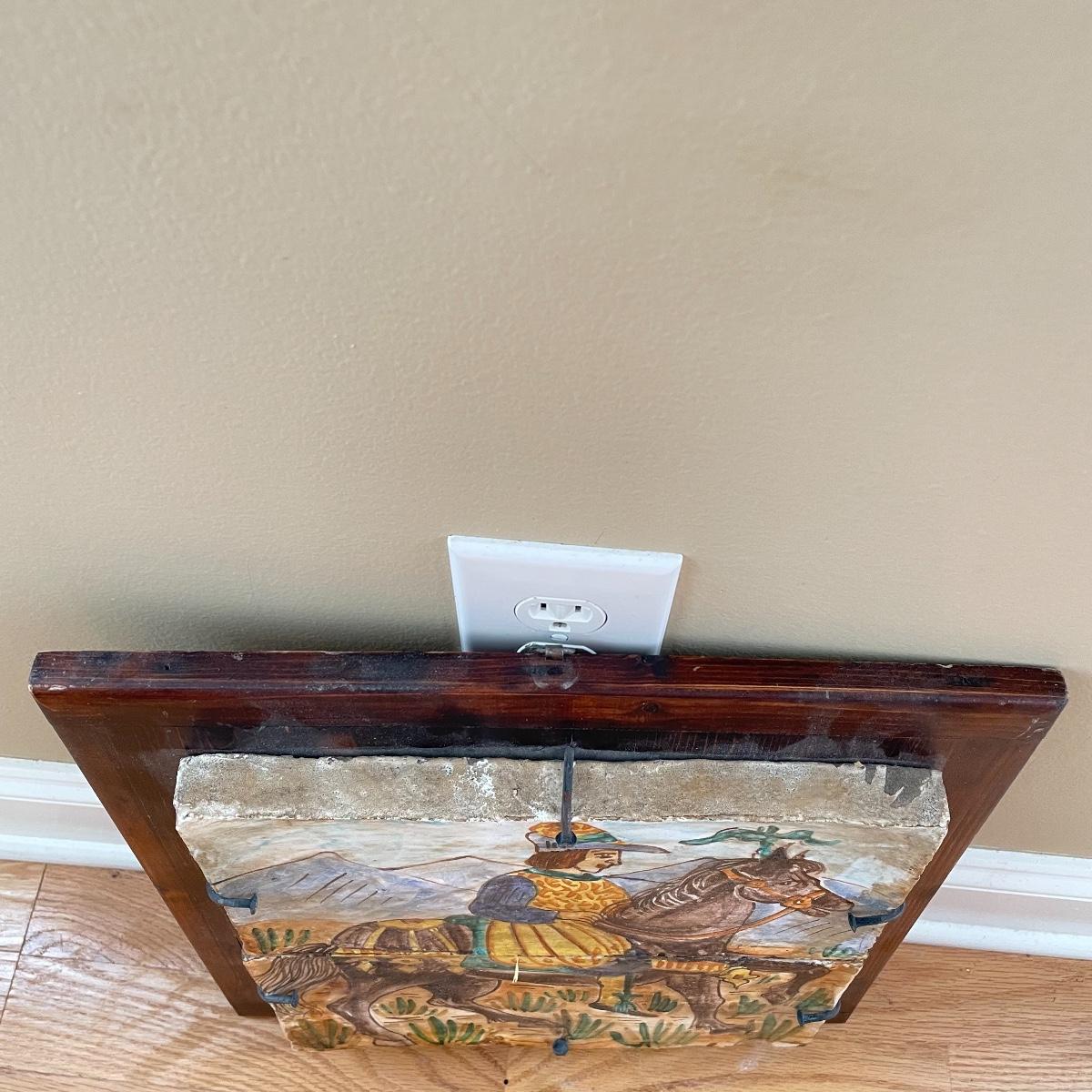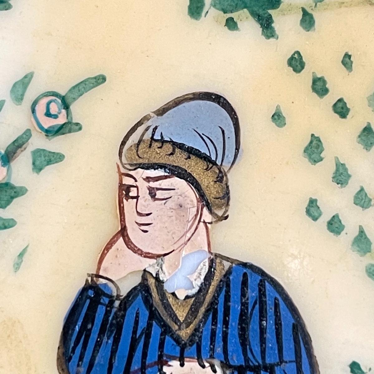 Royal portrait painted on two slabs that appear to be concrete and held on a 15”sq solid wood frame by iron nails. Circular art is 9.75”d, made of a heavy resin and shows crazing in the glaze. Lastly, a hand painted art in a 7.5” x 11” wooden frame. Art is possibly painted on a plastic-like paper with a barely noticeable chip on the rider’s neck. Under the tape on the back states “Signed in Persian” but we did not locate signature on the framed piece. Shipping available. Please call UPS with dimensions at 828-252-6930 for a shipping quote prior to bidding.