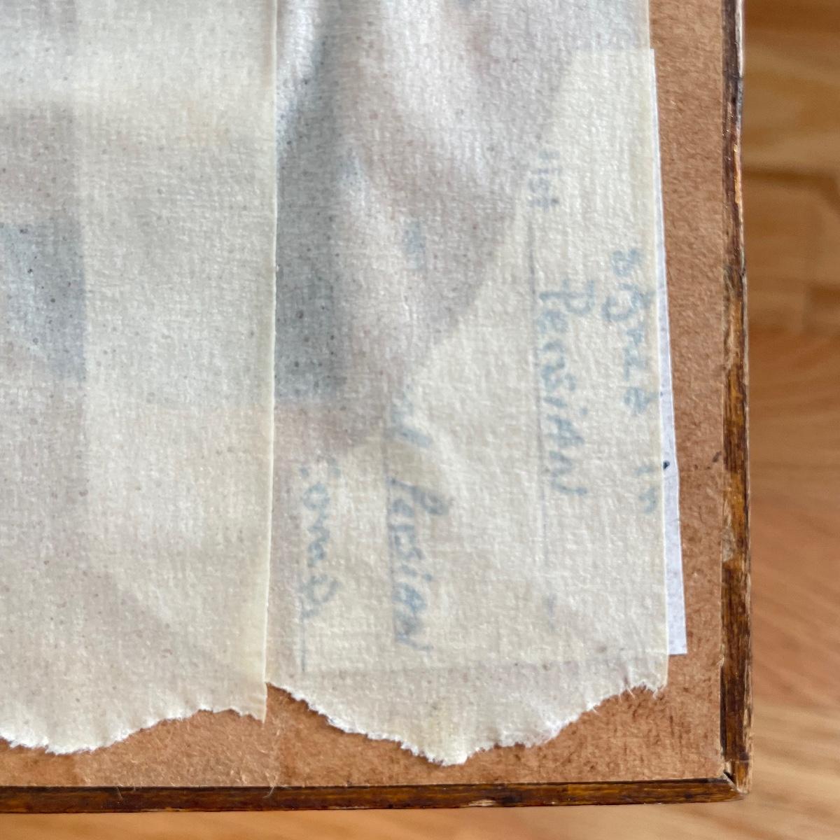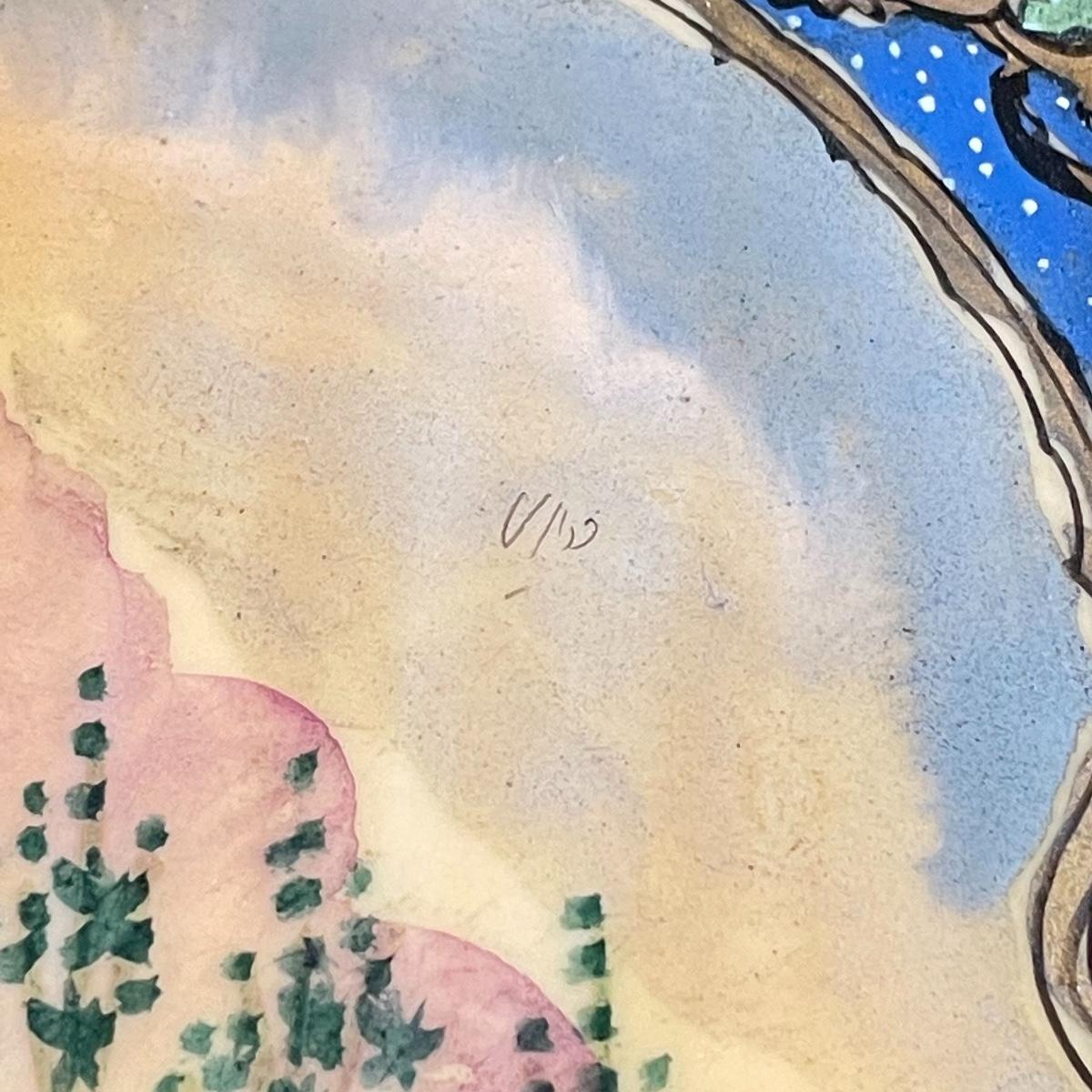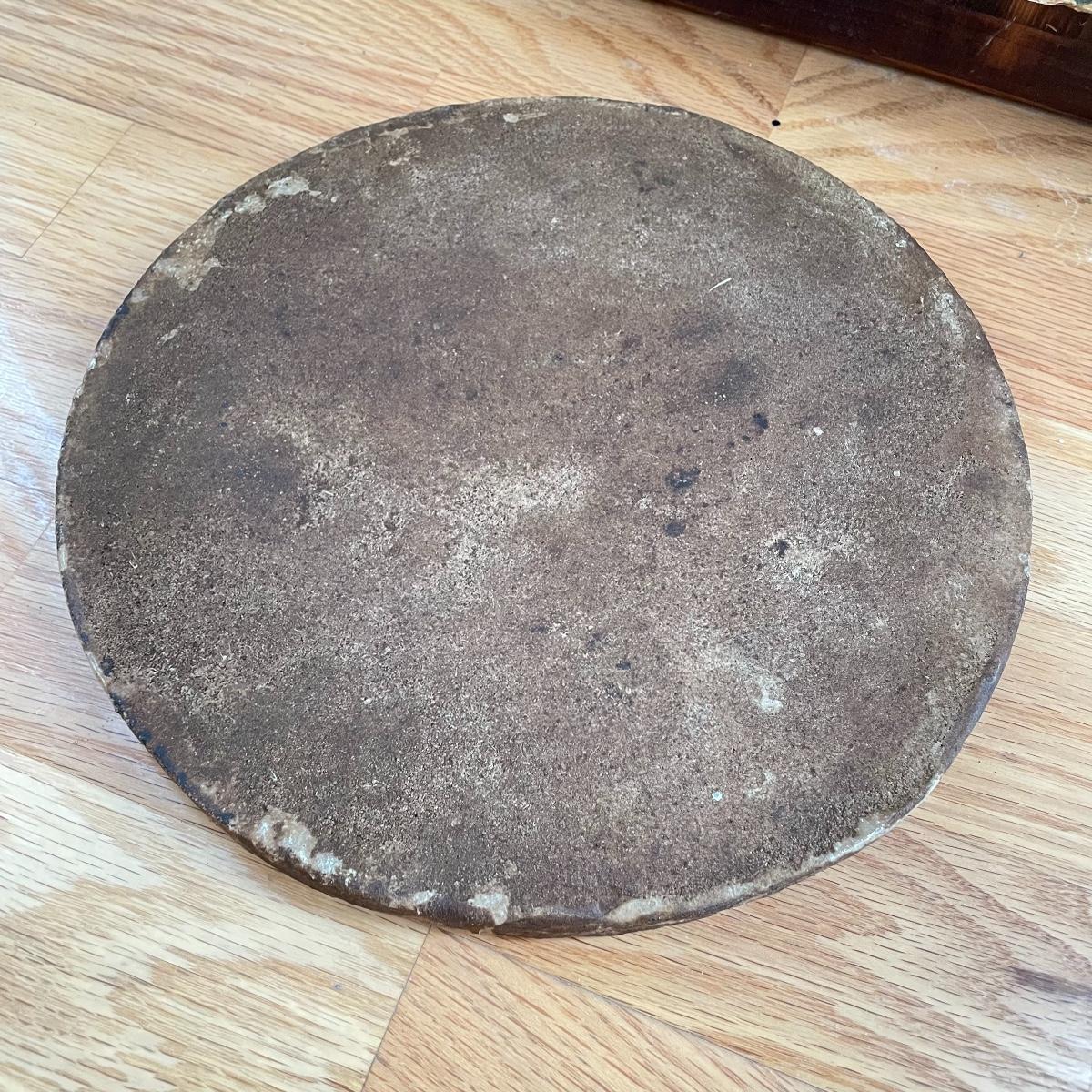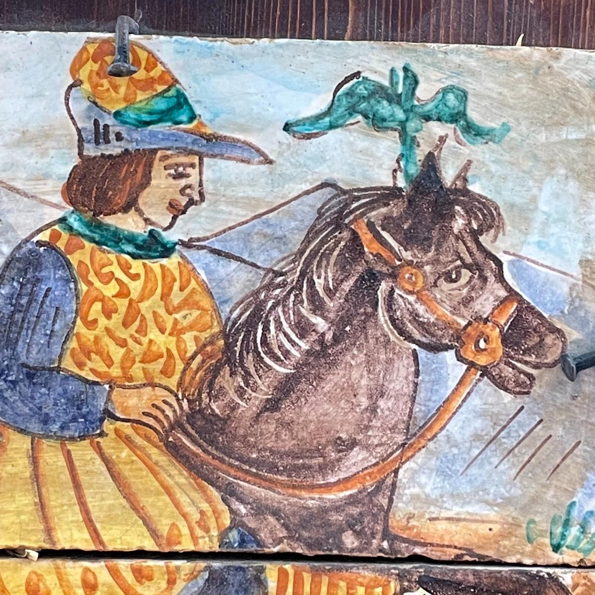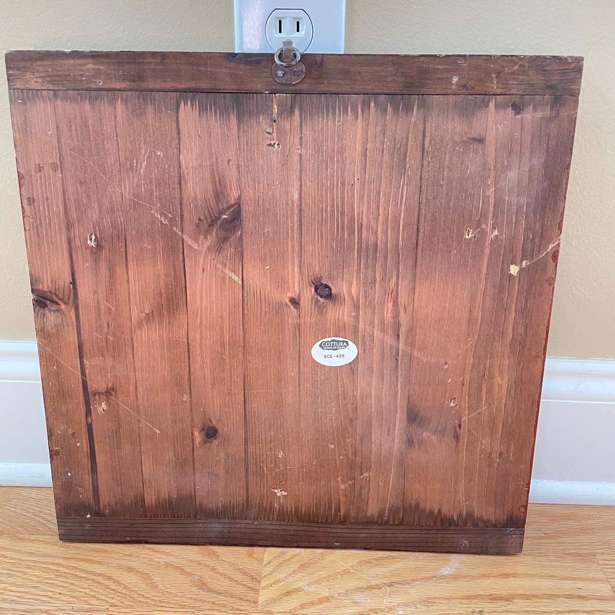 Royal portrait painted on two slabs that appear to be concrete and held on a 15”sq solid wood frame by iron nails. Circular art is 9.75”d, made of a heavy resin and shows crazing in the glaze. Lastly, a hand painted art in a 7.5” x 11” wooden frame. Art is possibly painted on a plastic-like paper with a barely noticeable chip on the rider’s neck. Under the tape on the back states “Signed in Persian” but we did not locate signature on the framed piece. Shipping available. Please call UPS with dimensions at 828-252-6930 for a shipping quote prior to bidding.