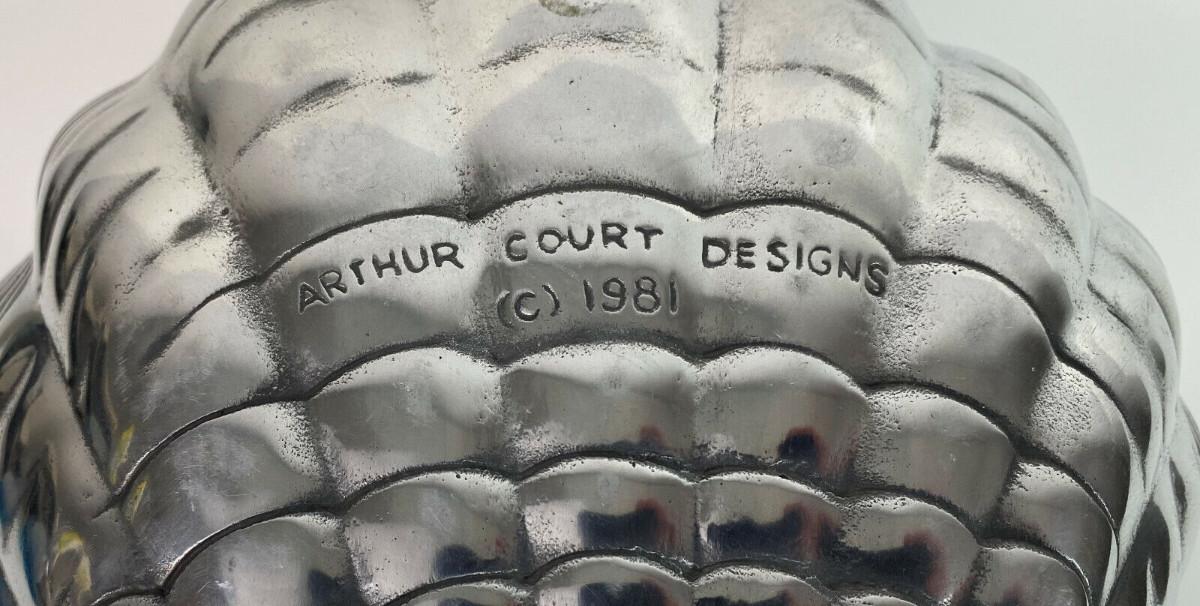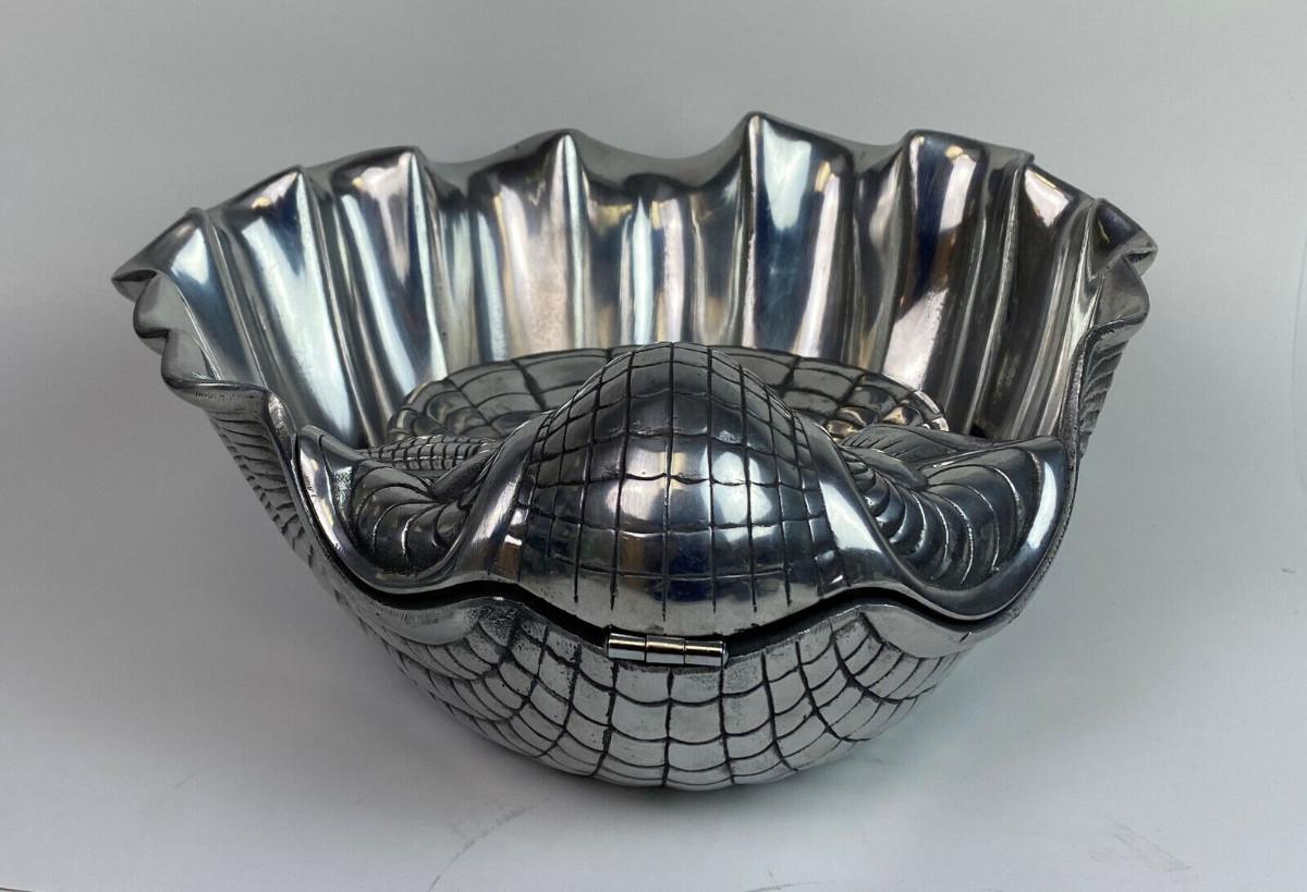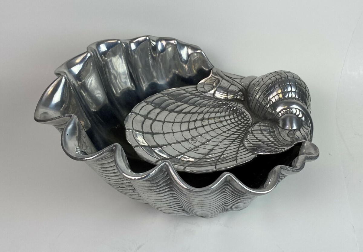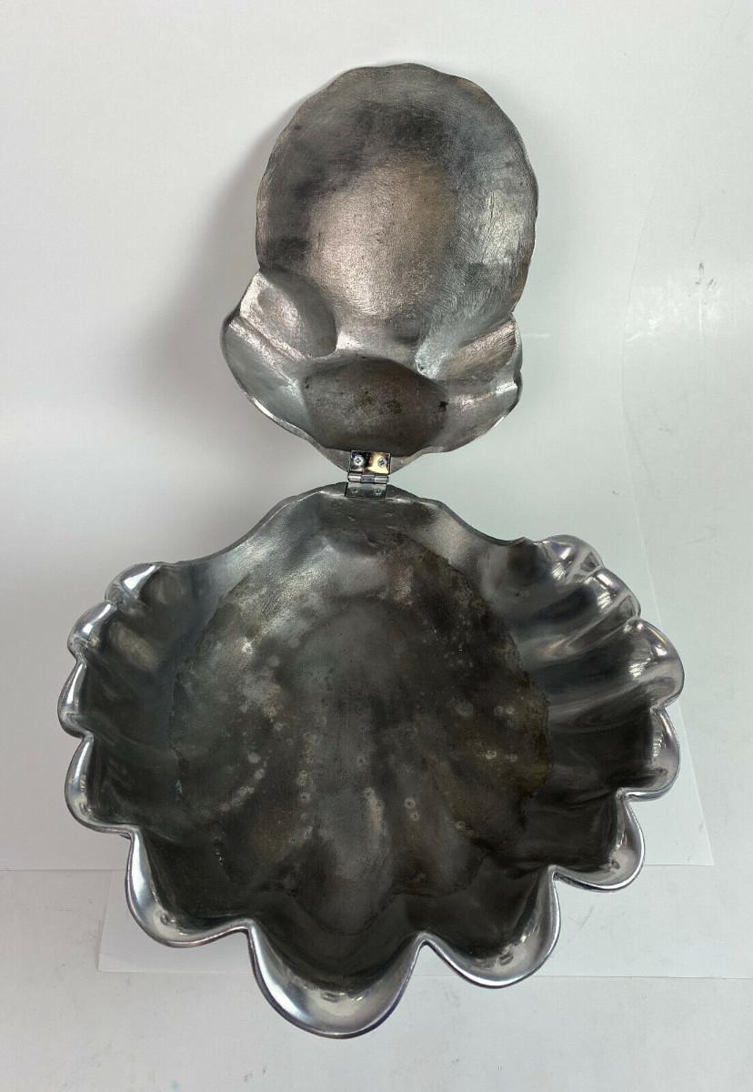 fanciful design from Arthur Court..a hinged chip and dip clam shell server in polished sand-cast aluminum...an elegant addition to your table...from 1981...Excellent condition...Lightest use...Measures 12 x 11.25 x 5.25".
