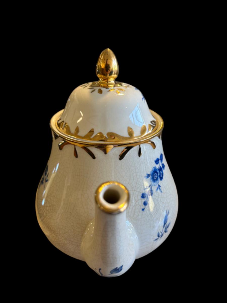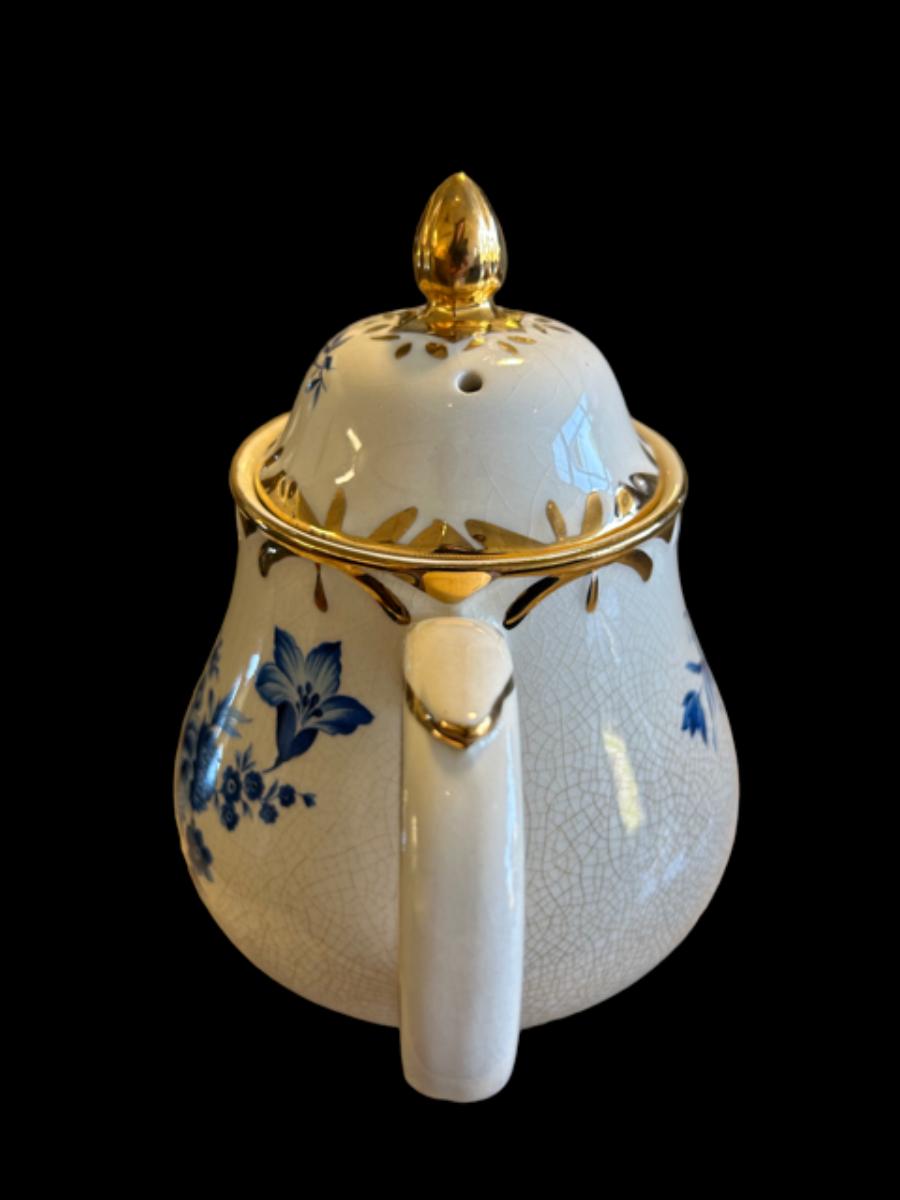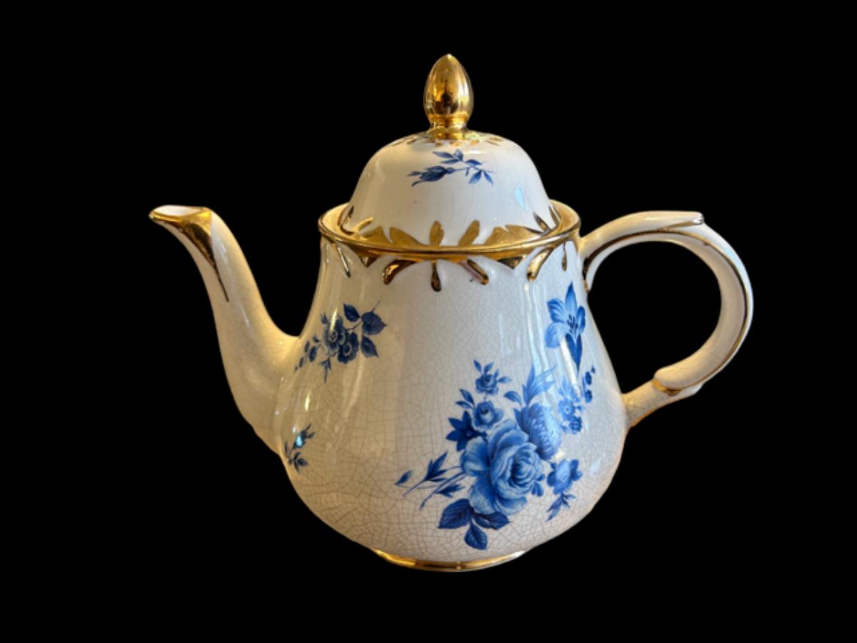 Vintage Arthur Wood Teapot fine china blue floral white gold trim. Manufactured in England. Good condition, moderate crazing.
