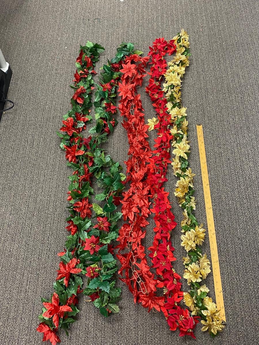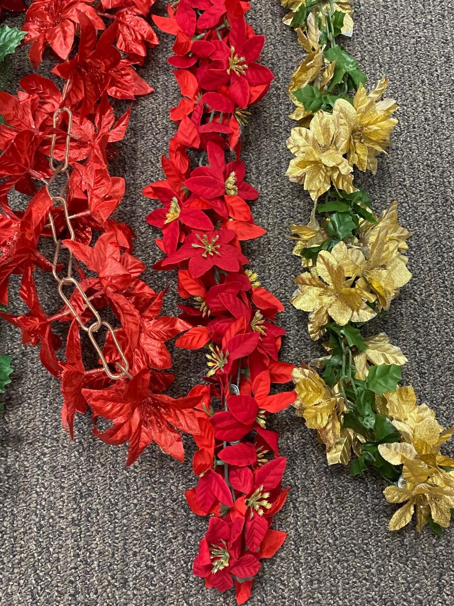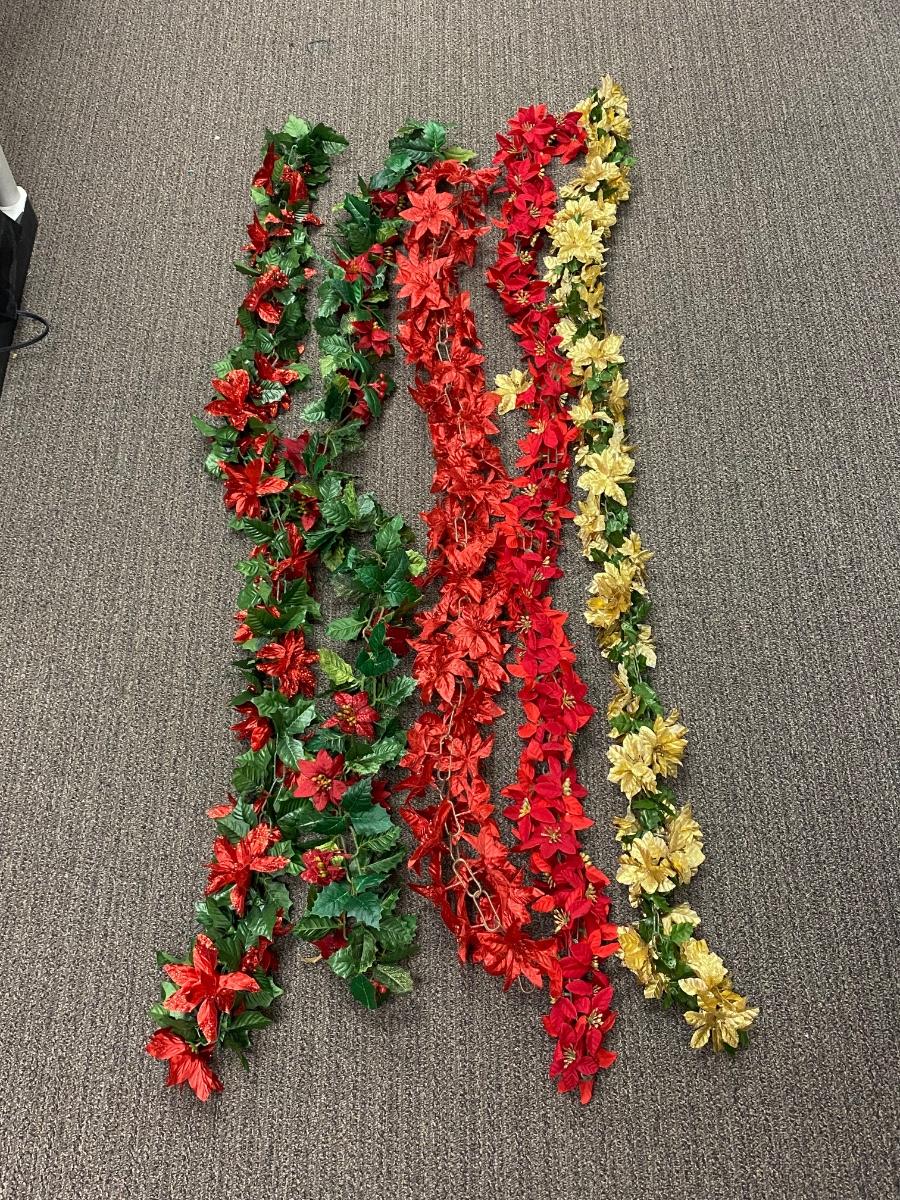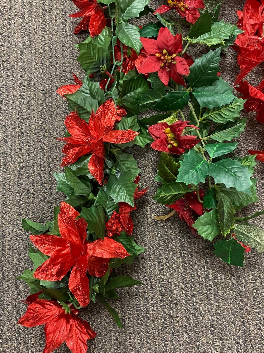 Vintage artificial poinsettia Christmas garland. Different colors, multiple lengths.