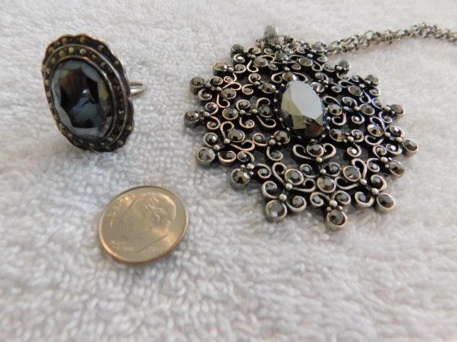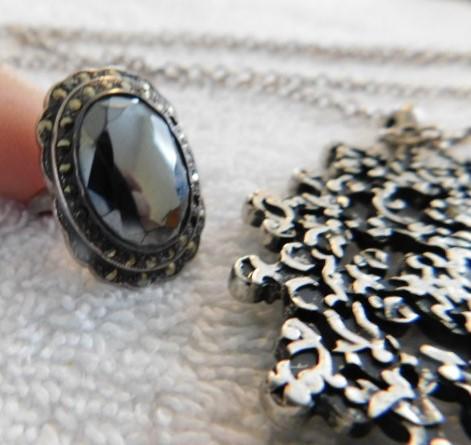 Vintage Artisan Pendant with Marquise Black Gem and Sterling Oval Gem Ring