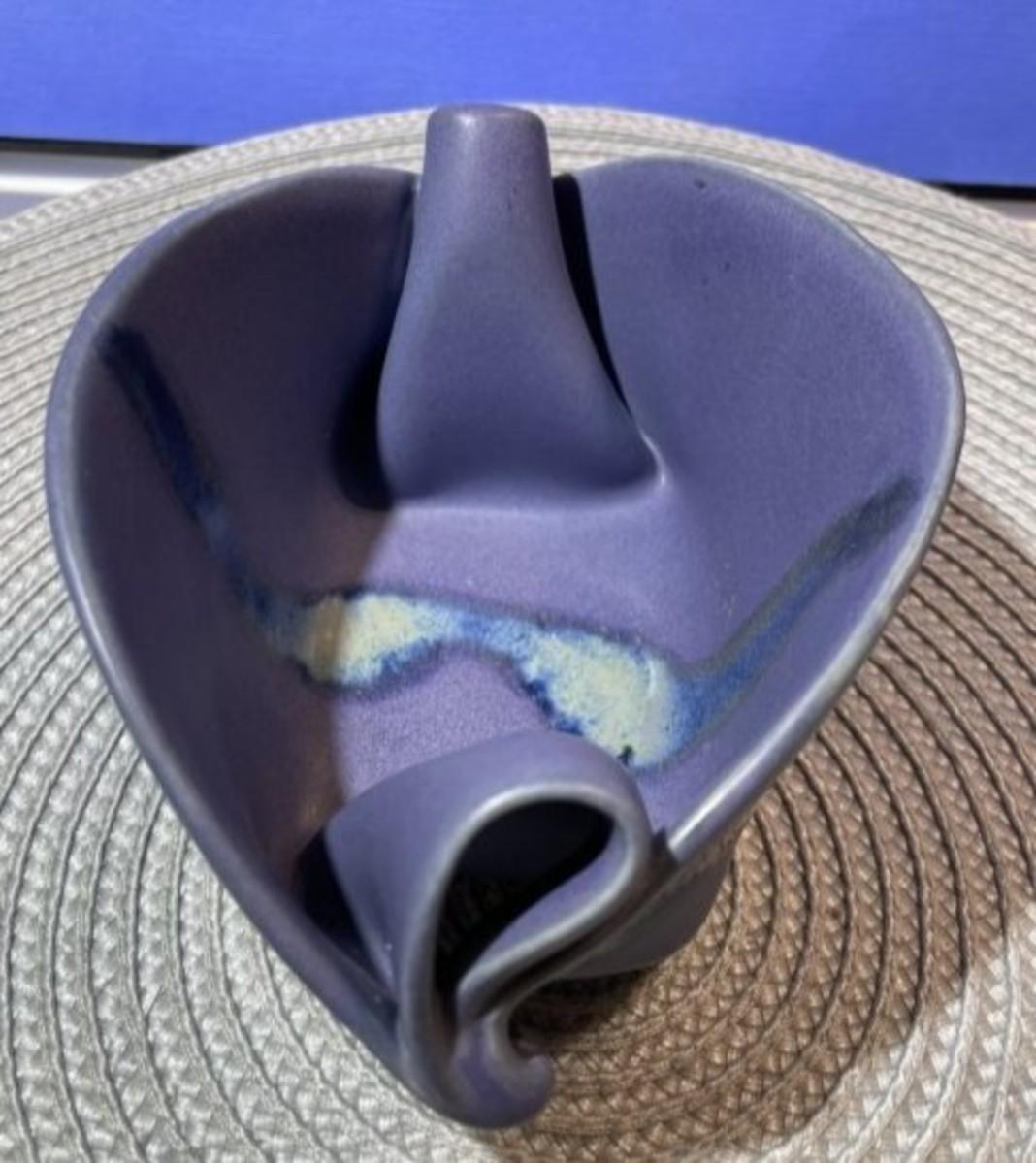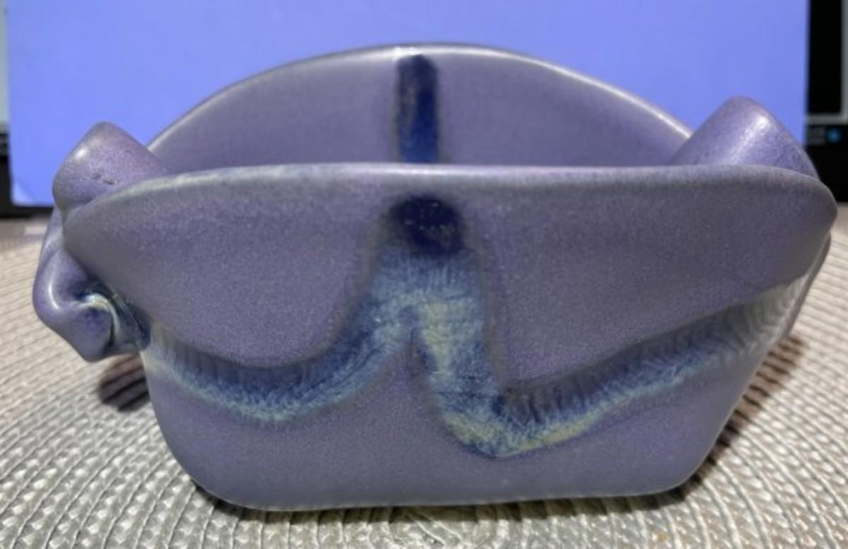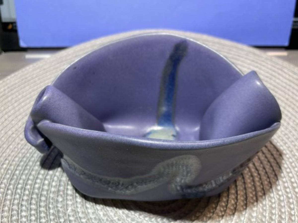 VINTAGE ARTIST SIGNED HILBORN BLUE/PURPLE GLAZED FANCY MID CENTURY STYLE PINCH POTTERY BOWL 6" X 4" IN VG PREOWNED CONDITION. $10 DOMESTIC SHIPPING.