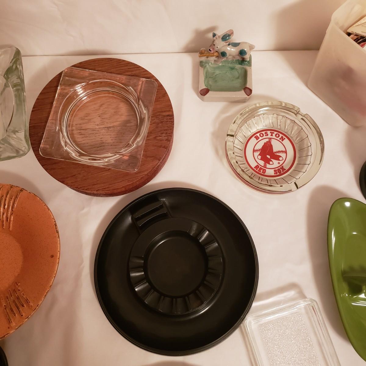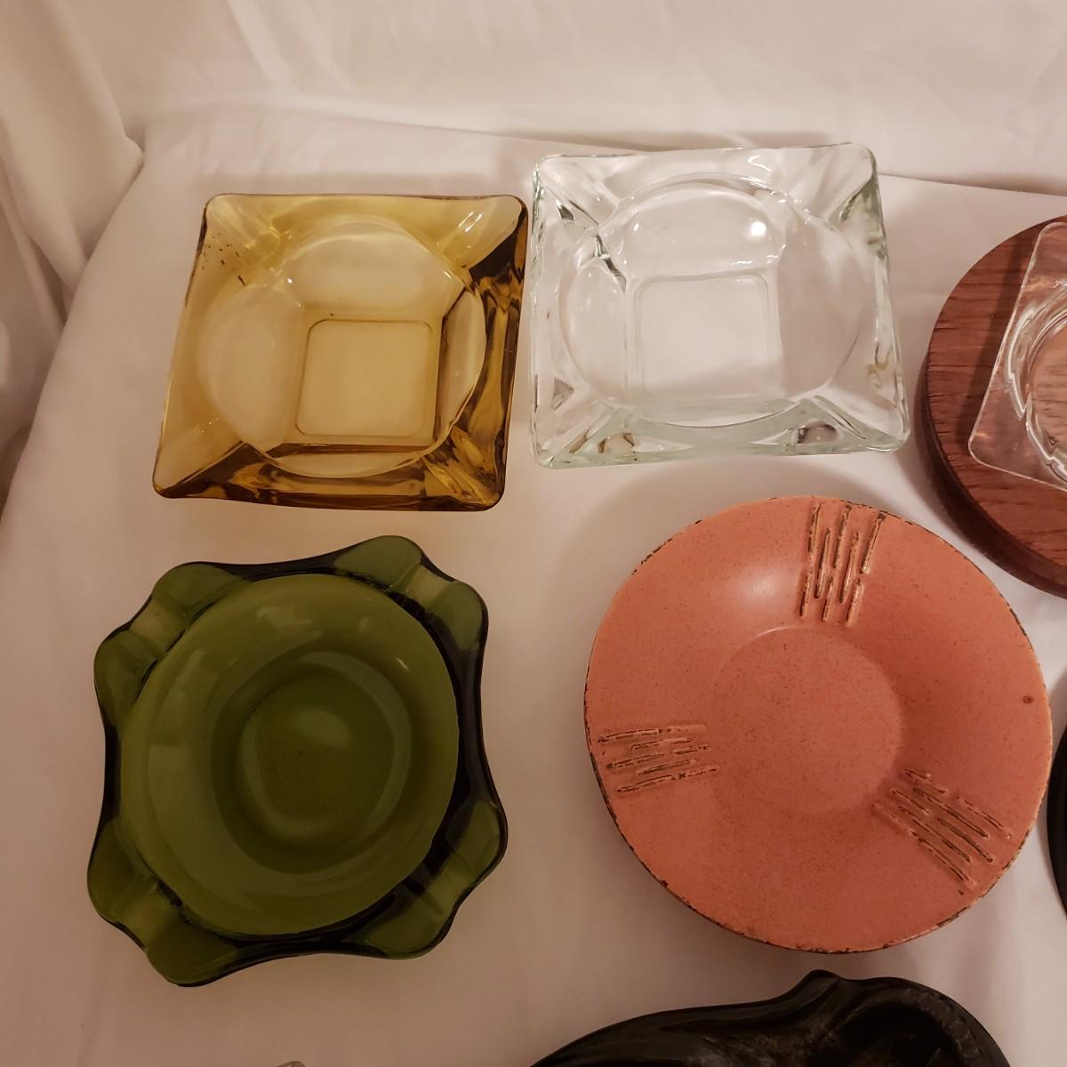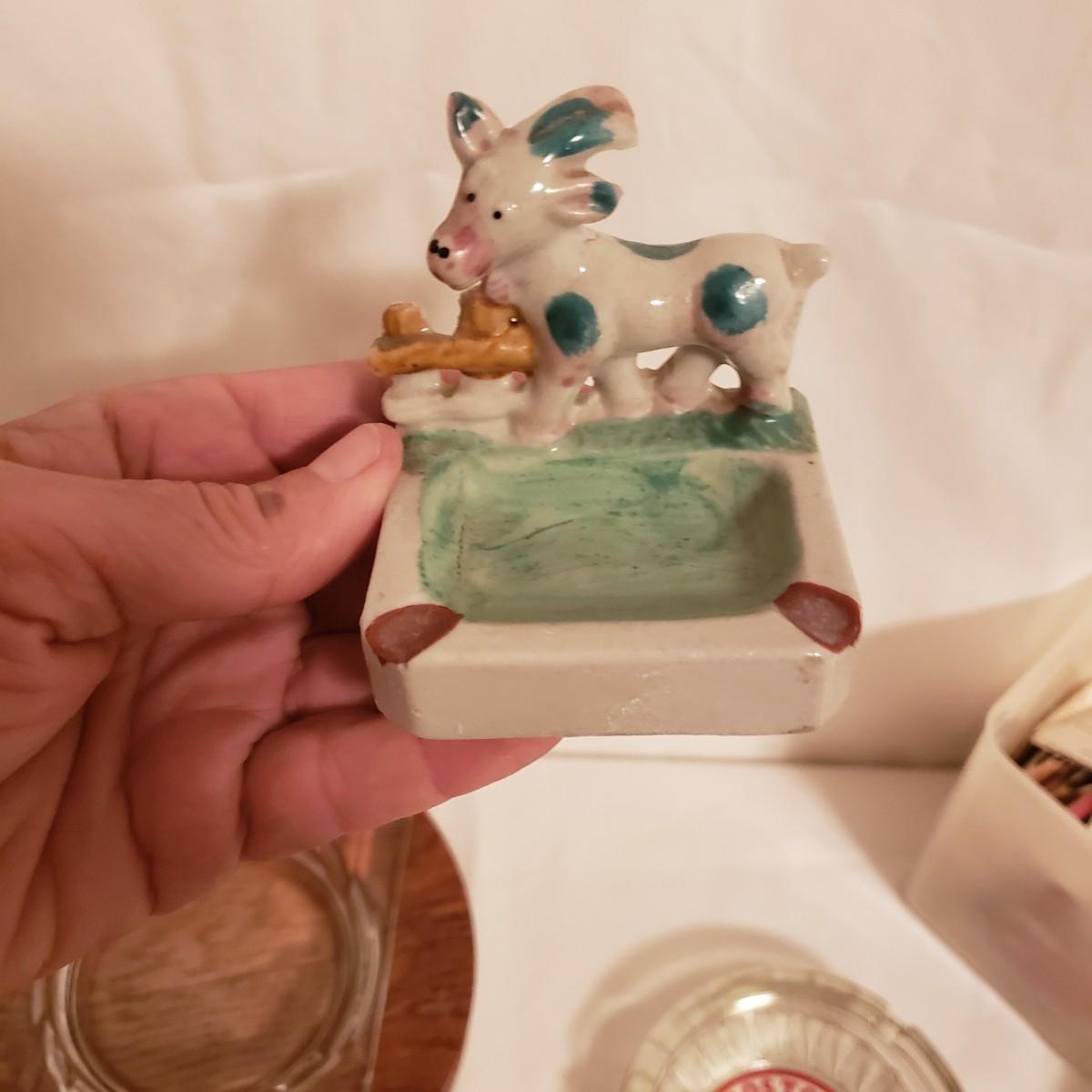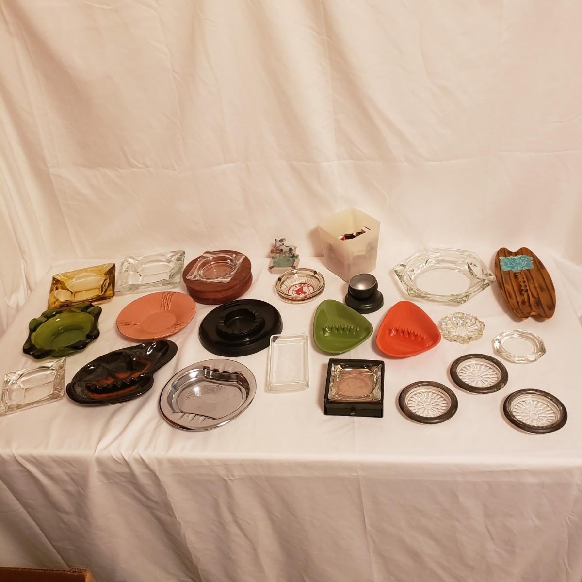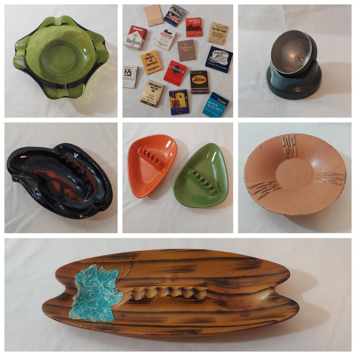 This is a vintage lot of ashtrays and matches. There are 23 ashtrays from clear glass, to plastic and a ceramic cow one made in Japan. The black one with an orange swirl measures 8" x 6" x 1"H. The matches range from new to some matches have been used.