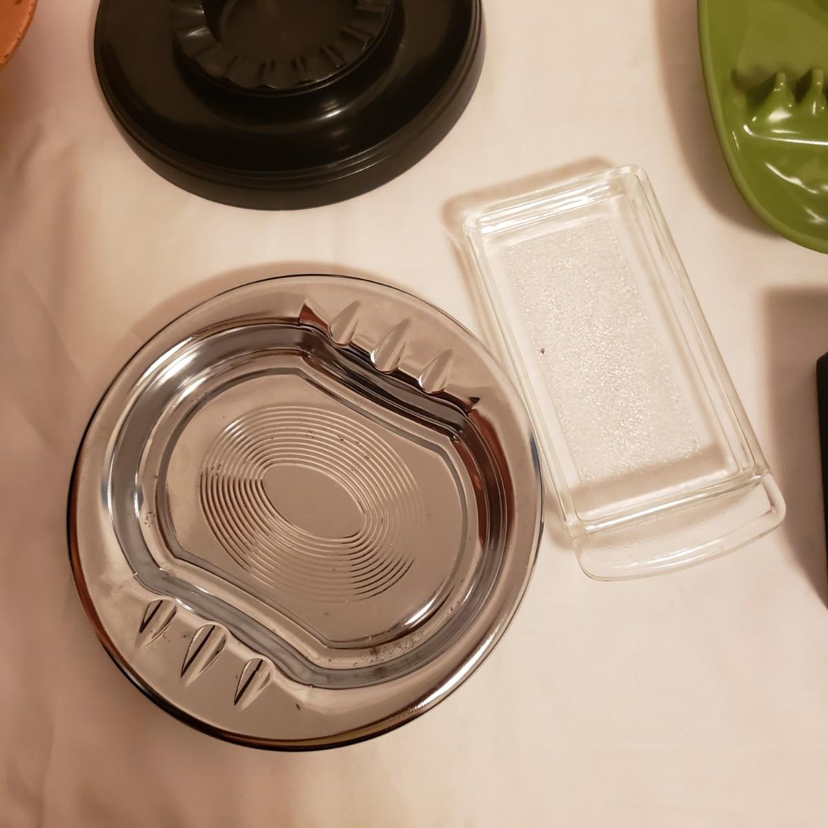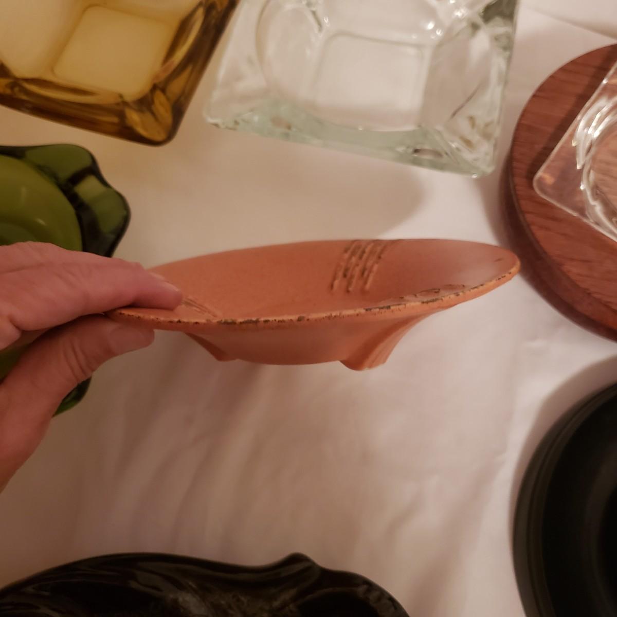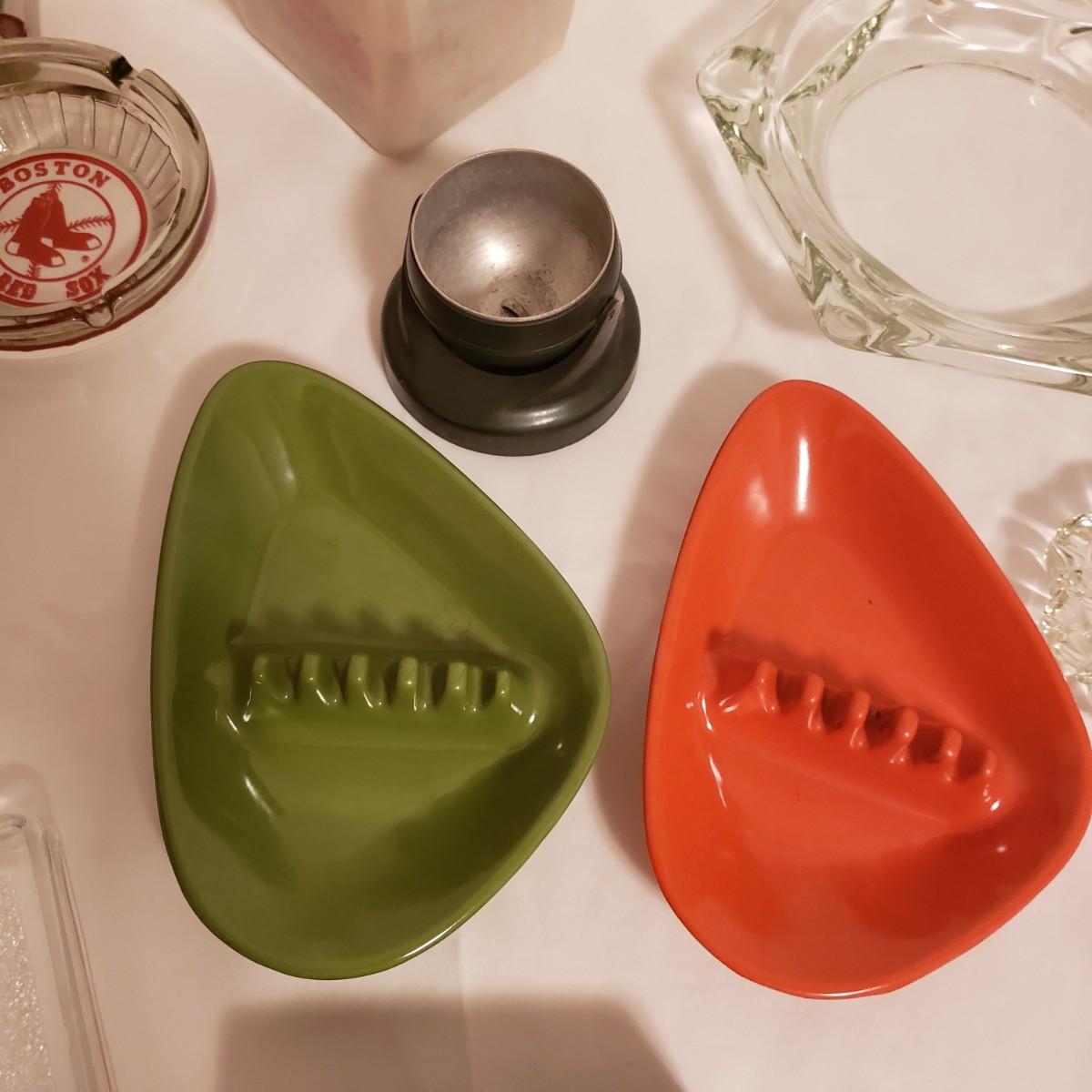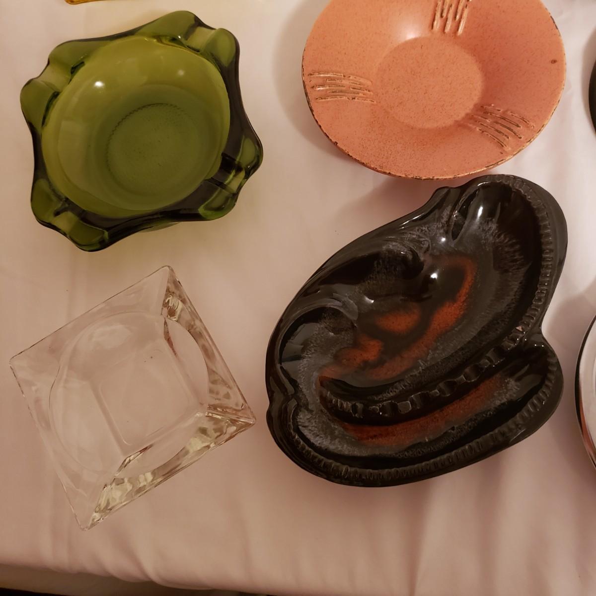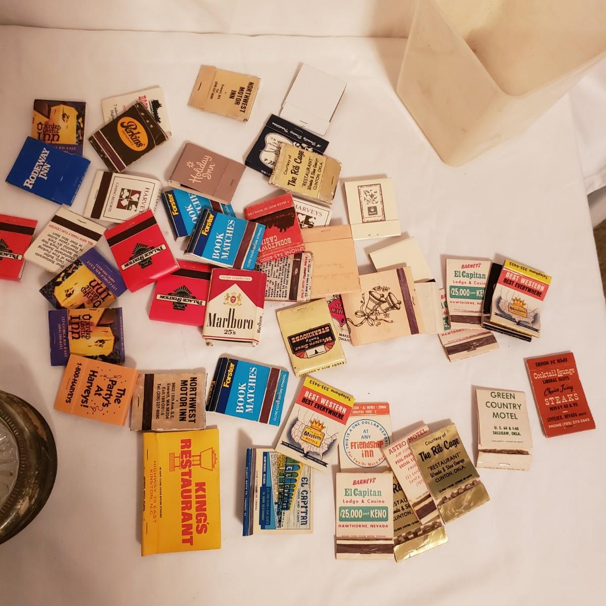 This is a vintage lot of ashtrays and matches. There are 23 ashtrays from clear glass, to plastic and a ceramic cow one made in Japan. The black one with an orange swirl measures 8" x 6" x 1"H. The matches range from new to some matches have been used.