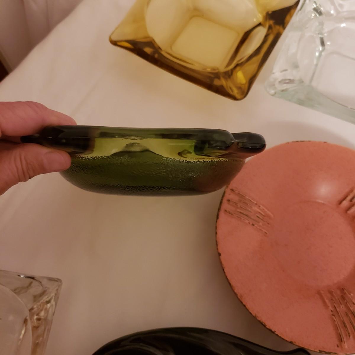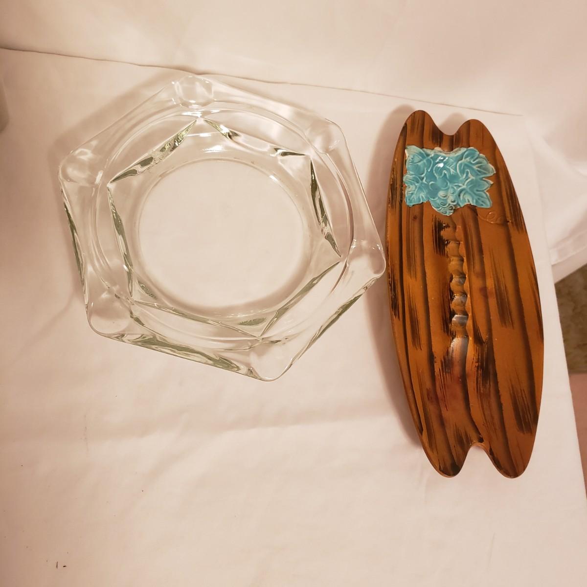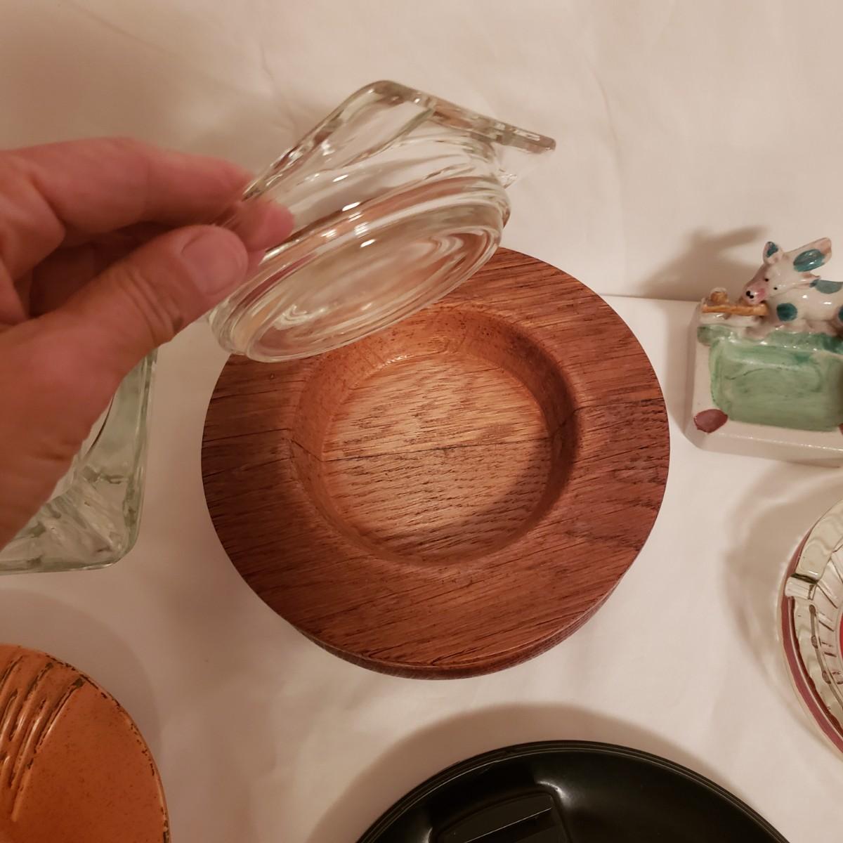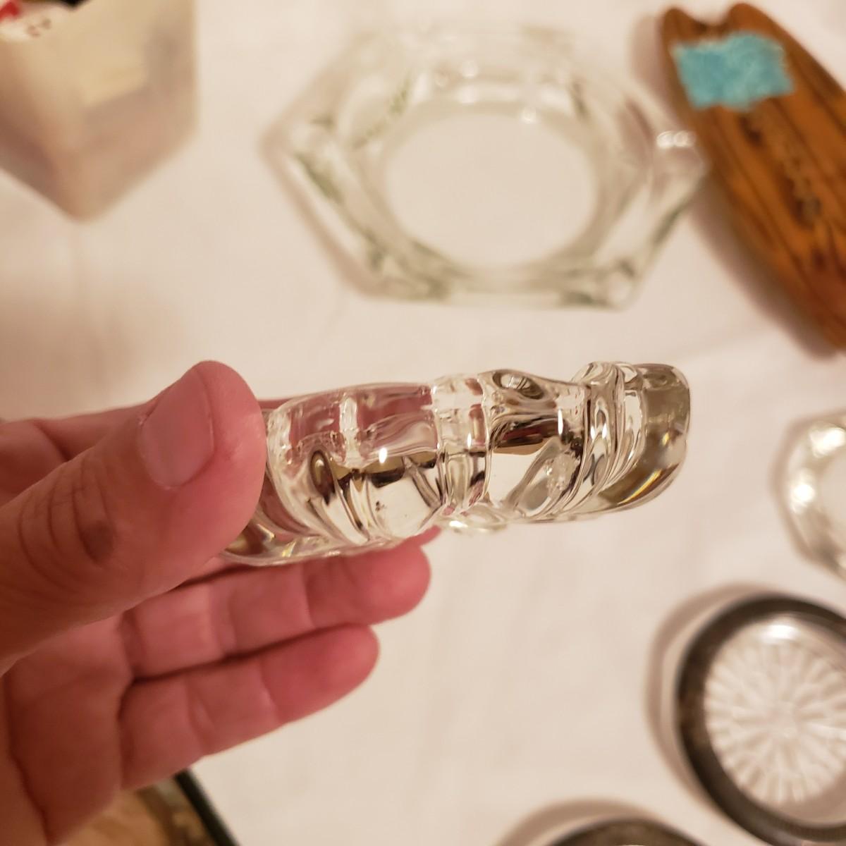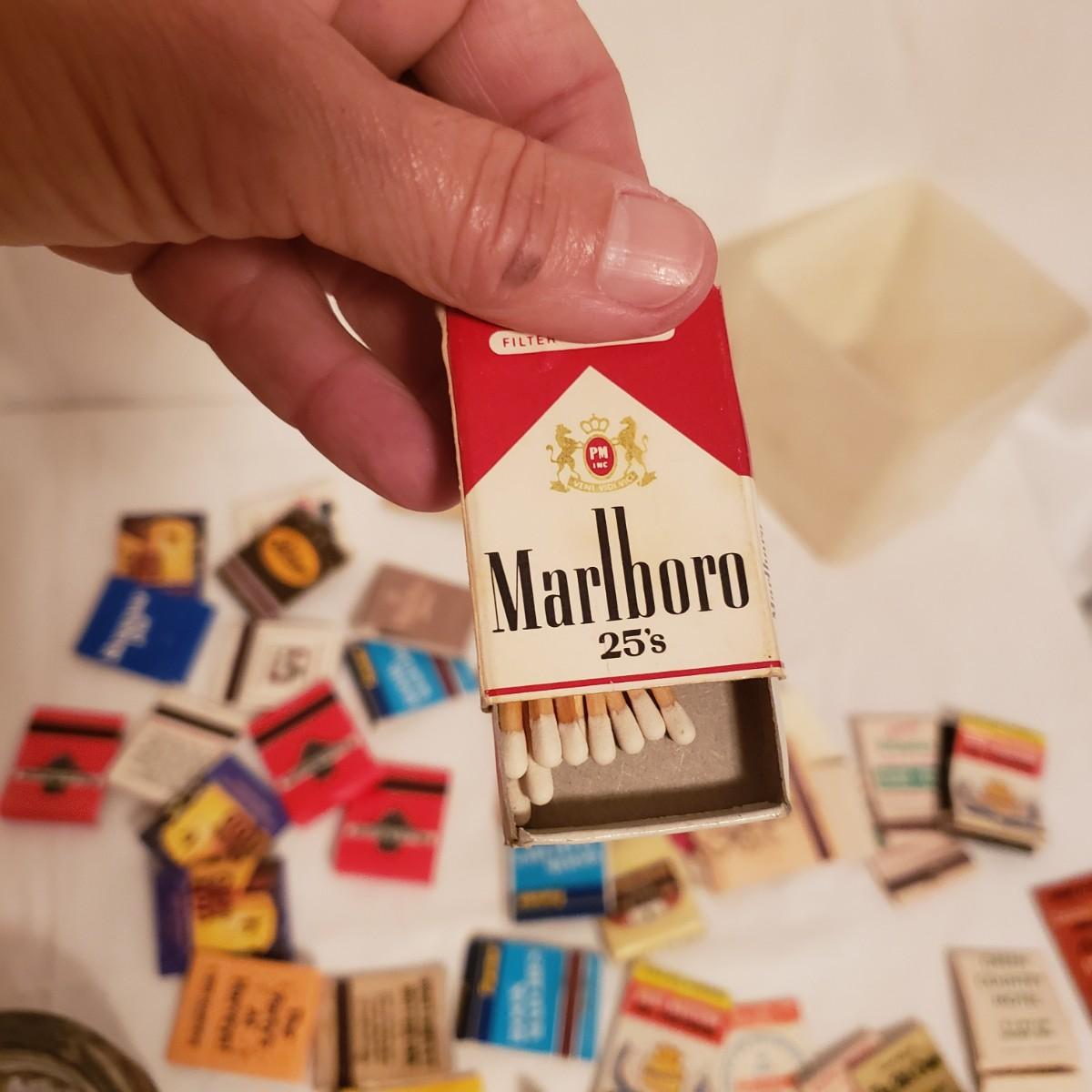 This is a vintage lot of ashtrays and matches. There are 23 ashtrays from clear glass, to plastic and a ceramic cow one made in Japan. The black one with an orange swirl measures 8" x 6" x 1"H. The matches range from new to some matches have been used.