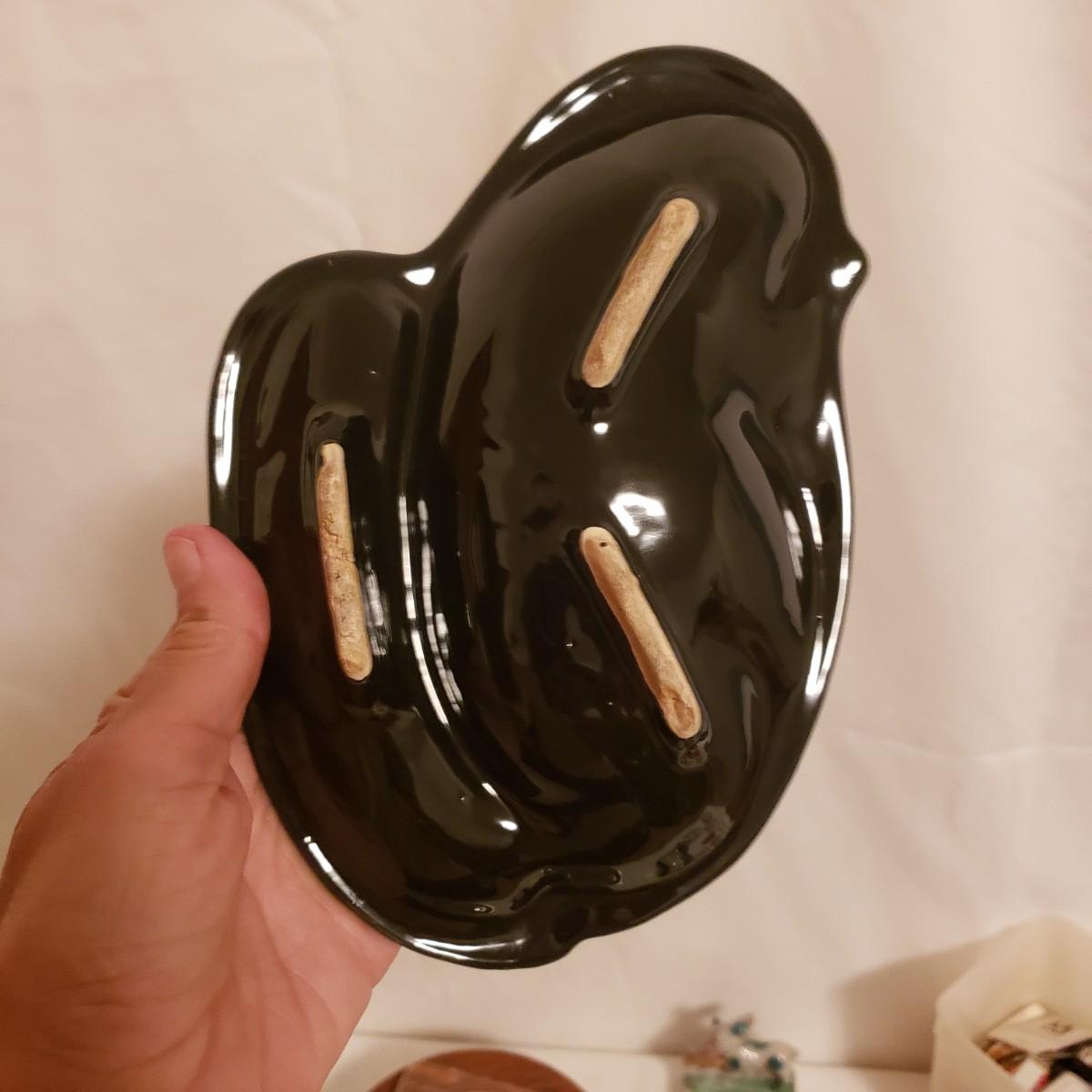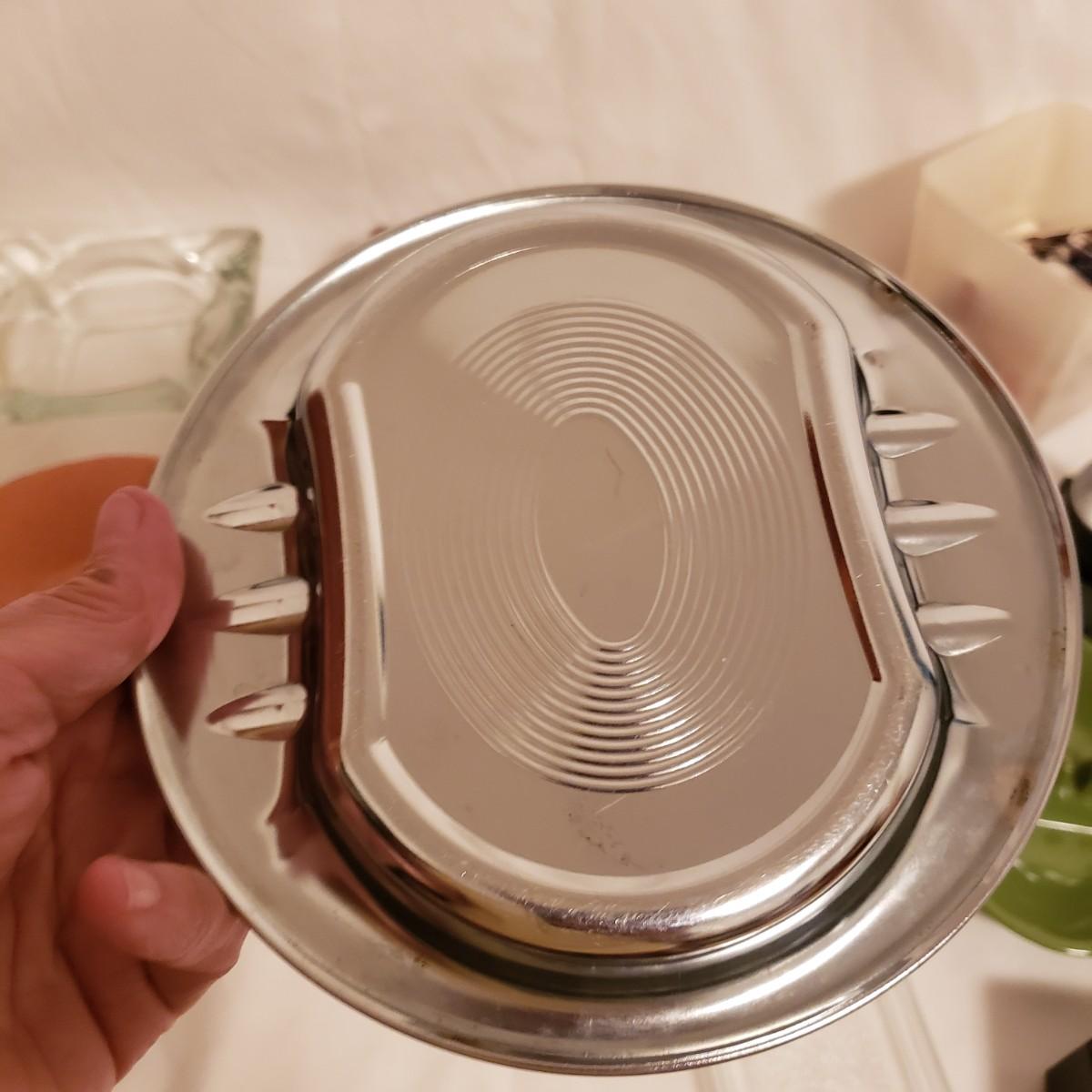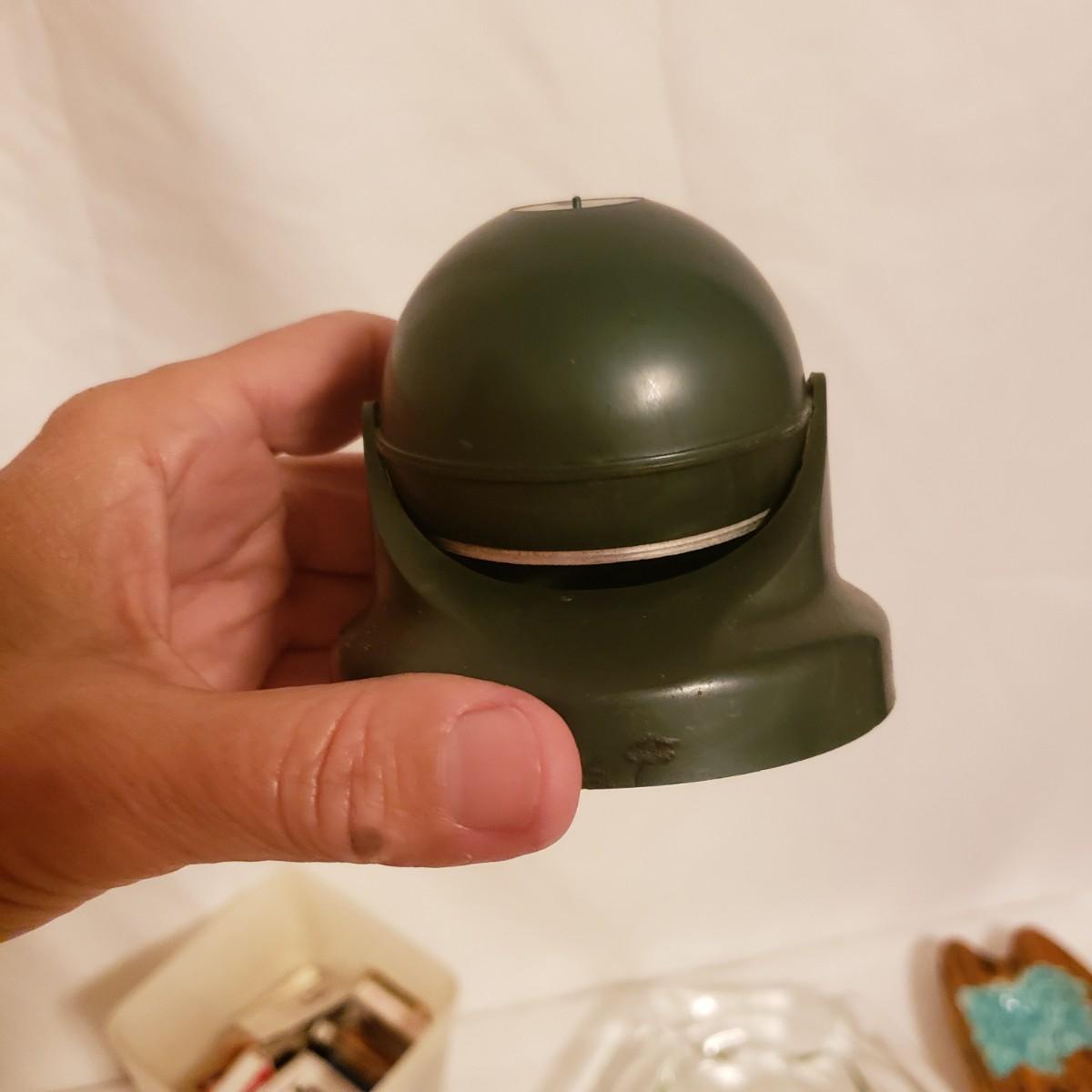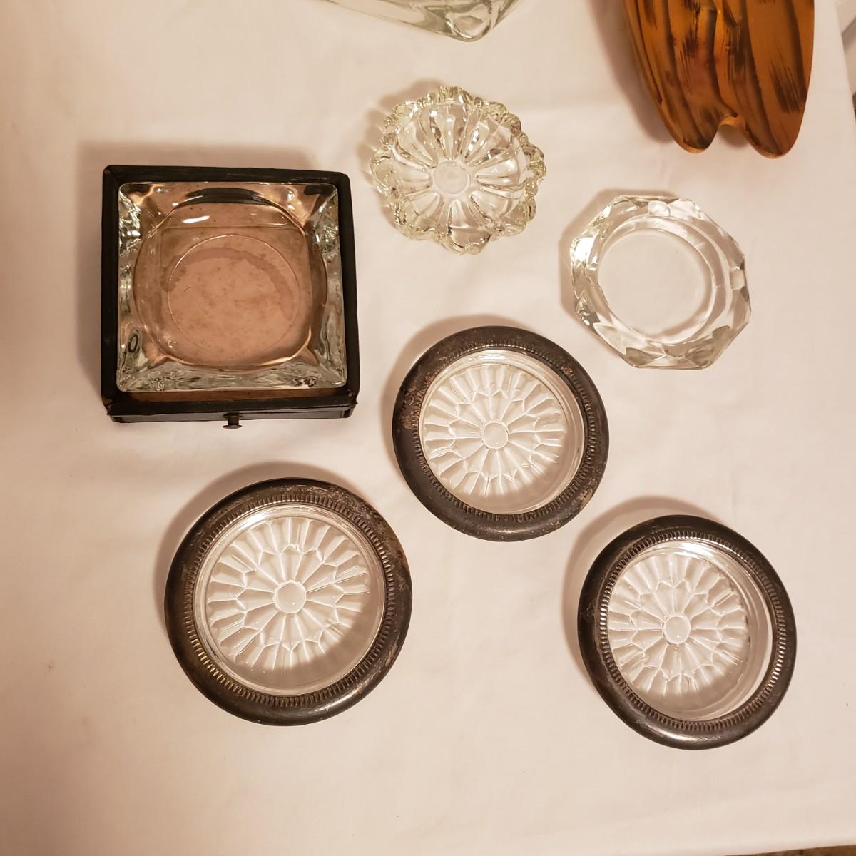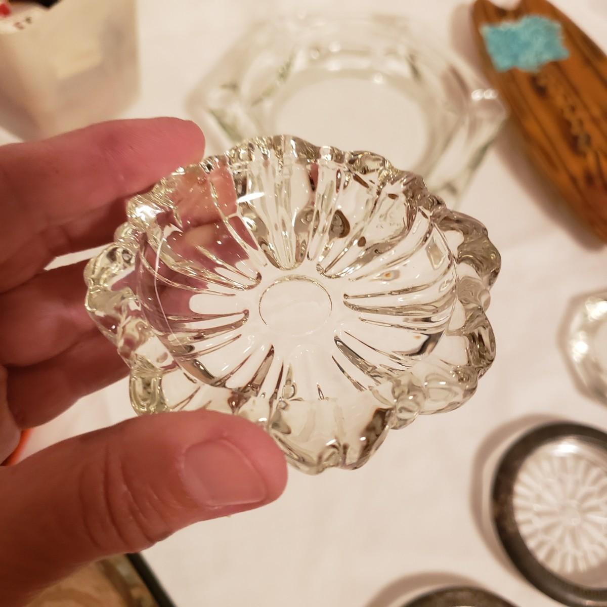 This is a vintage lot of ashtrays and matches. There are 23 ashtrays from clear glass, to plastic and a ceramic cow one made in Japan. The black one with an orange swirl measures 8" x 6" x 1"H. The matches range from new to some matches have been used.