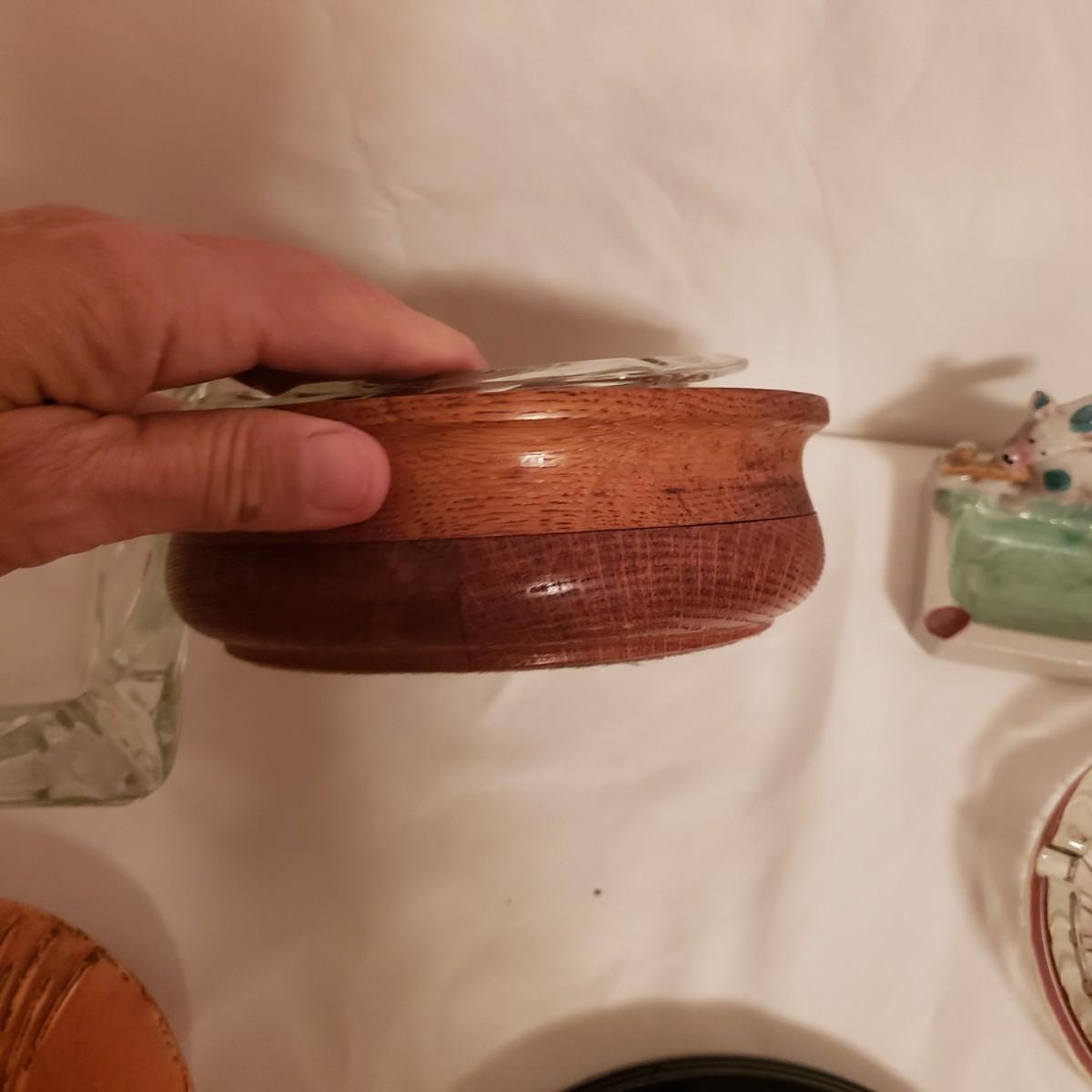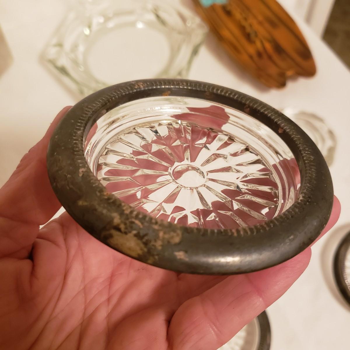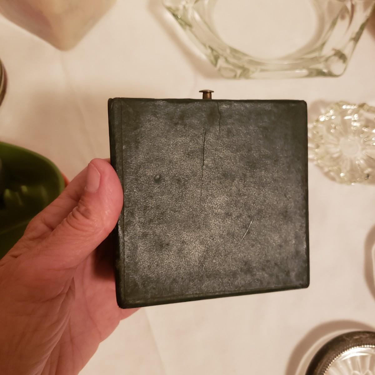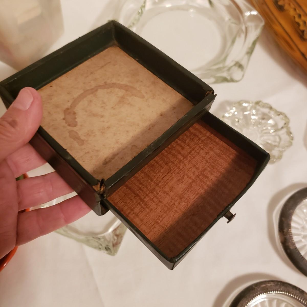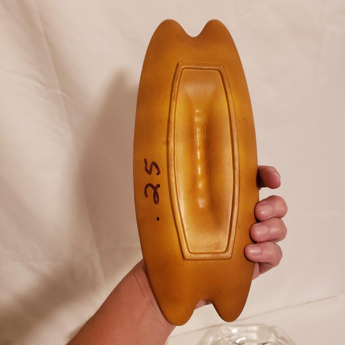 This is a vintage lot of ashtrays and matches. There are 23 ashtrays from clear glass, to plastic and a ceramic cow one made in Japan. The black one with an orange swirl measures 8" x 6" x 1"H. The matches range from new to some matches have been used.