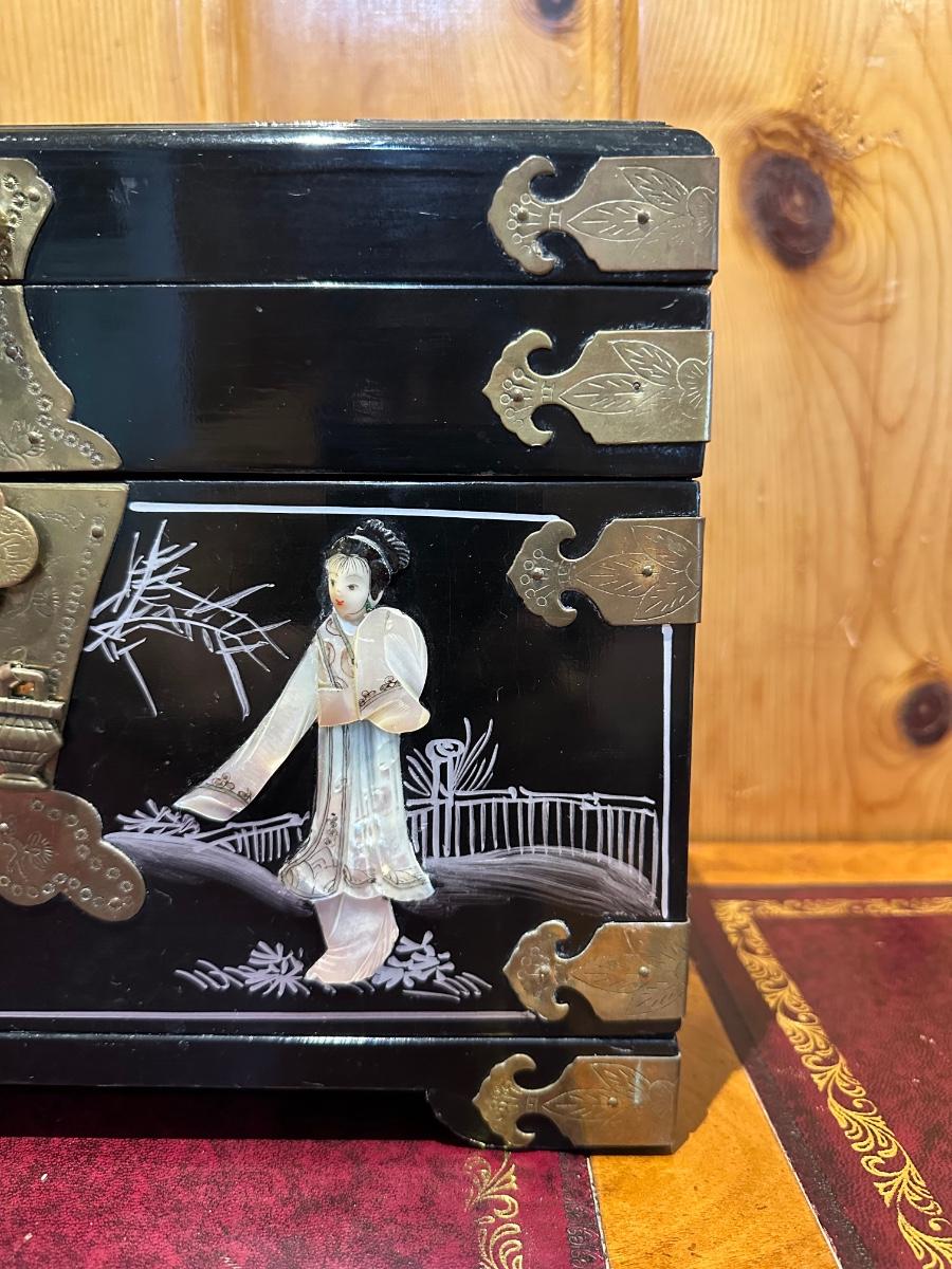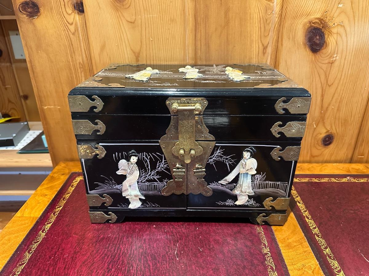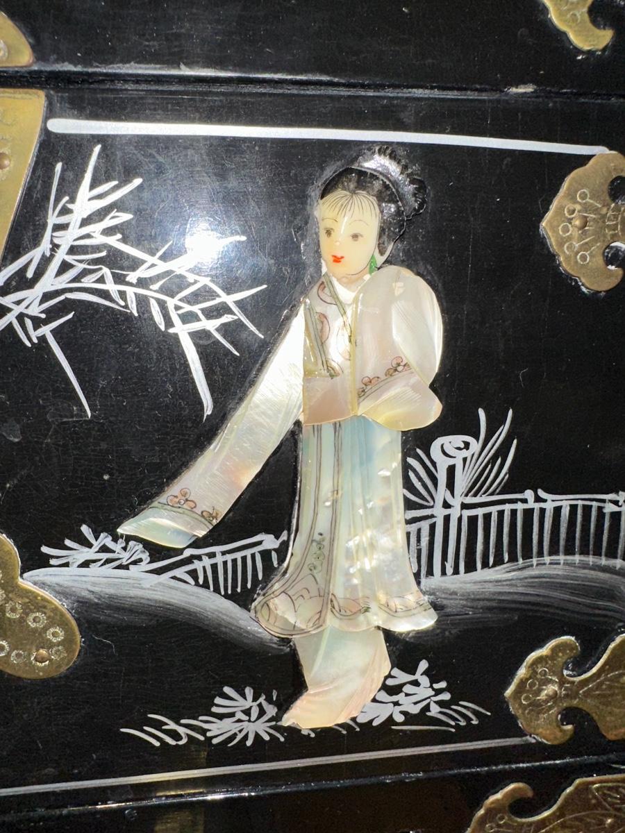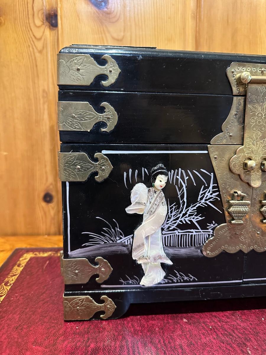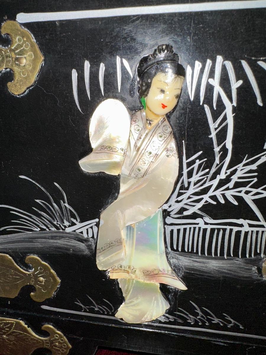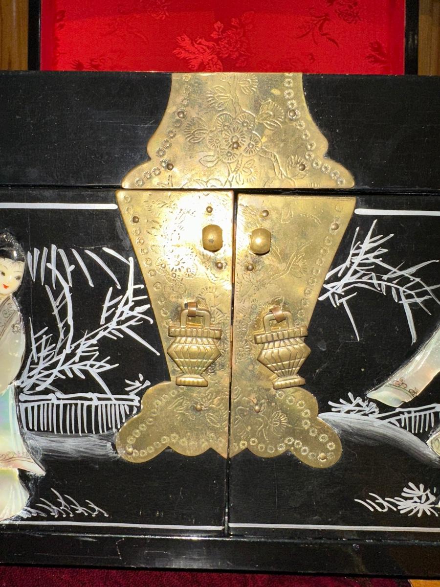 VINTAGE ASIAN BLACK LACQUER AND BRASS JEWELRY BOX WITH MOTHER OF PEARL GEISHA GIRLS
