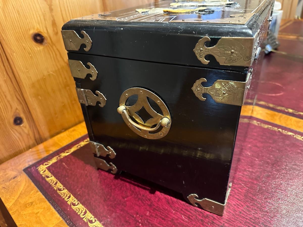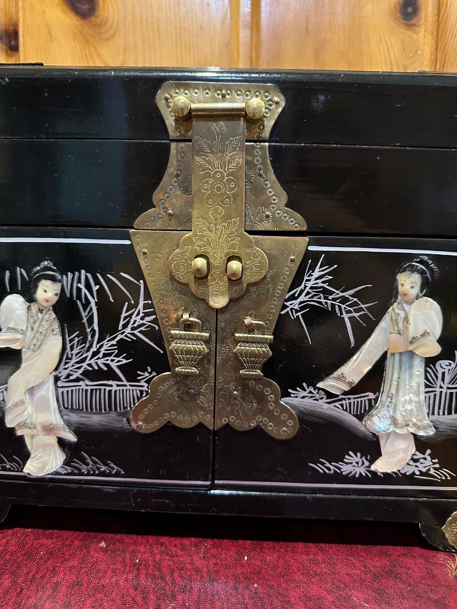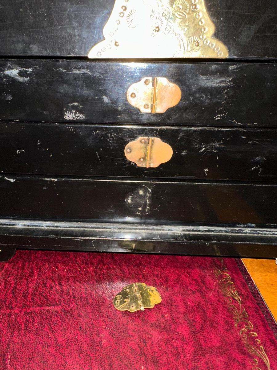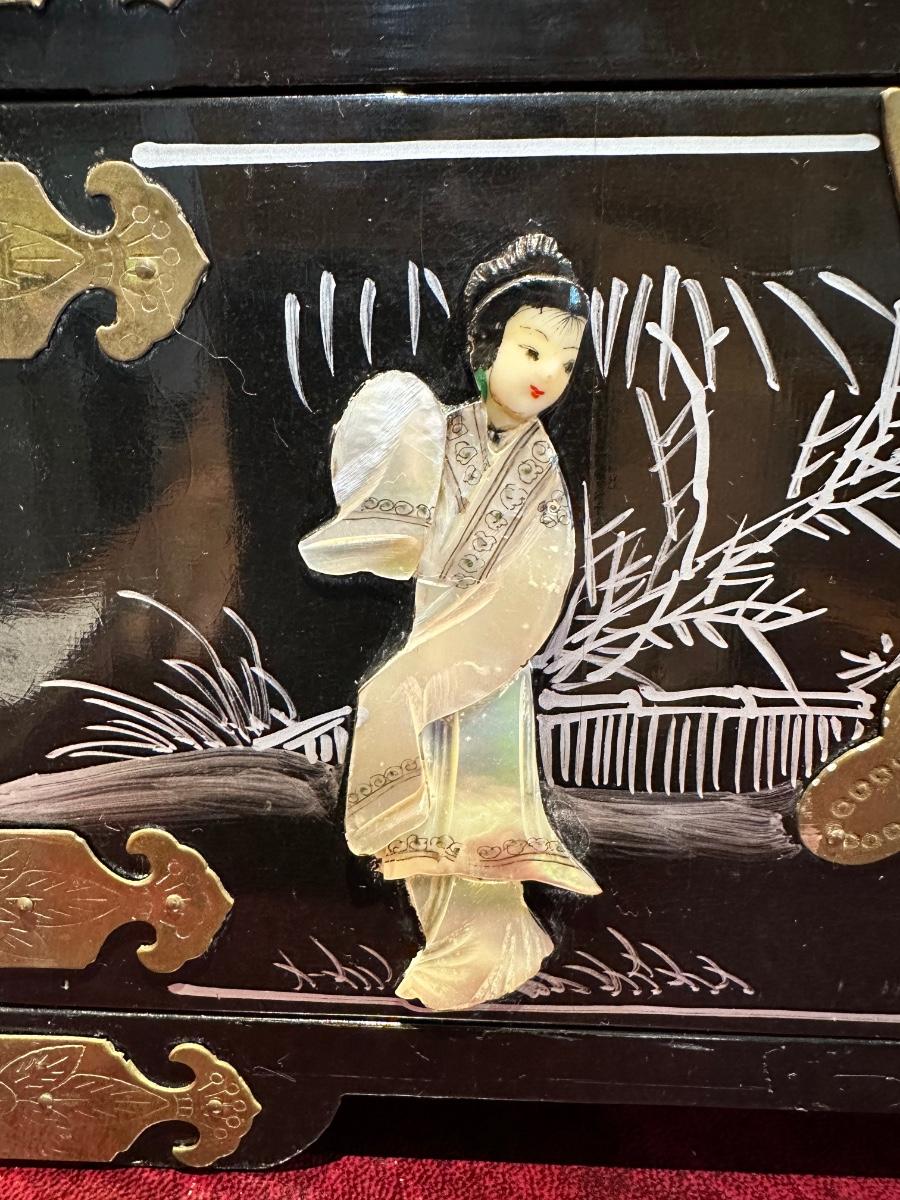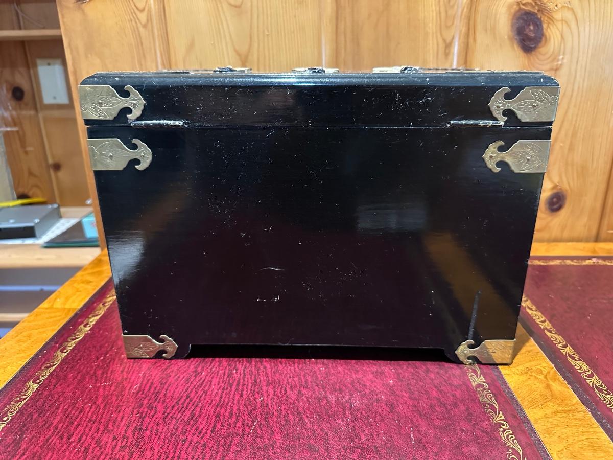VINTAGE ASIAN BLACK LACQUER AND BRASS JEWELRY BOX WITH MOTHER OF PEARL GEISHA GIRLS