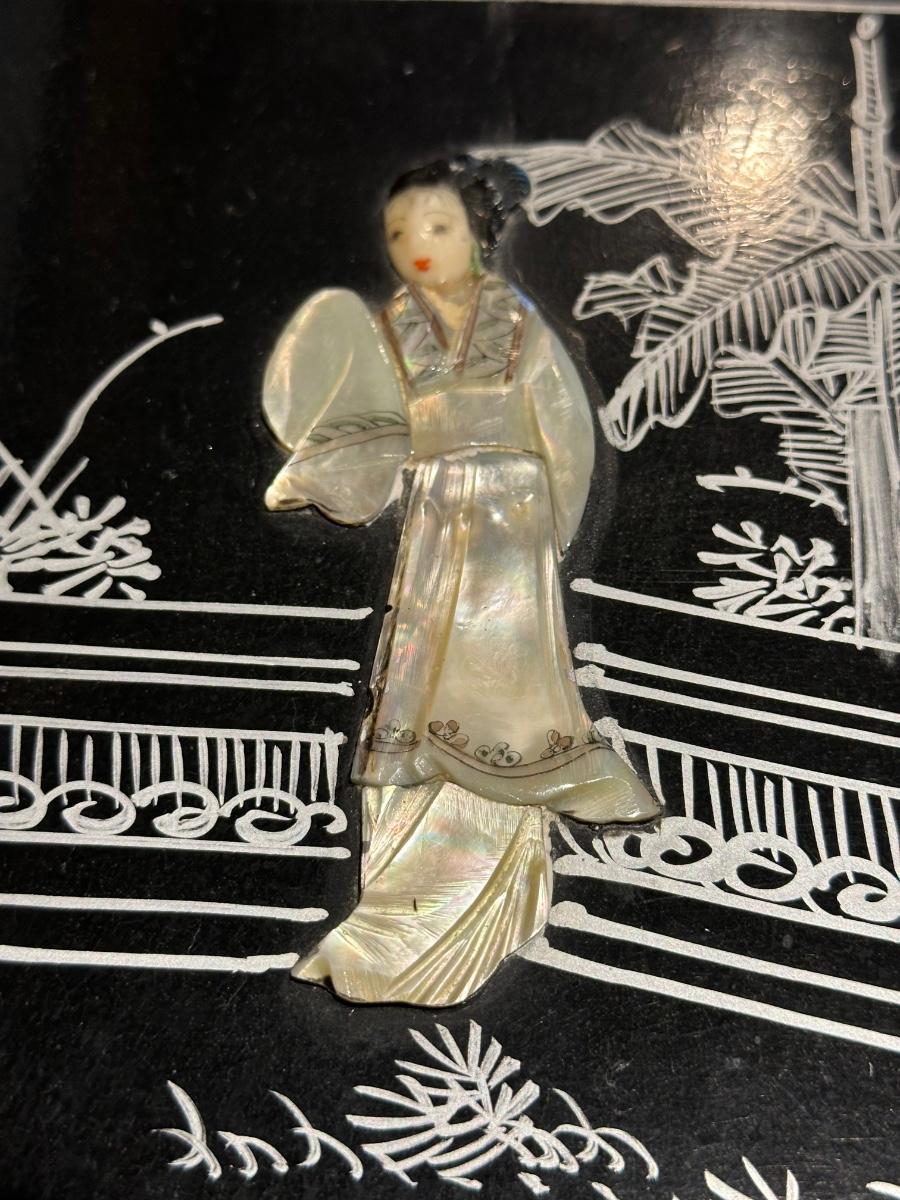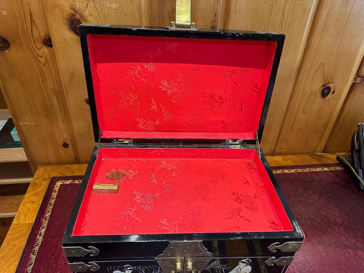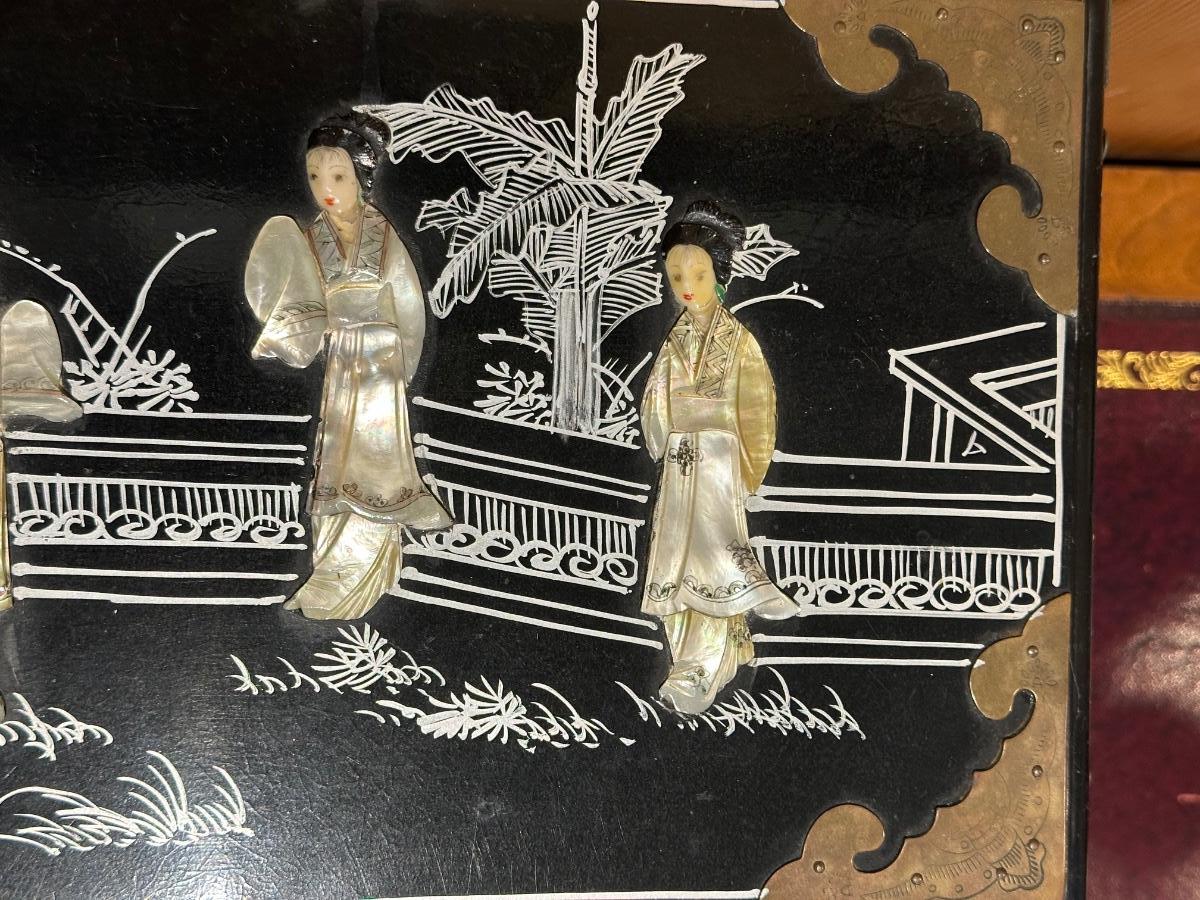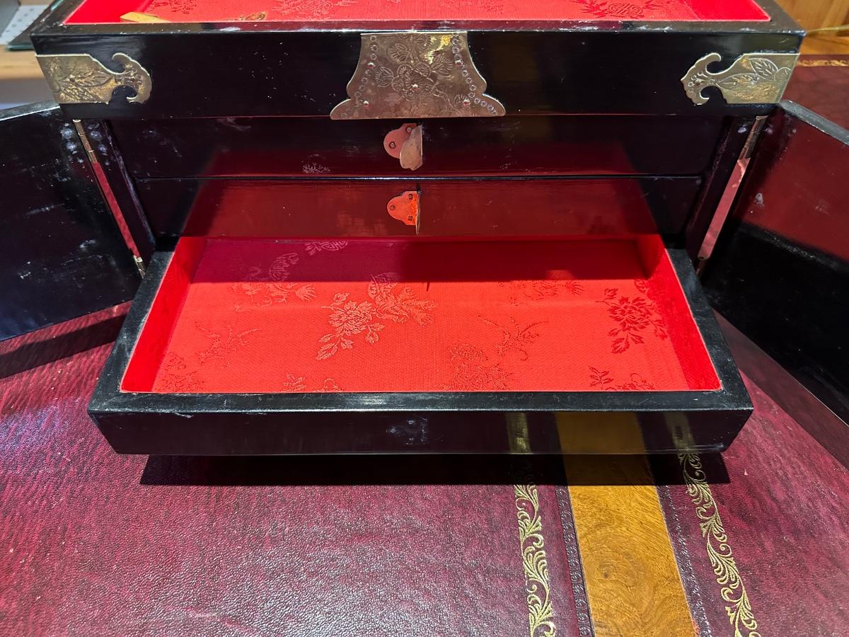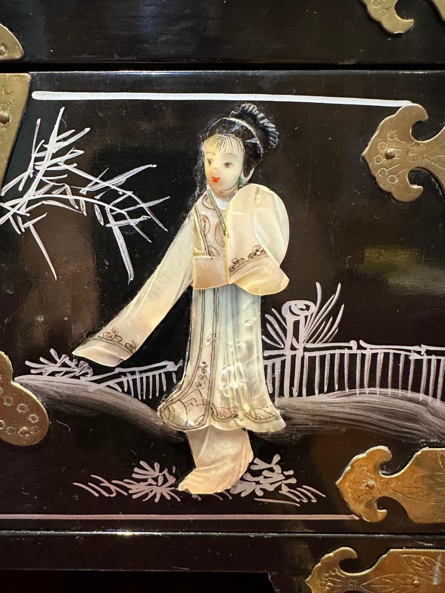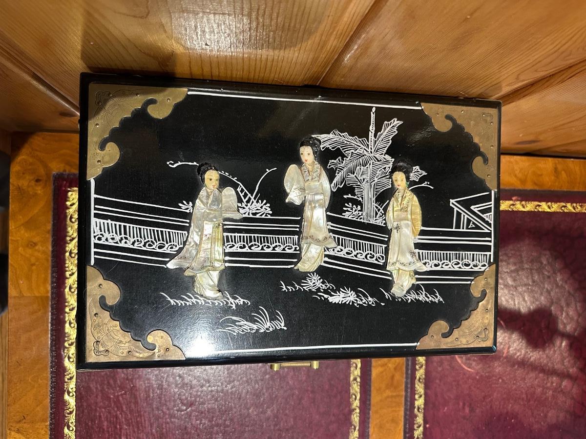 VINTAGE ASIAN BLACK LACQUER AND BRASS JEWELRY BOX WITH MOTHER OF PEARL GEISHA GIRLS