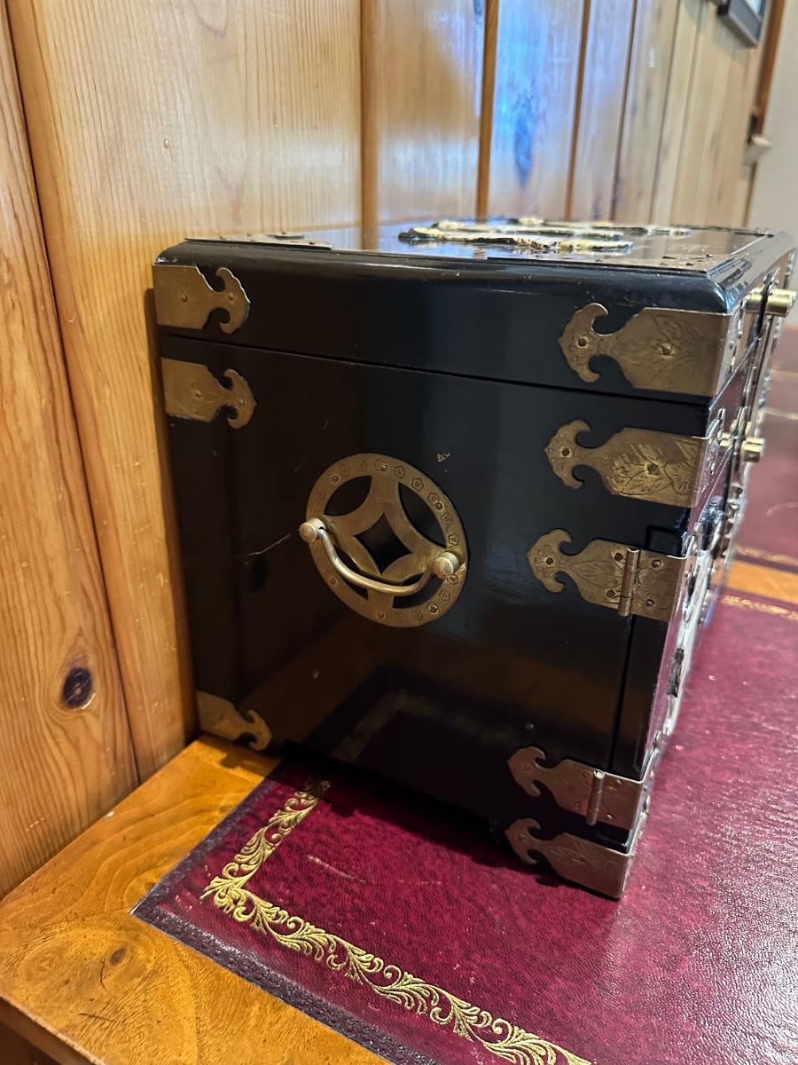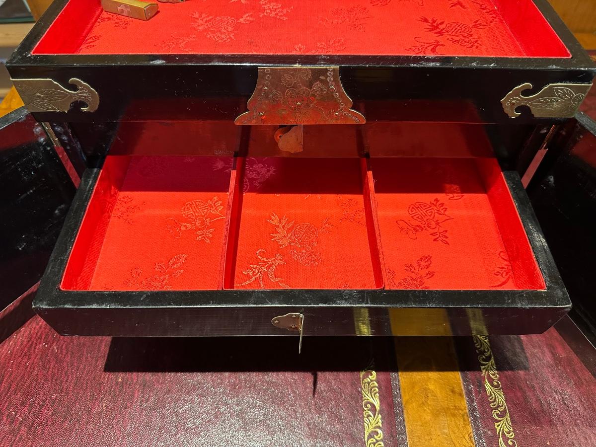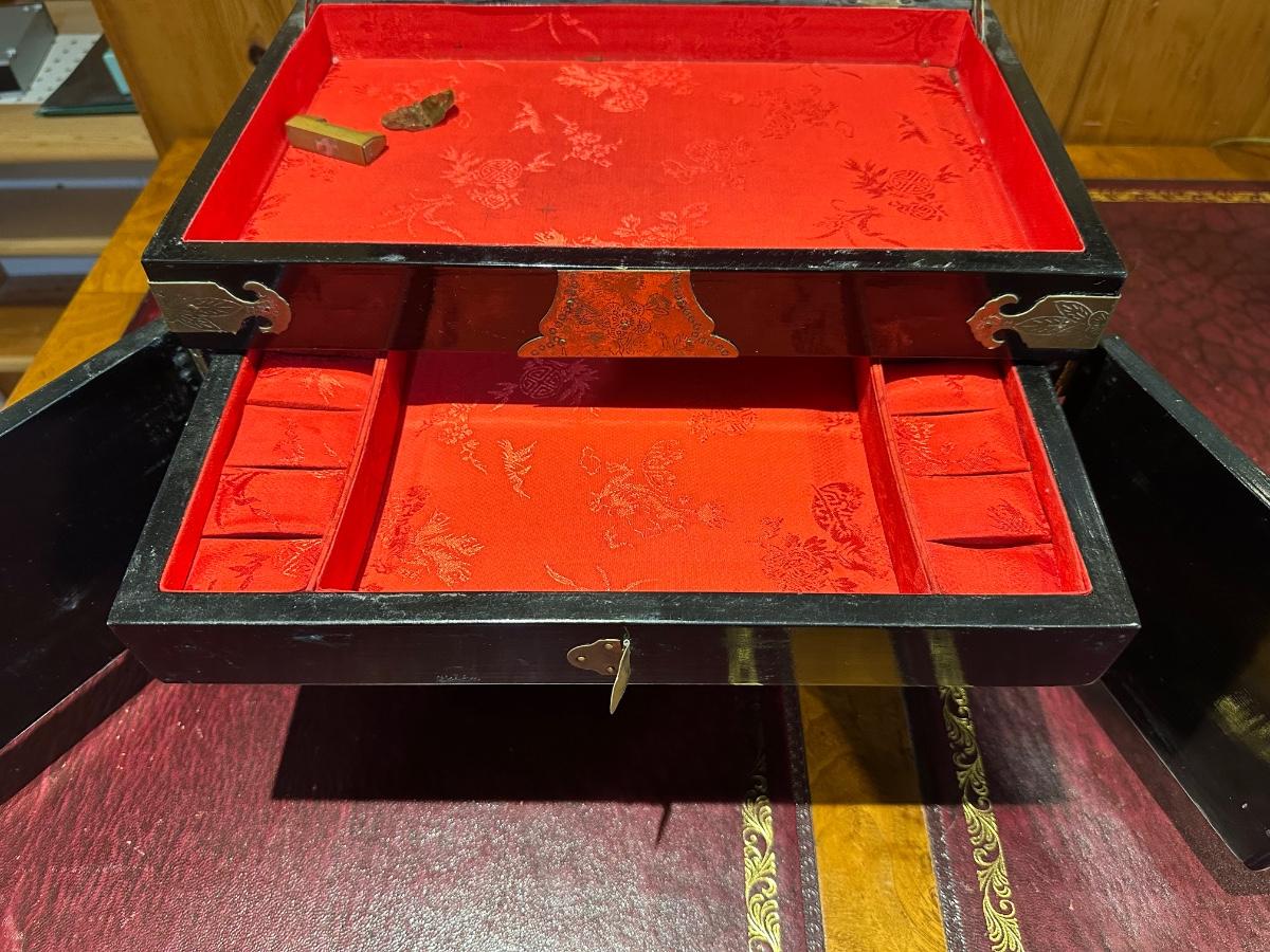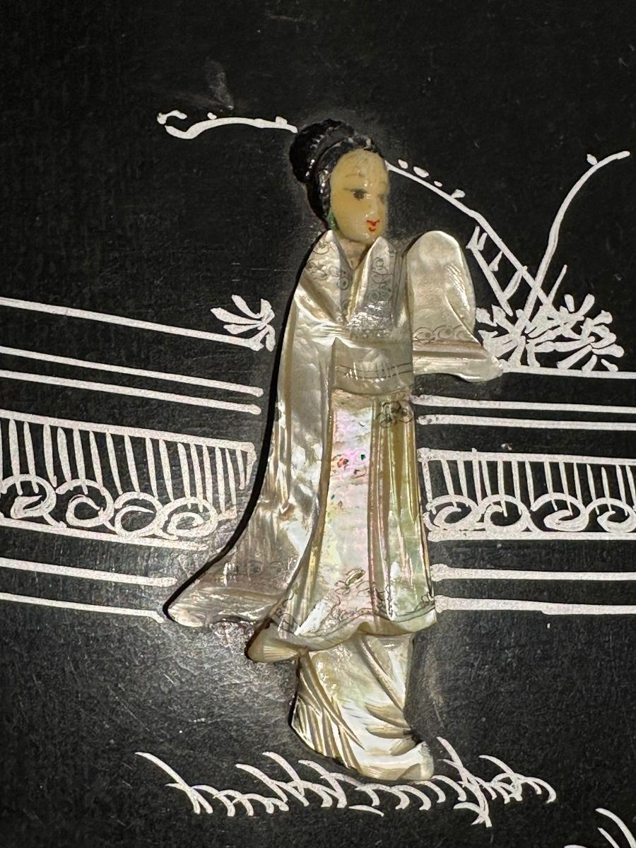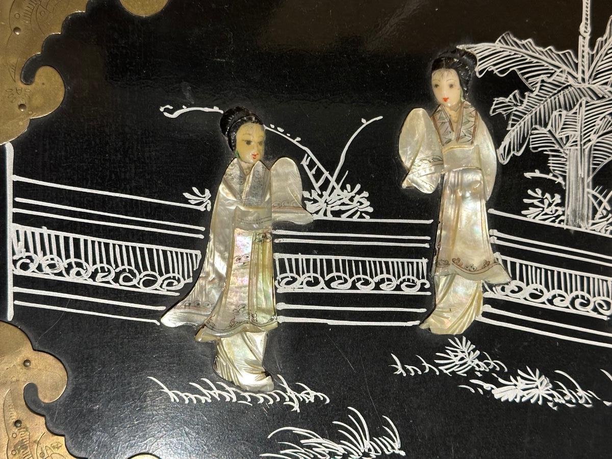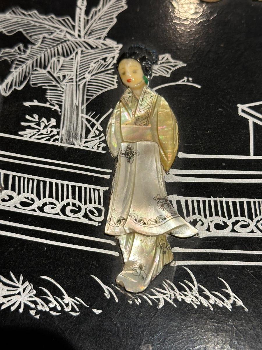 VINTAGE ASIAN BLACK LACQUER AND BRASS JEWELRY BOX WITH MOTHER OF PEARL GEISHA GIRLS