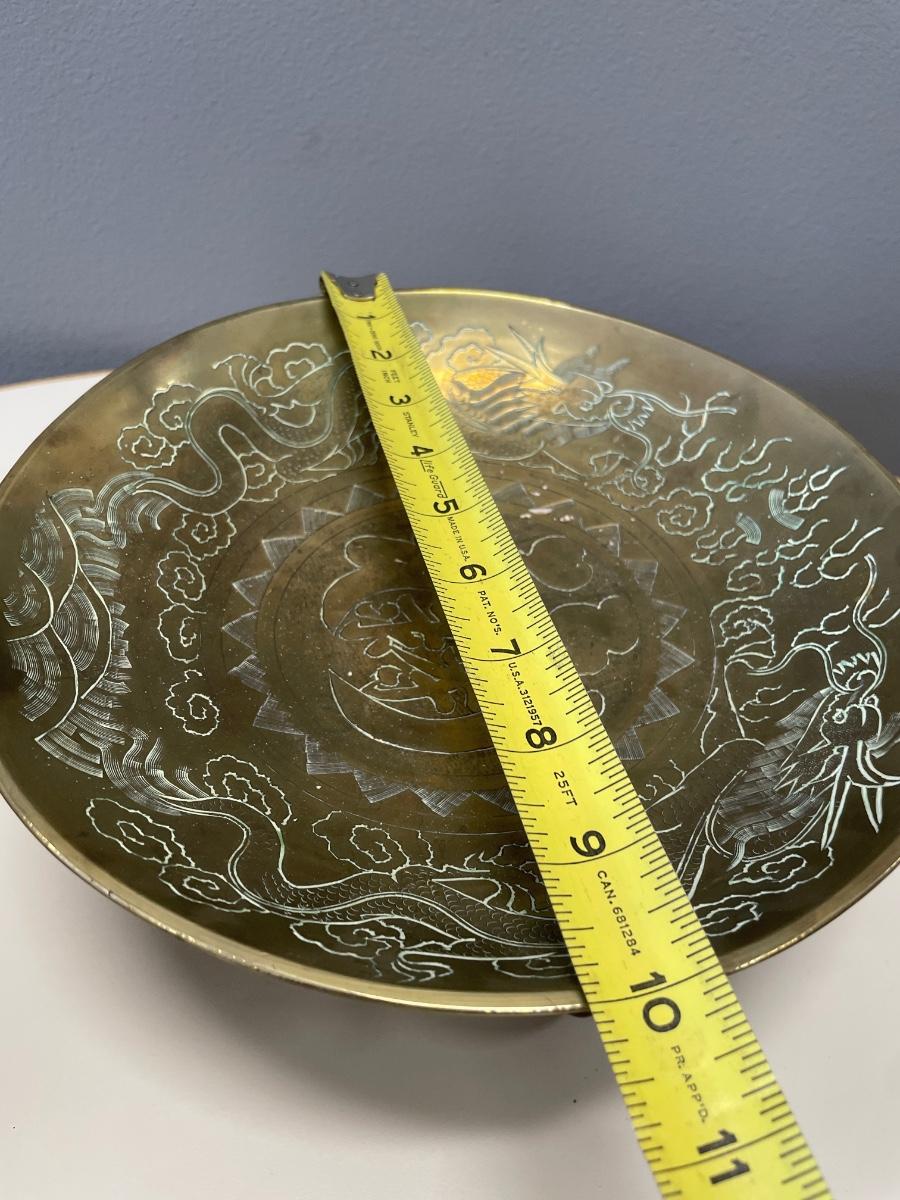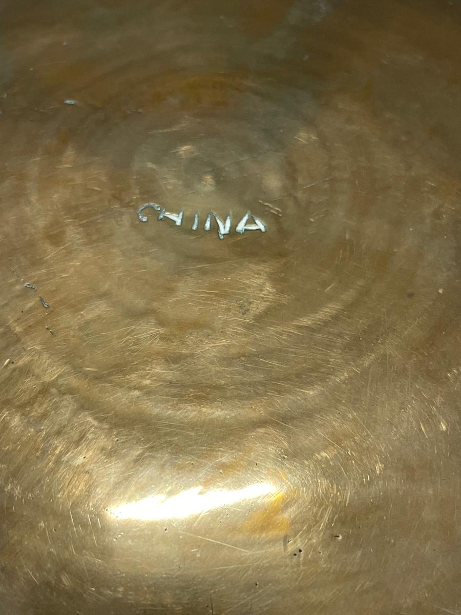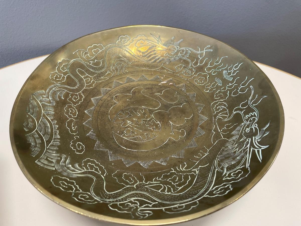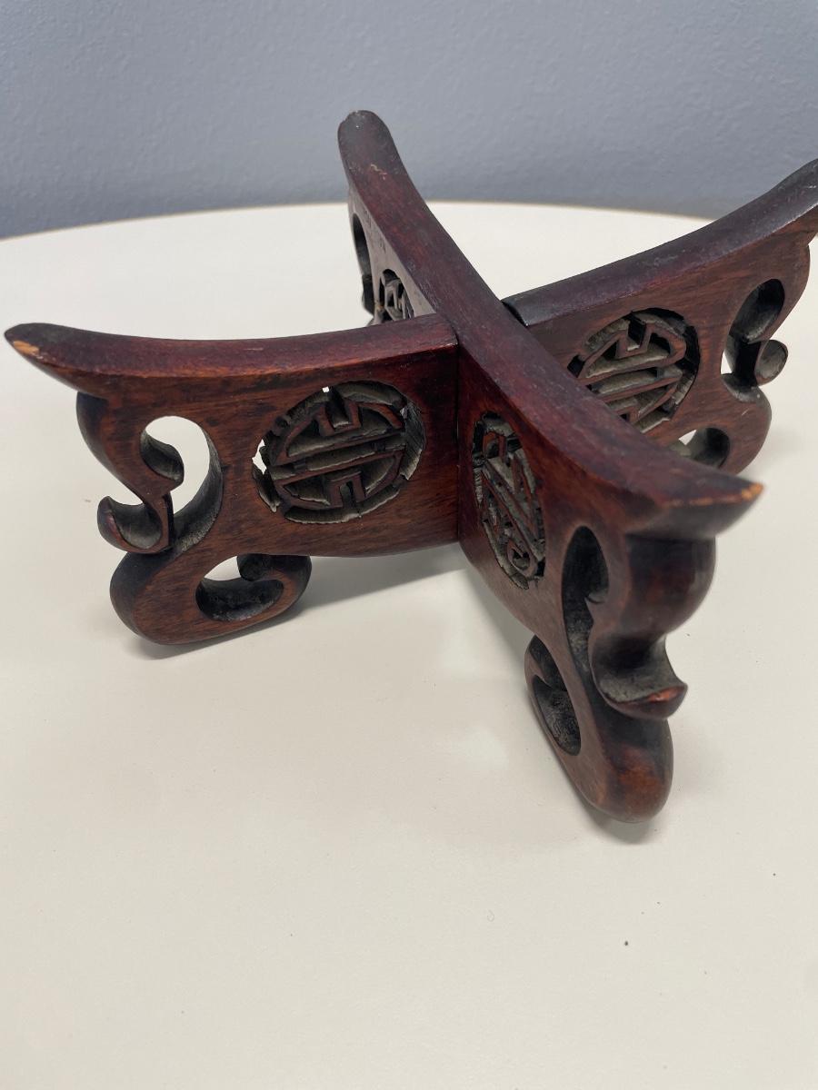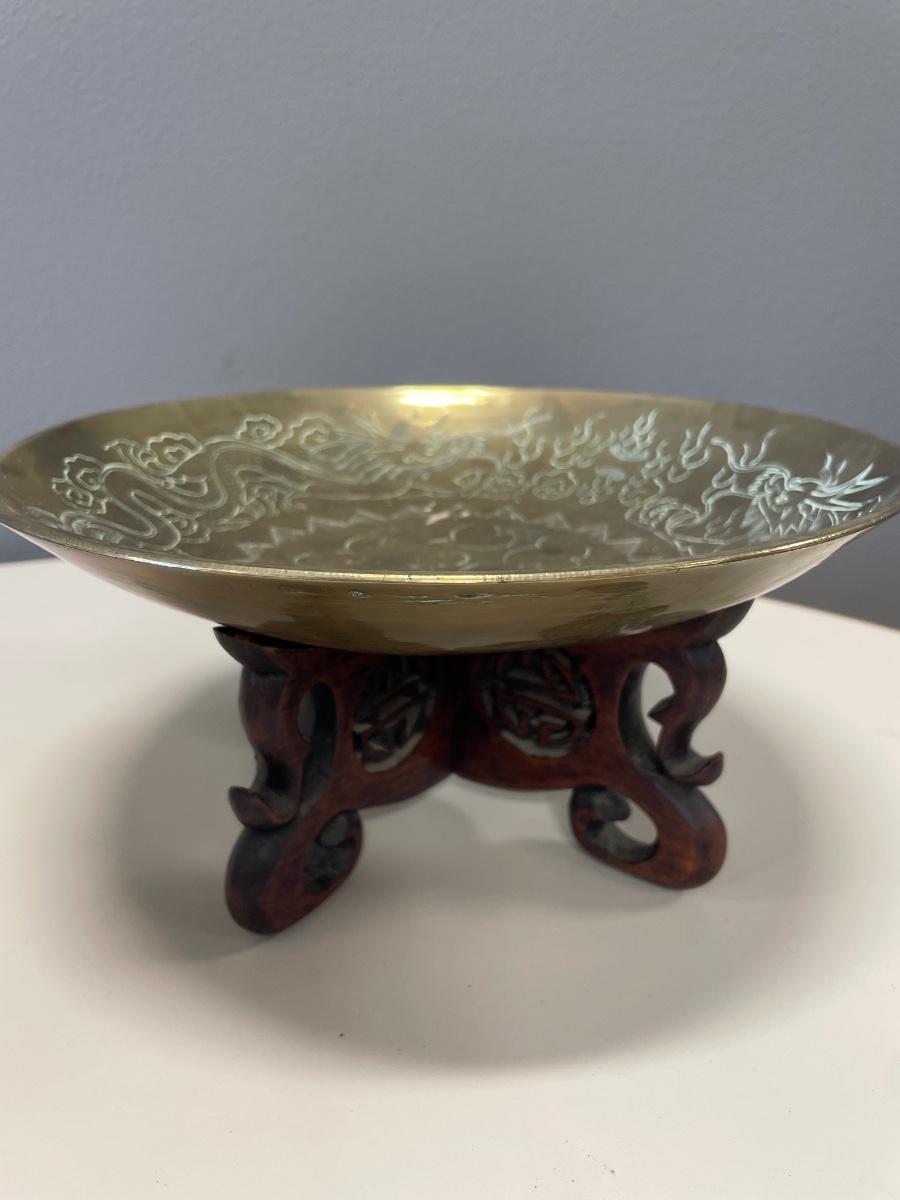 Vintage Asian brass bowl with carved wood stand