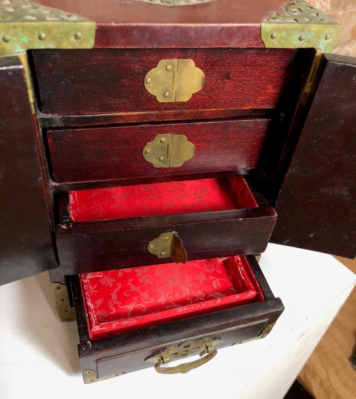 vintage ASIAN BRASS WOOD & JADE JEWELRY BOX