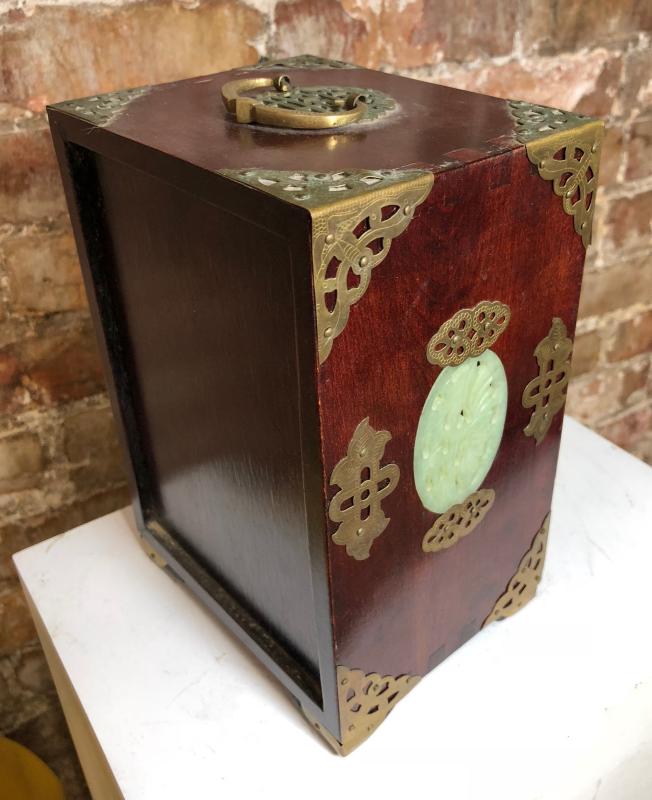 In good condition here is an Asian jewelry box constructed of wood and jade with brass fittings...