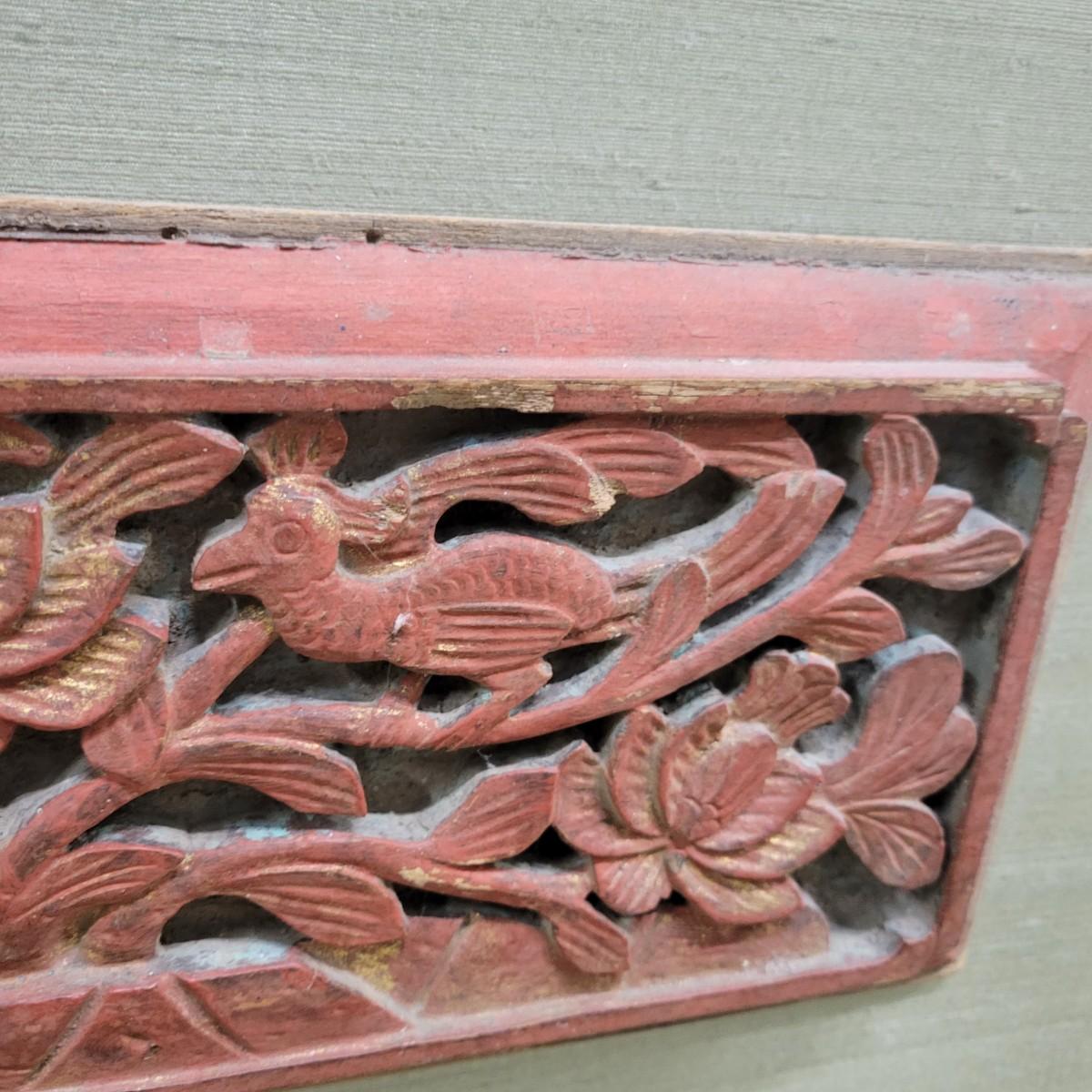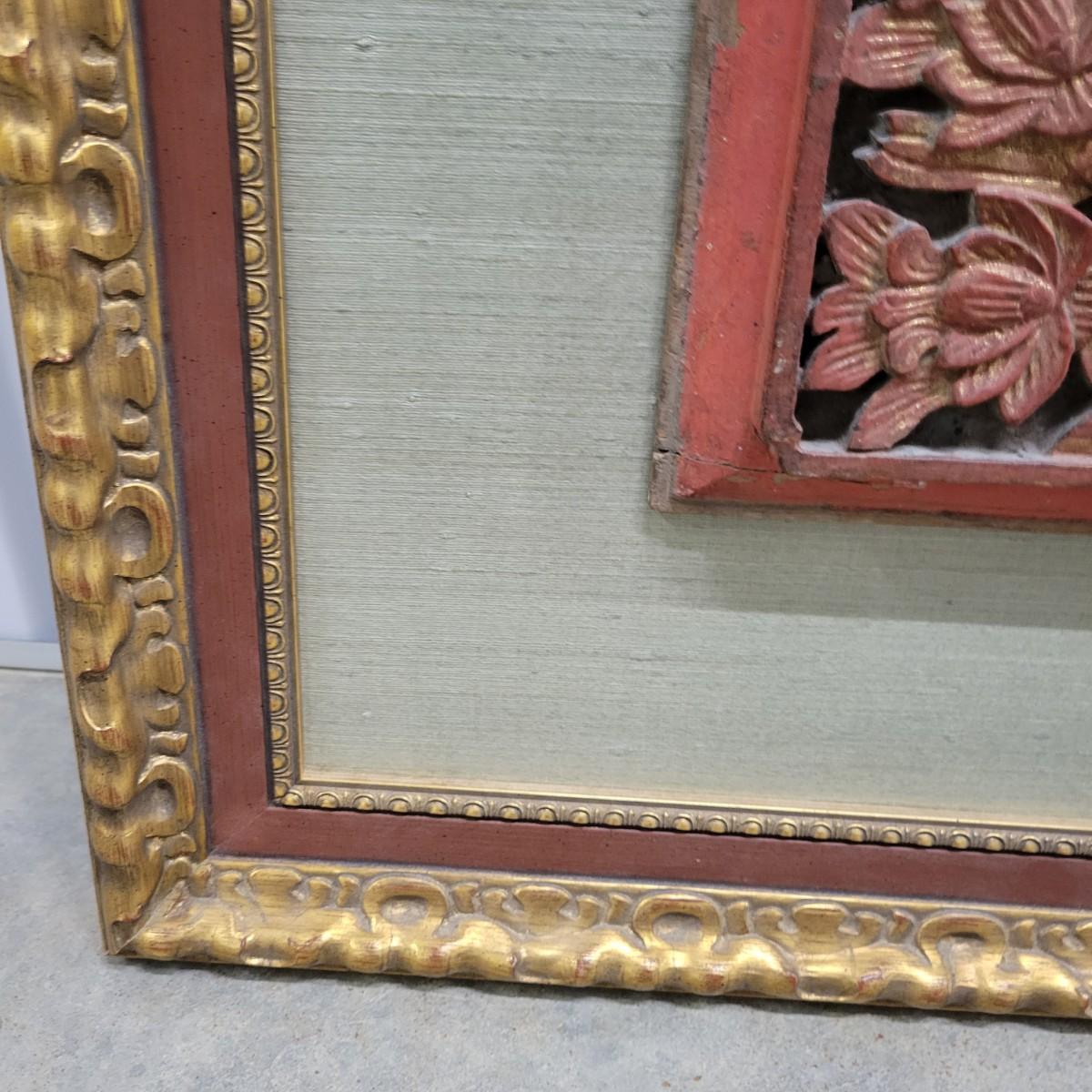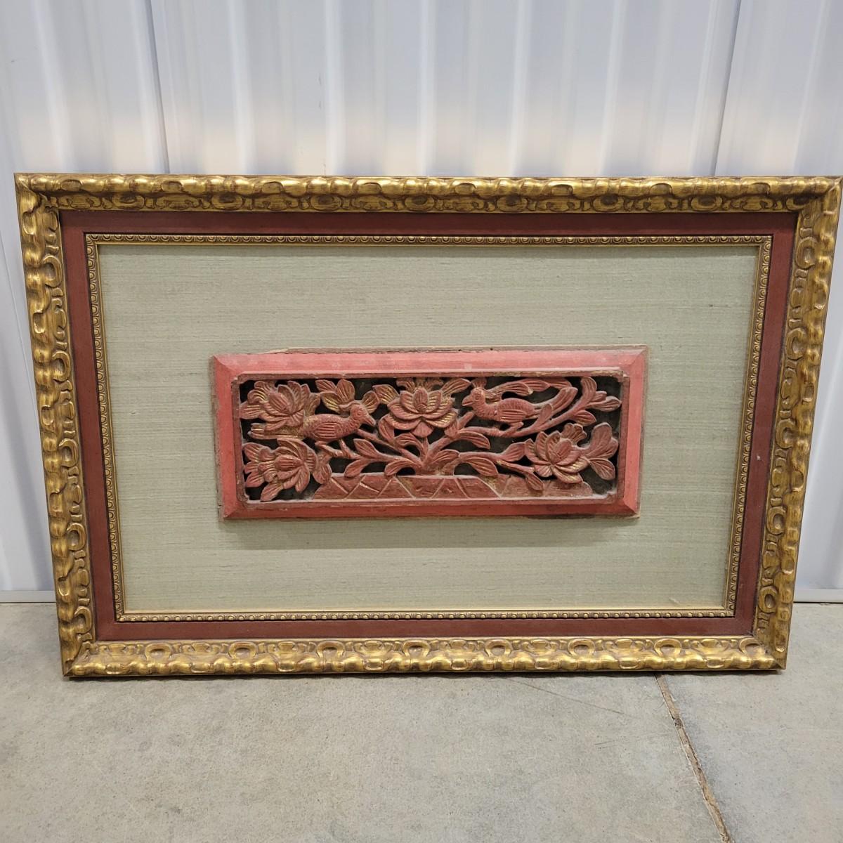 A vintage Asian carving in good condition. Carving is red with gold accents and has a chipped corner. Surface mounted on a silk mat surrounded by an ornate gold frame with a red mounding in the center. Measures approximately 29" x 19.5" x 2" Shipping available. Shipping Art can be costly please call UPS store at 828-252-6930 for quote