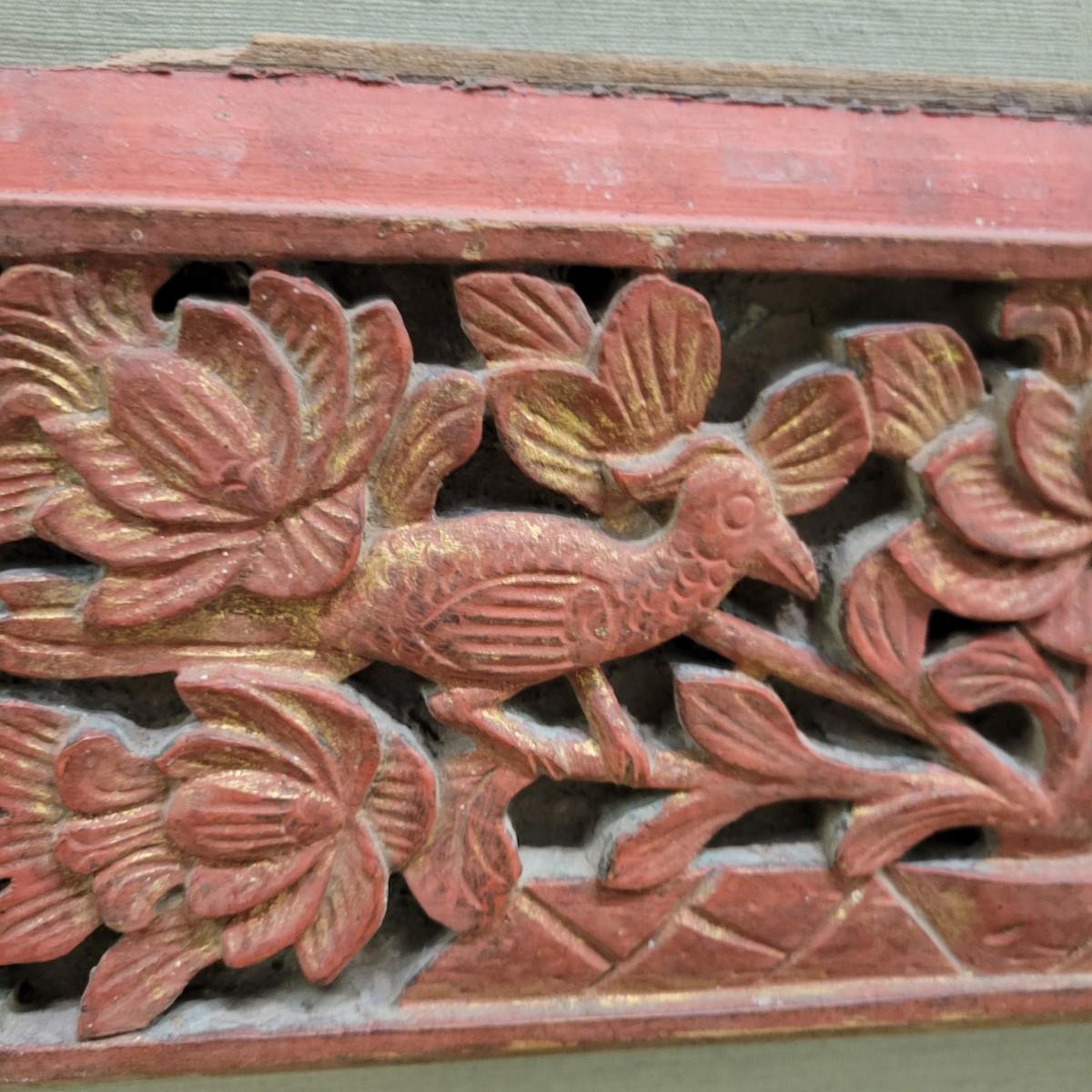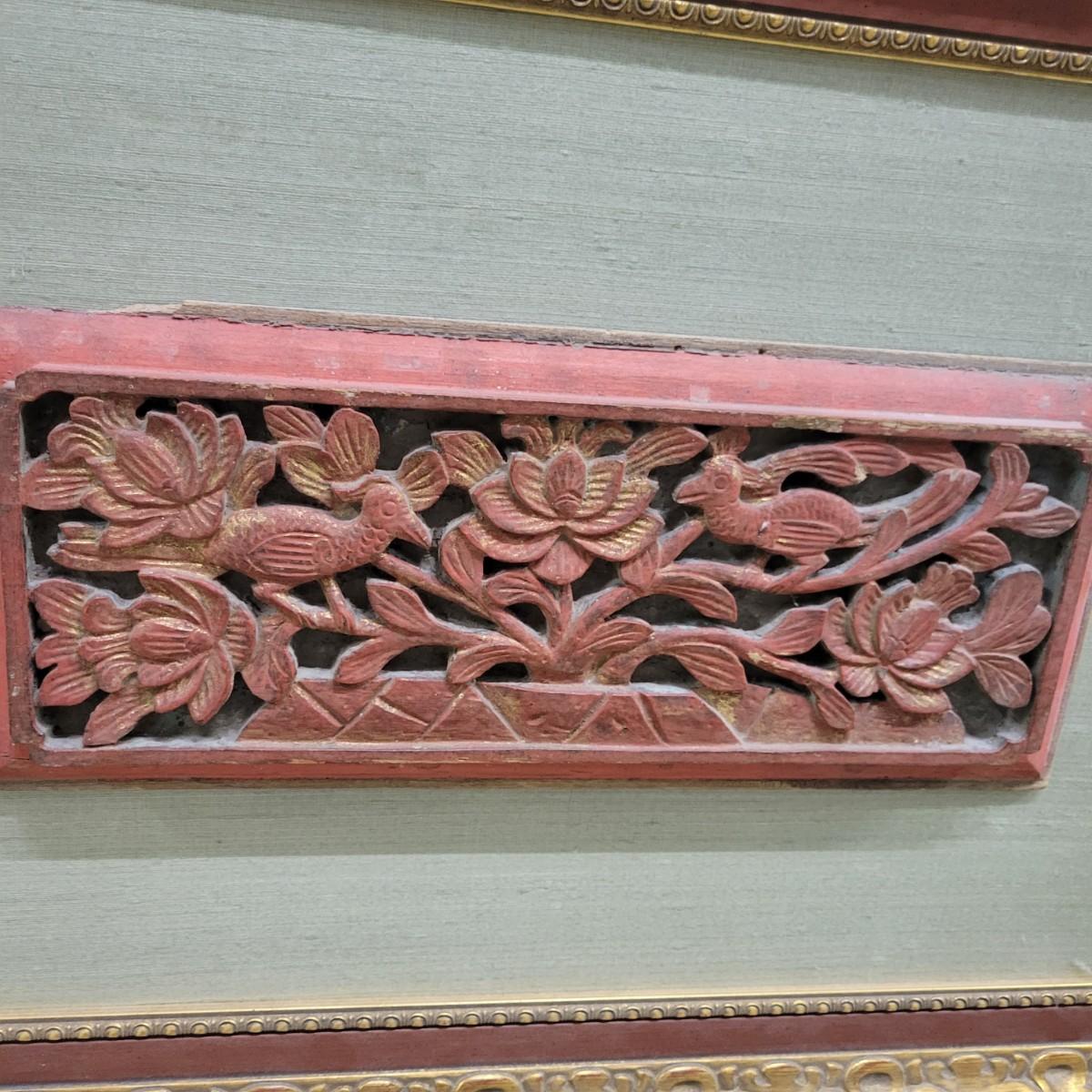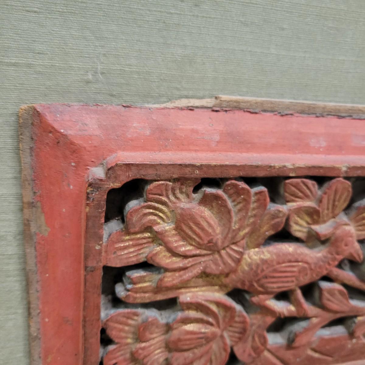 A vintage Asian carving in good condition. Carving is red with gold accents and has a chipped corner. Surface mounted on a silk mat surrounded by an ornate gold frame with a red mounding in the center. Measures approximately 29" x 19.5" x 2" Shipping available. Shipping Art can be costly please call UPS store at 828-252-6930 for quote