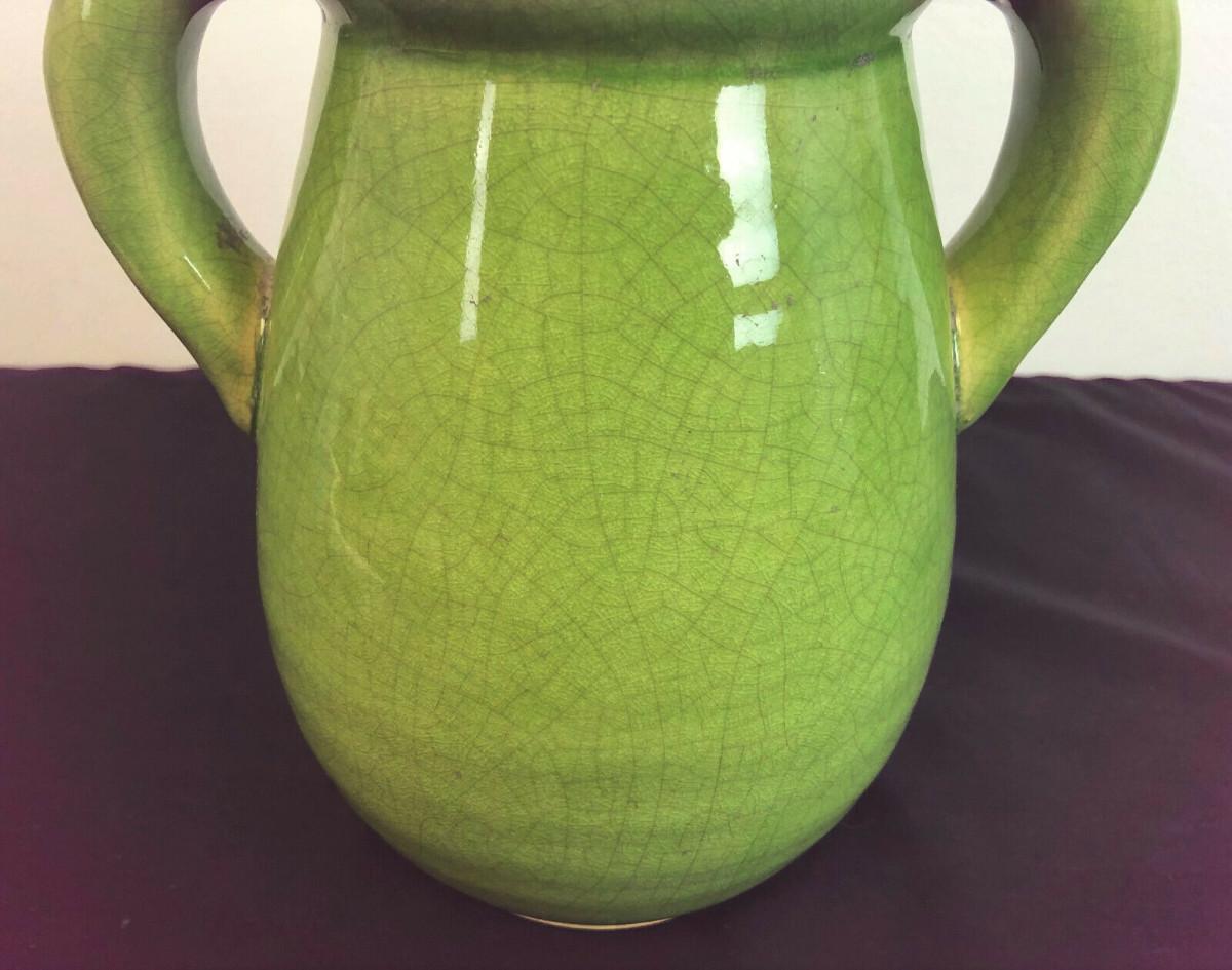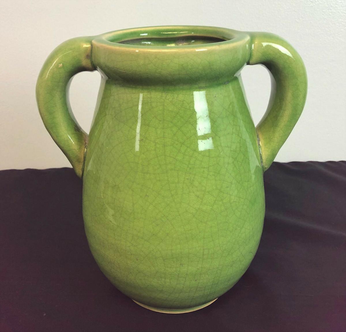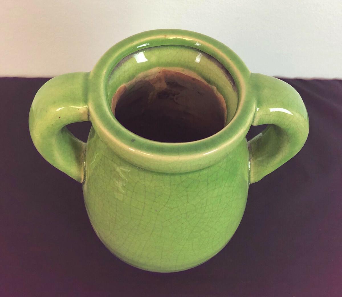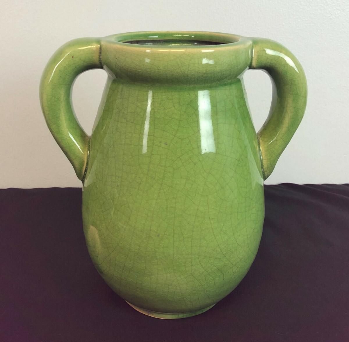 From a recent estate here is a heavy Celadon glazed handled jar or vase in excellent condition...No chips or cracks found...It obviously has some age but I can tell you little about it?..I infrequently sell Asian pottery...Stands 8.75" high...and weight is nearly 6 pounds...with the customary crackle glaze...Offered with no reserve...