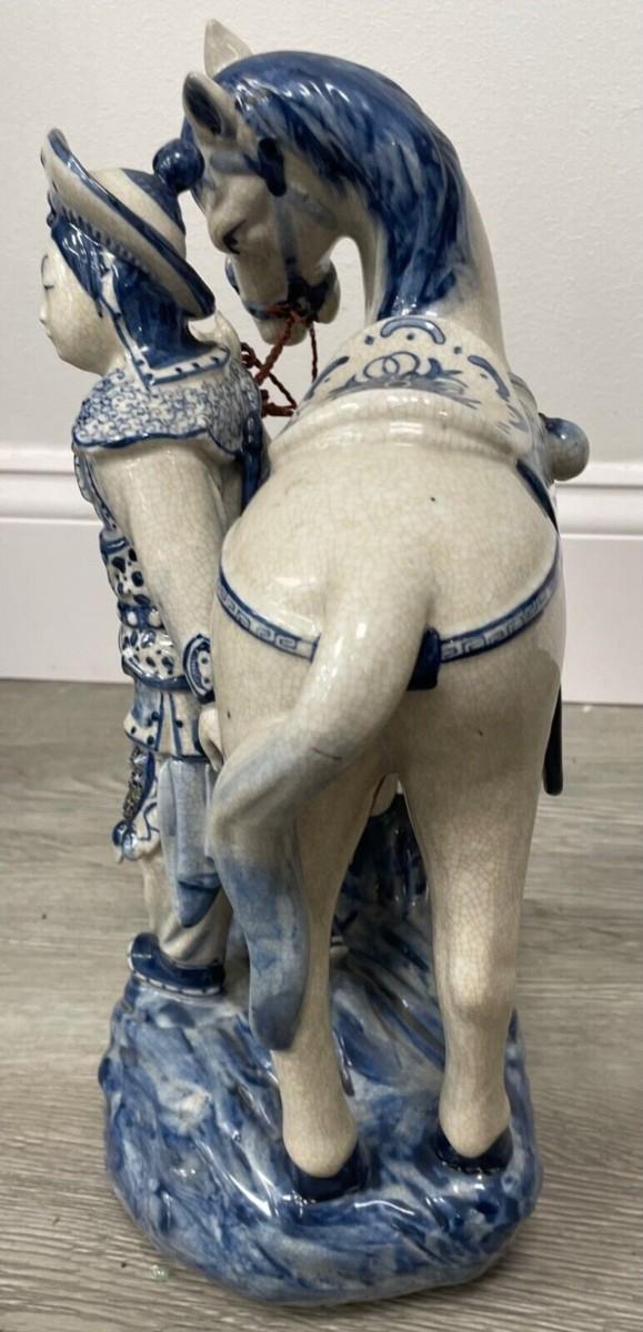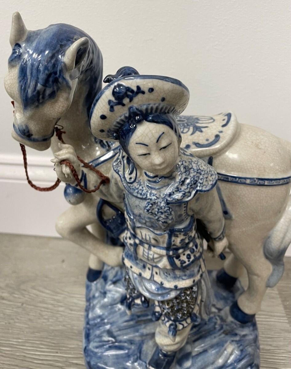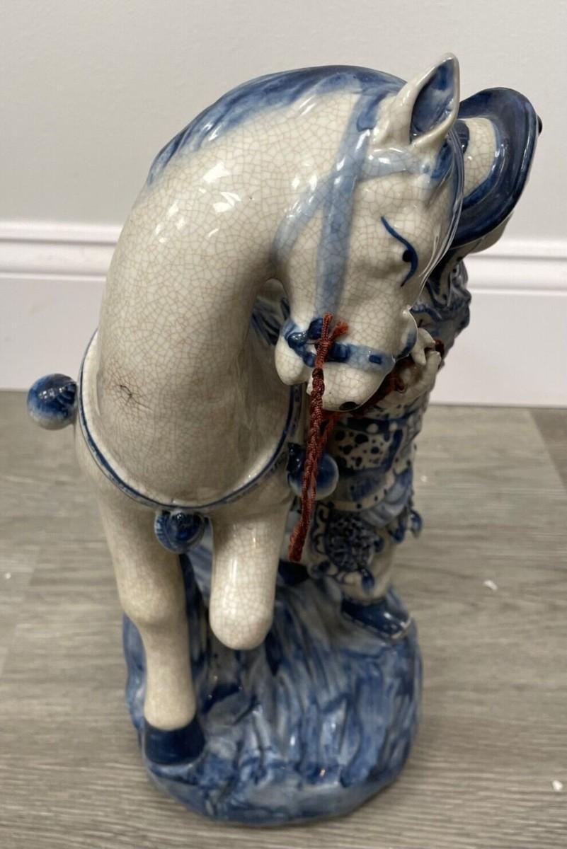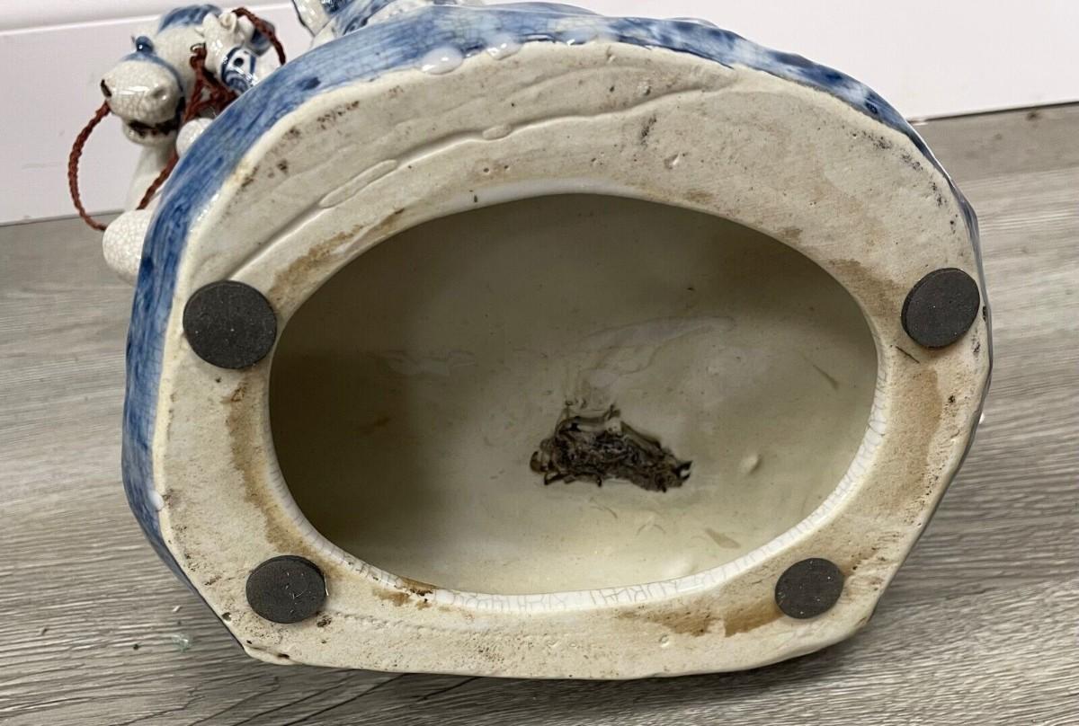 Description: This vintage Asian ceramic statue depicts a traveler and is a beautiful addition to any collection. The intricate details and craftsmanship showcase the rich culture of Chinese artistry; Measurement approximate: 14 H x 9.5 L Inches