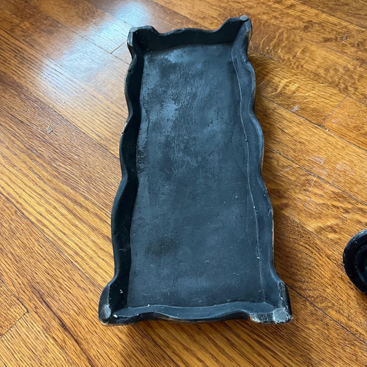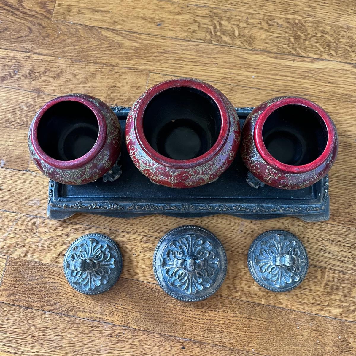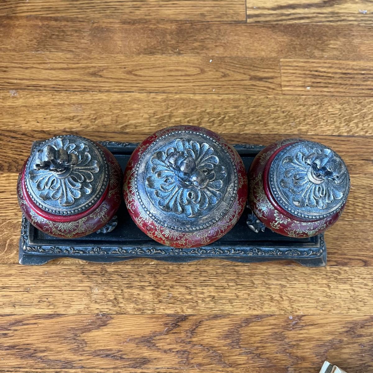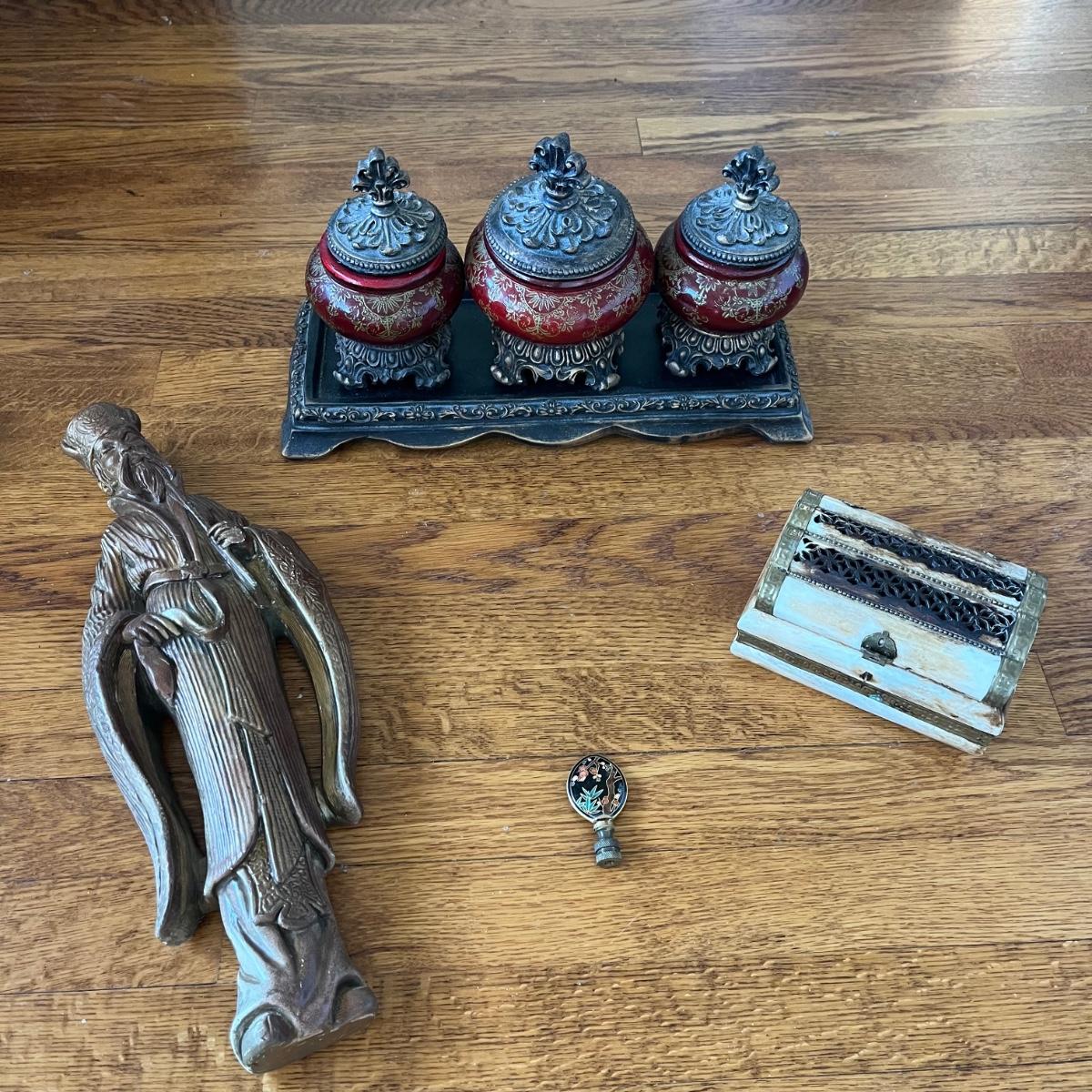 Gold tone Asian chalkware figure (measuring 6” x 17”), a decorative jewelry box, a trio of decorative ceramic urns on a matching tray and an Asian themed finial.
