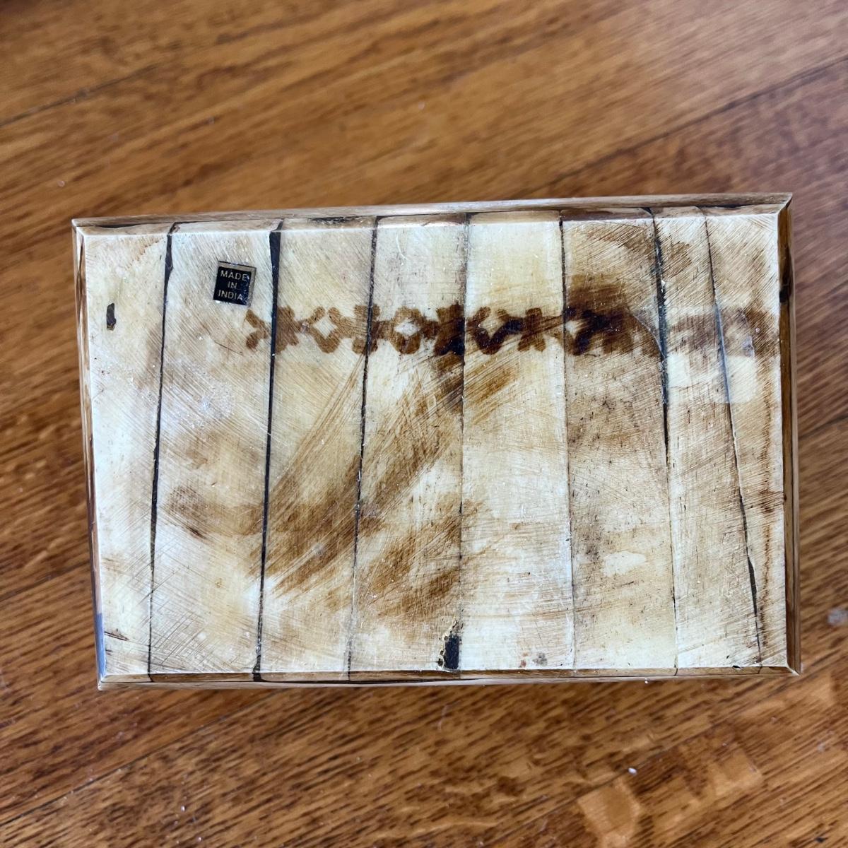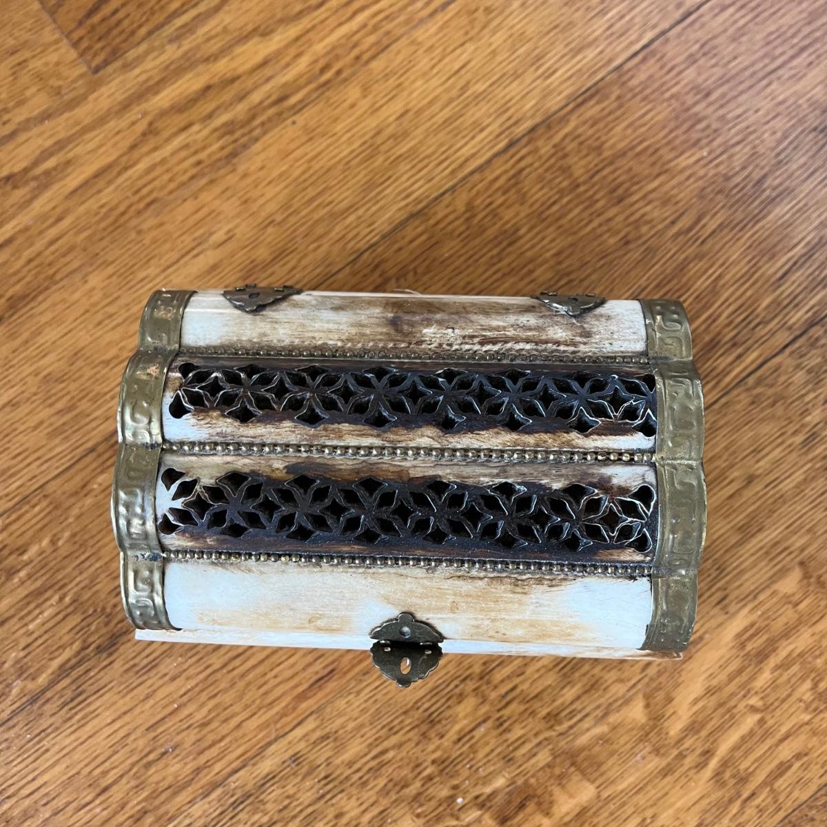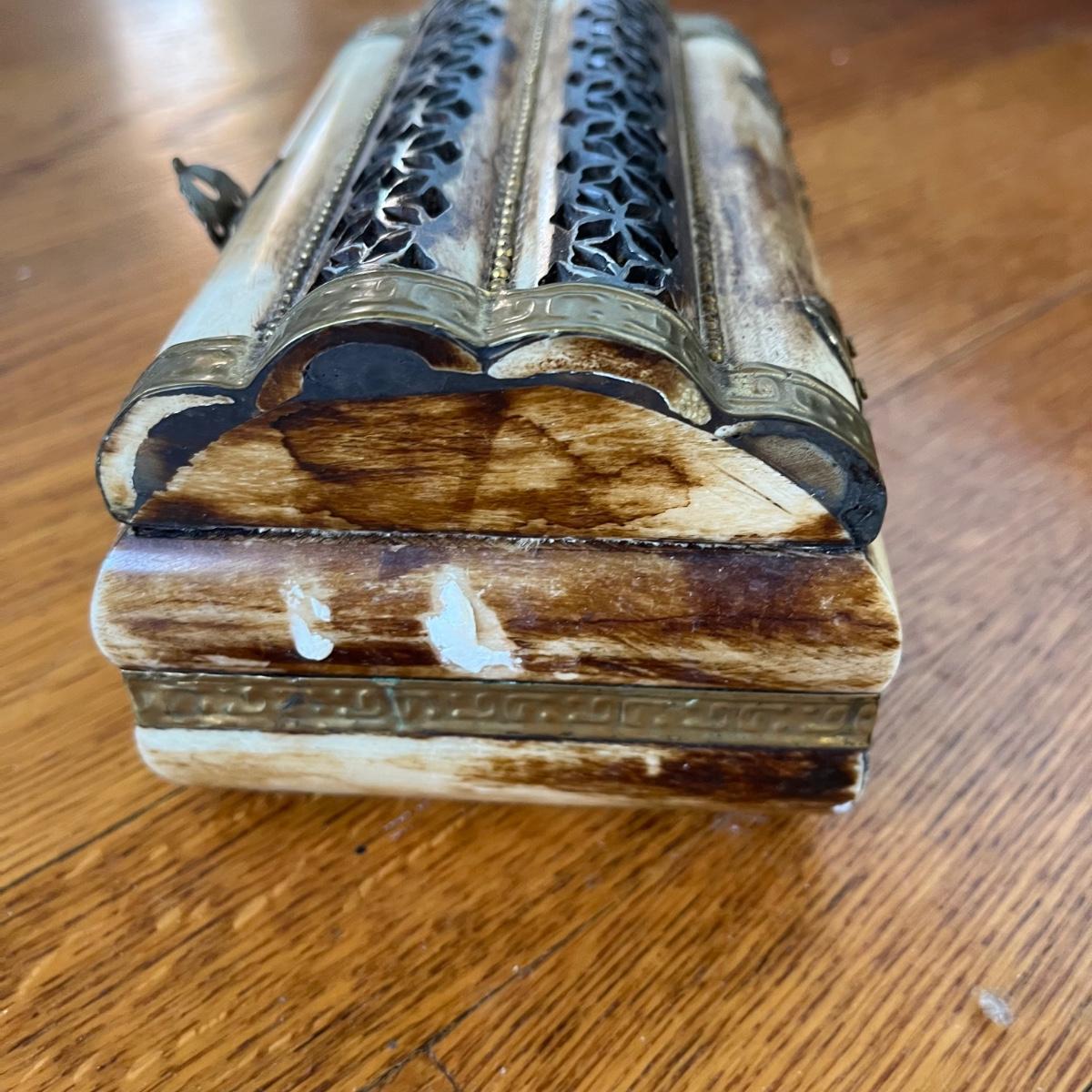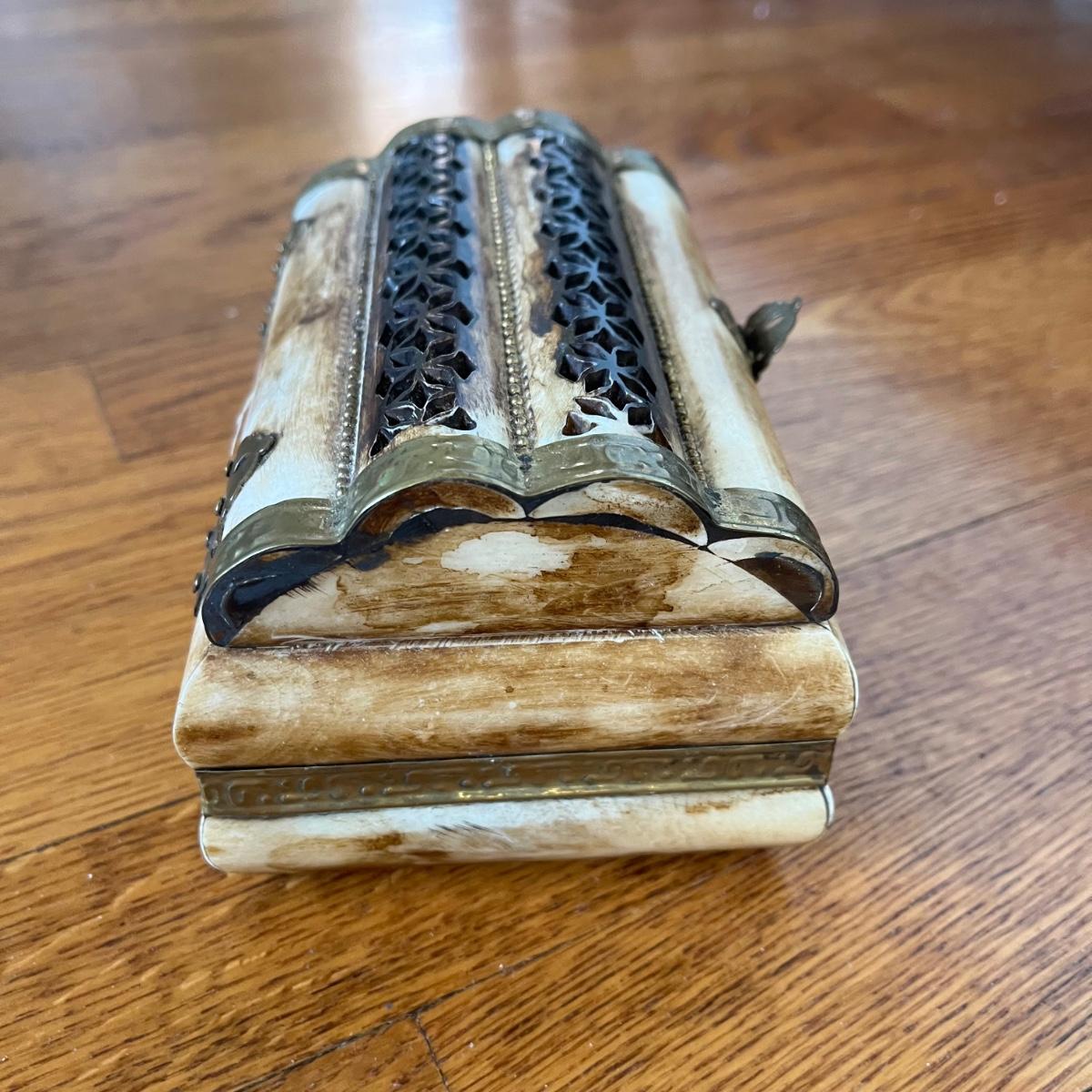 Gold tone Asian chalkware figure (measuring 6” x 17”), a decorative jewelry box, a trio of decorative ceramic urns on a matching tray and an Asian themed finial.
