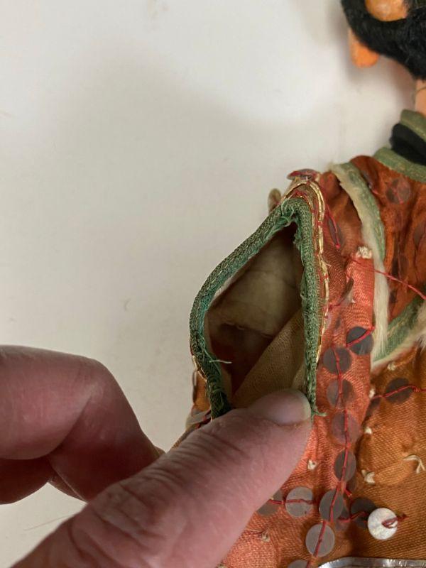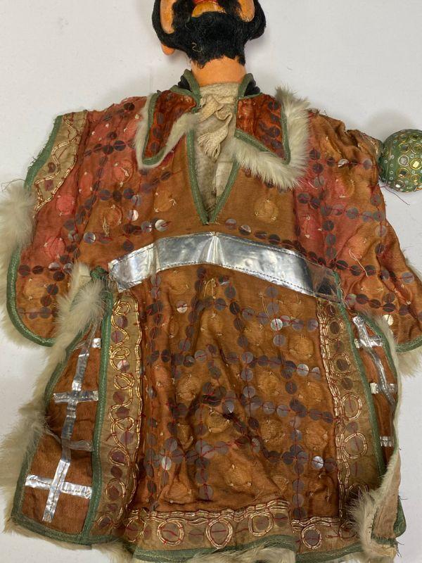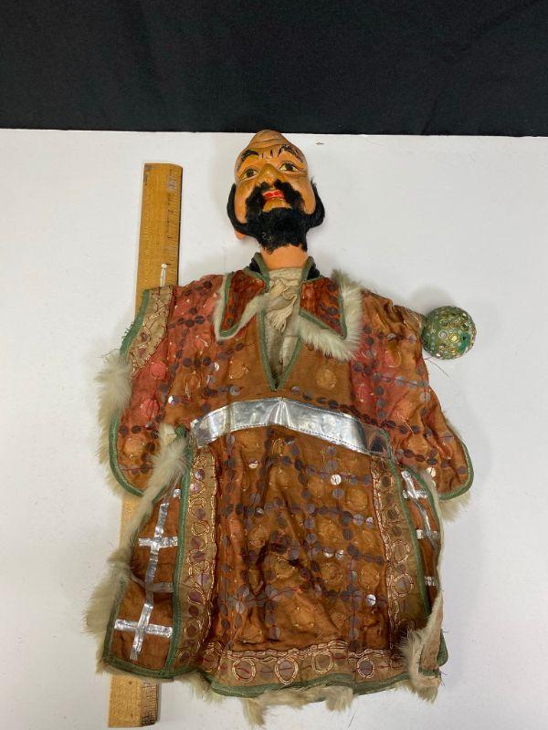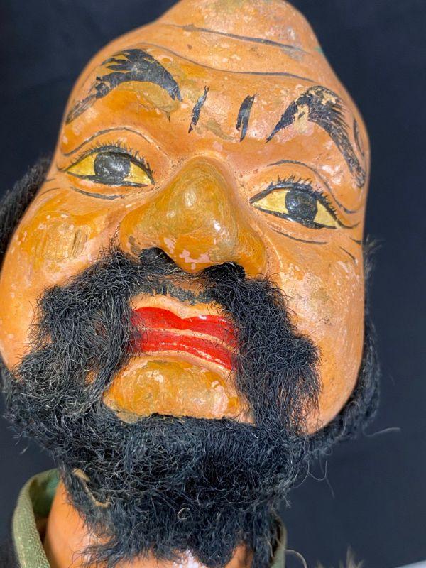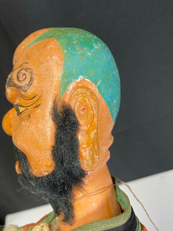 Vintage Asian man Chinese opera style hand puppet. Under 18" size. Has signs of use and age. His clothing is falling apart. He is missing his right hand. It does look like he has been repainted in spots. Displays nicely.