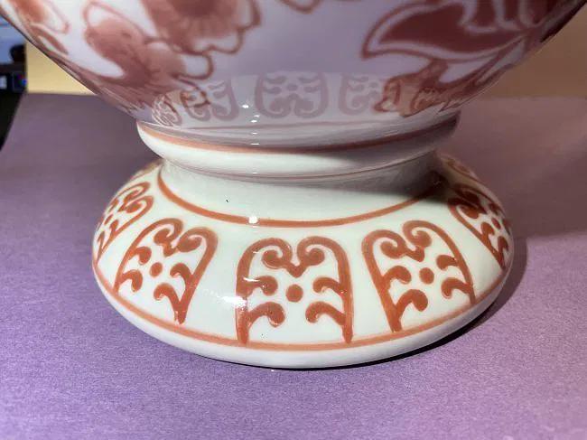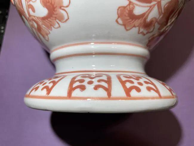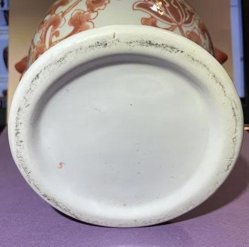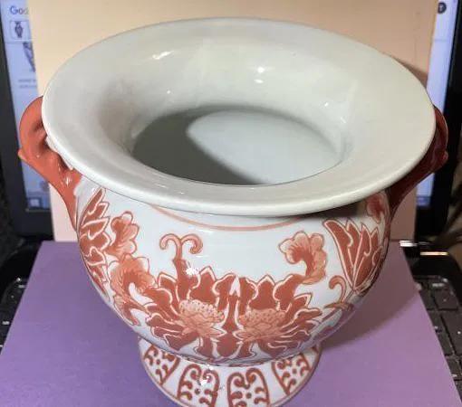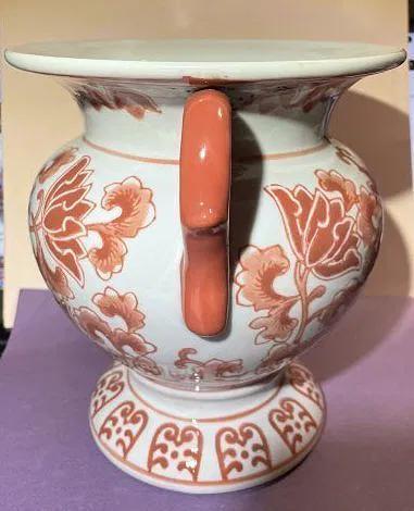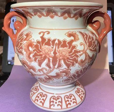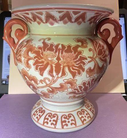 Vintage Asian Hand Painted Porcelain Double Handled Coral Colored 8" Tall Heavy Vase Preowned from an Estate in Good Condition. $15 Domestic Shipping.