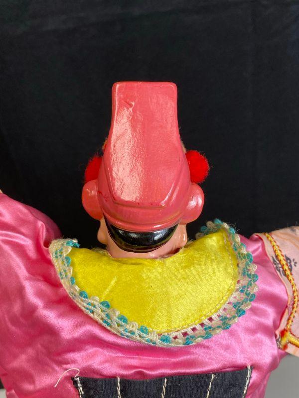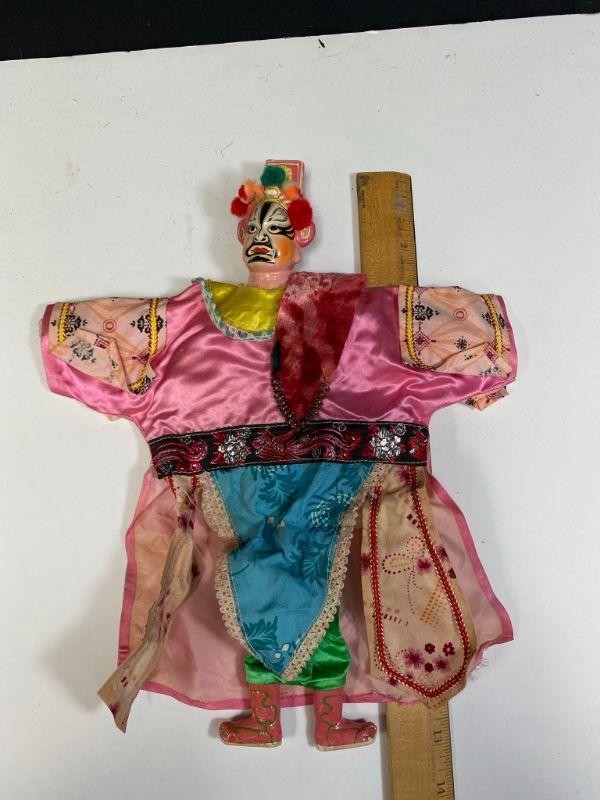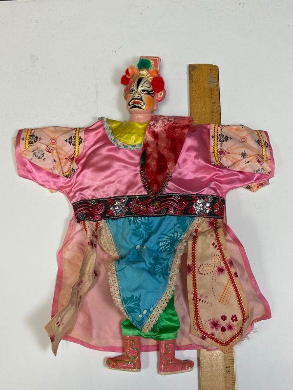 Vintage Kabuki Samurai style Asian hand puppet. Hands, feet, and head are porcelain. He is a newer puppet, has a Made in China sticker. About 13" size. Slight fade/ discolor to material from display.