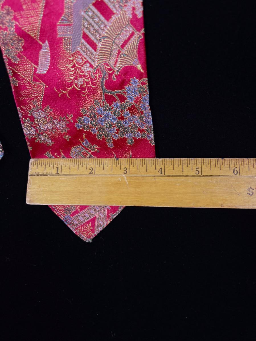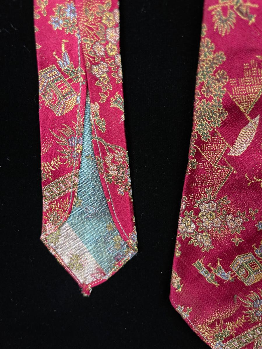 DESCRIPTION: This man’s neck tie is a bright red silk that has been finely detailed with traditional garden pagoda and dragon boat canal scenes. In perfect vintage condition.