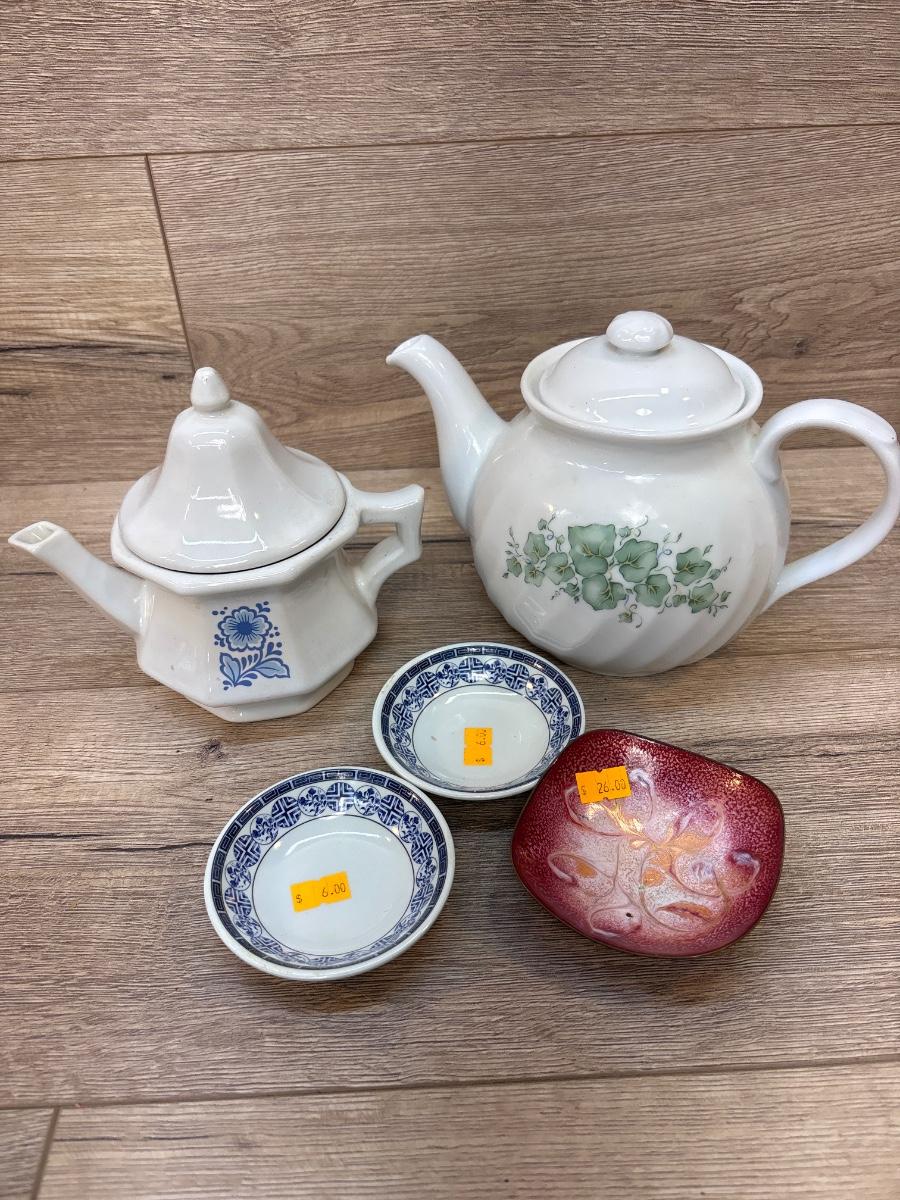 Vintage Asian mini bowls, Corning and Avon teapots