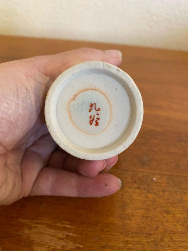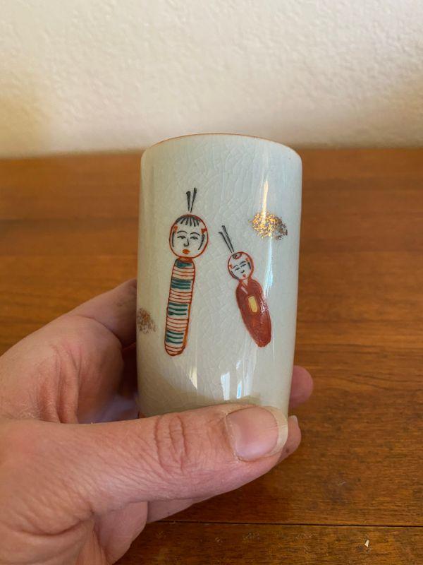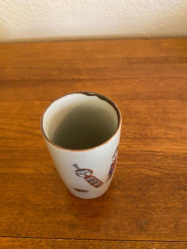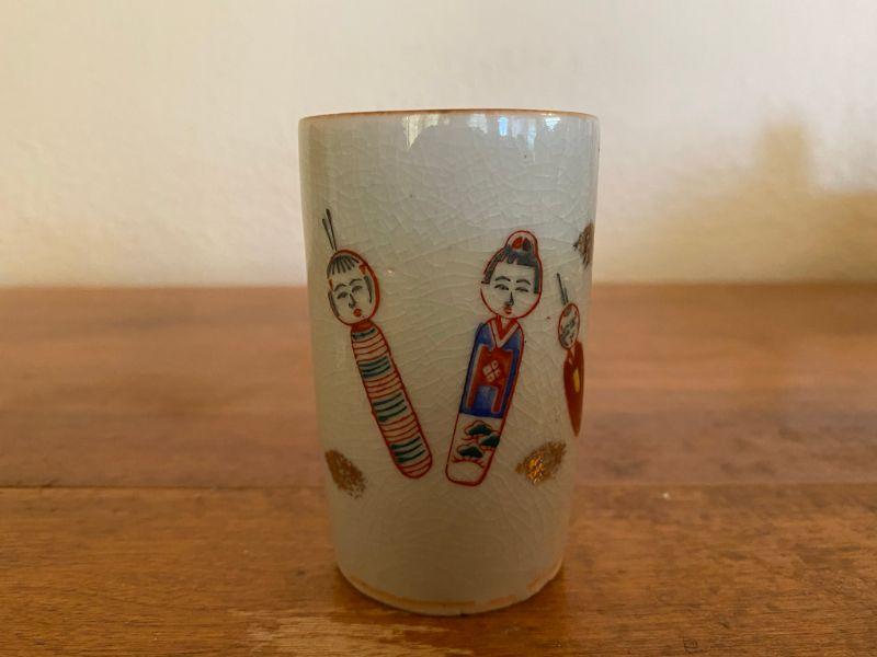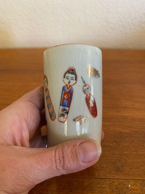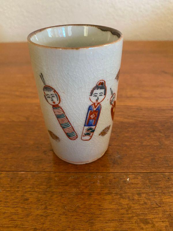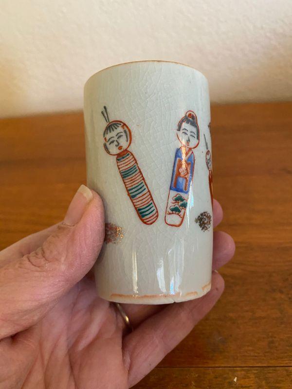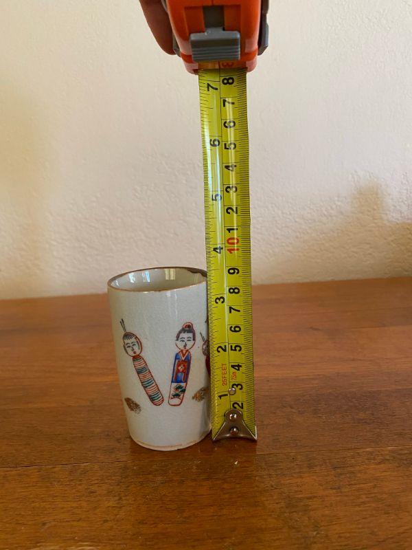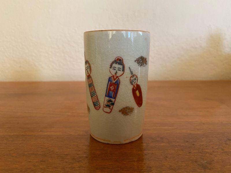 Vintage Asian cup/vase. Has colorful people images on it. No chips but a lot of crazing.