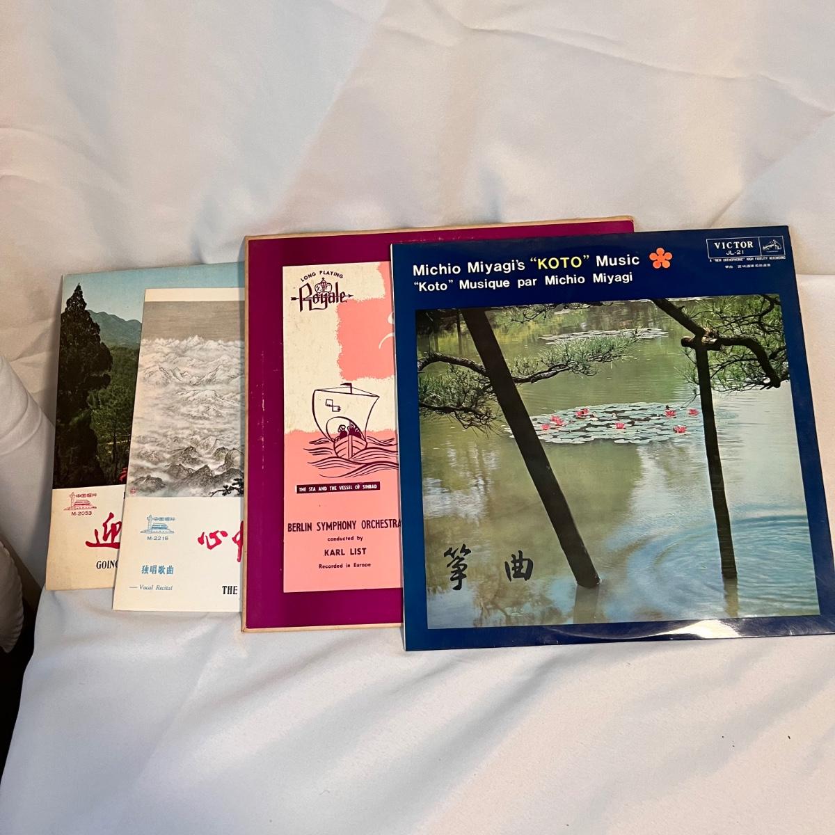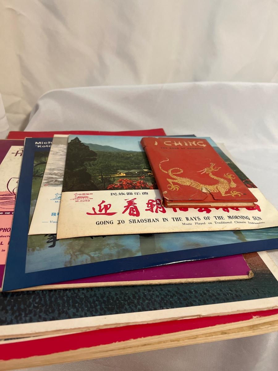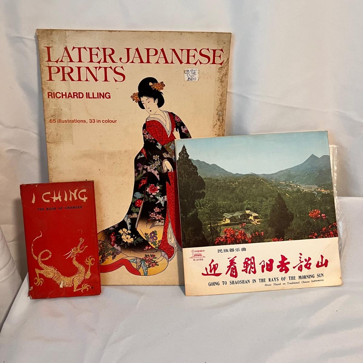 This lot includes six Japanese vinyl records (two are 45’s) as well as three asian style vintage books. All the vinyl appears to be in good condition but some of the packaging is a little scratched or bent.