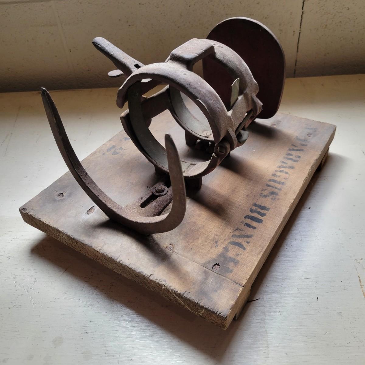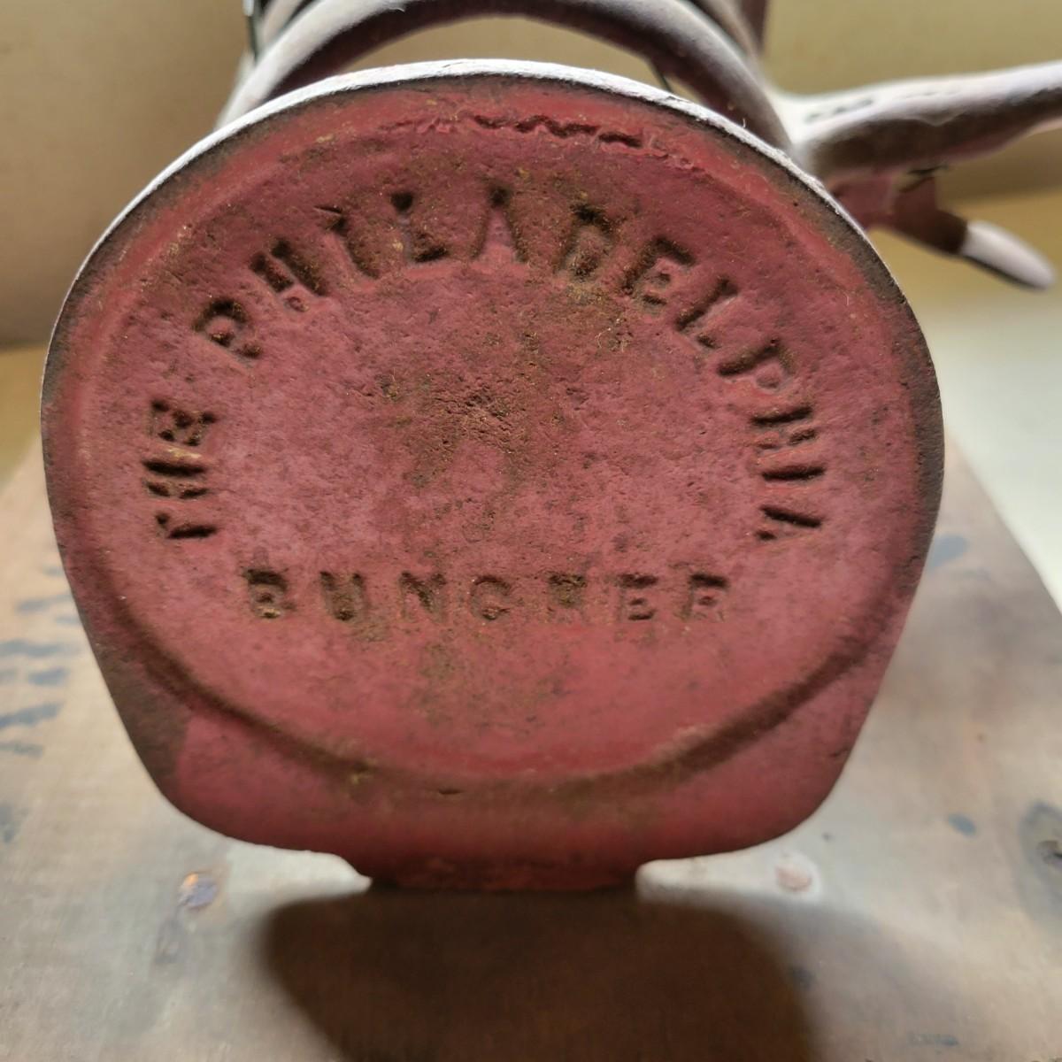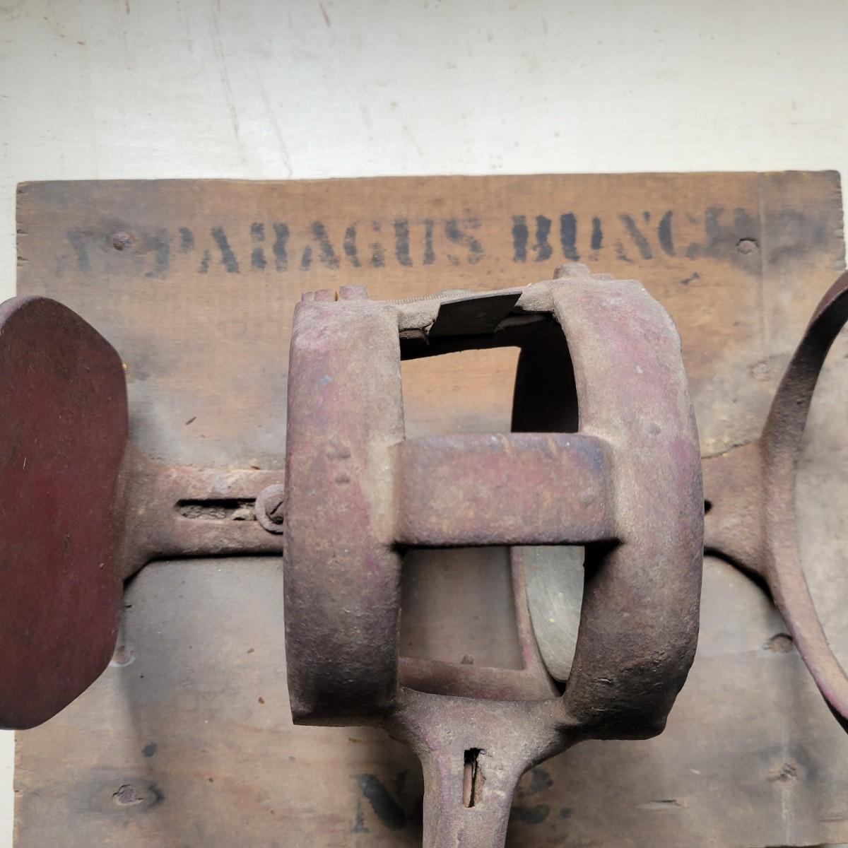 An antique The Philadelphia Buncher asparagus buncher. Item appears to be cast iron attached to wood. Wood is marked "Asparagus Buncher No. 2". It measures approximately 12" x 9.5" x 7". Buncher is mostly in good condition but has some rust and dust apparent. Shipping available.