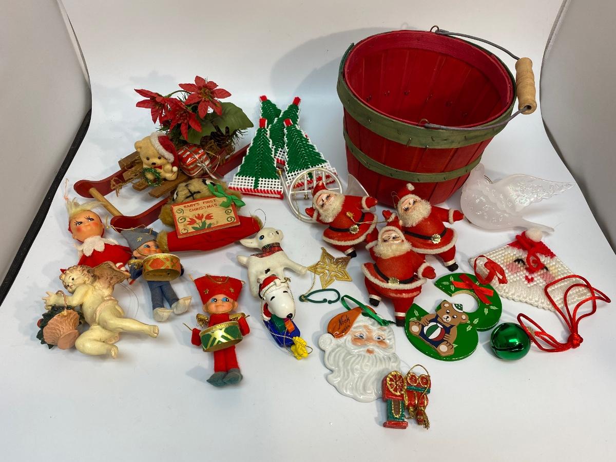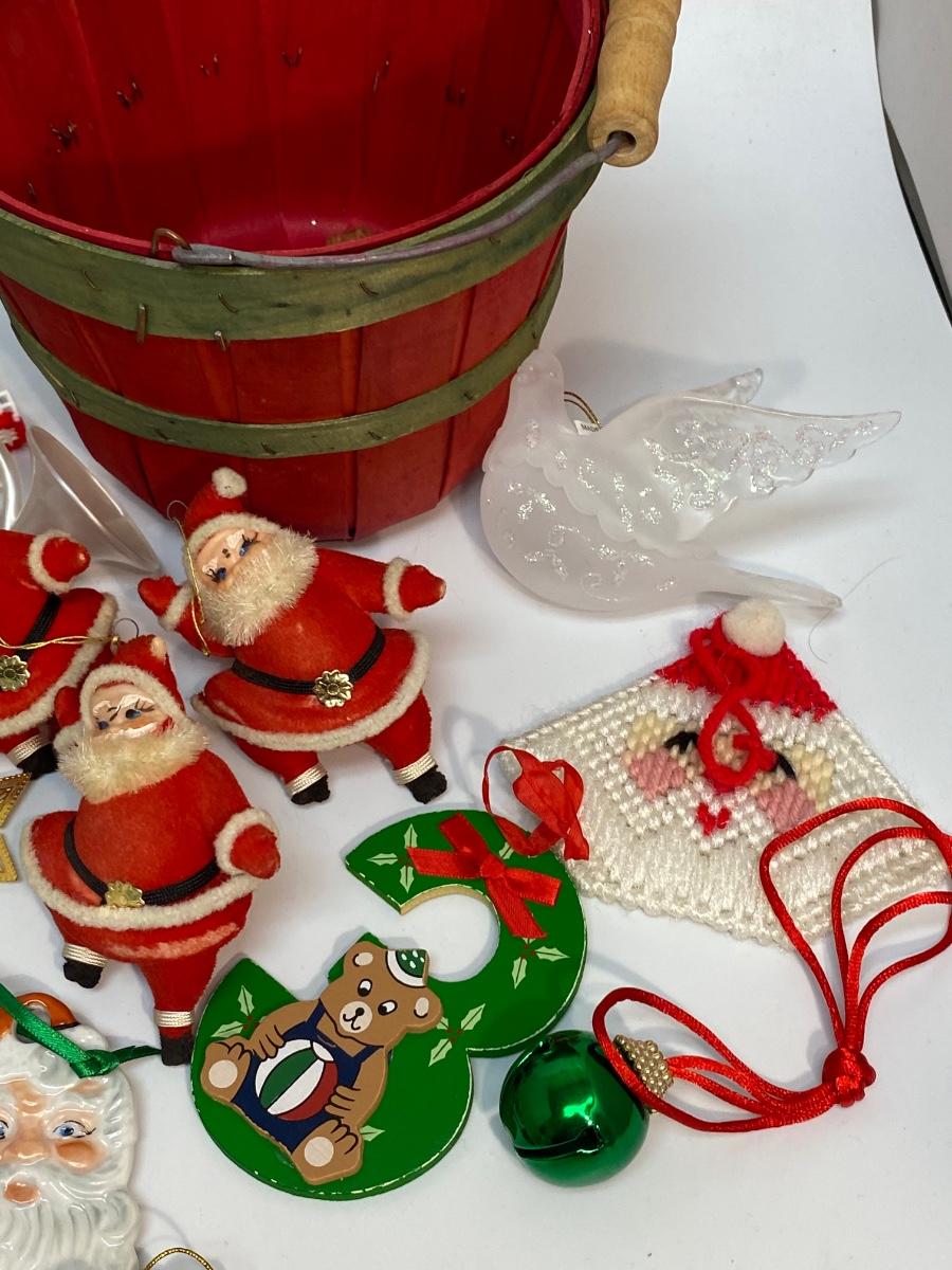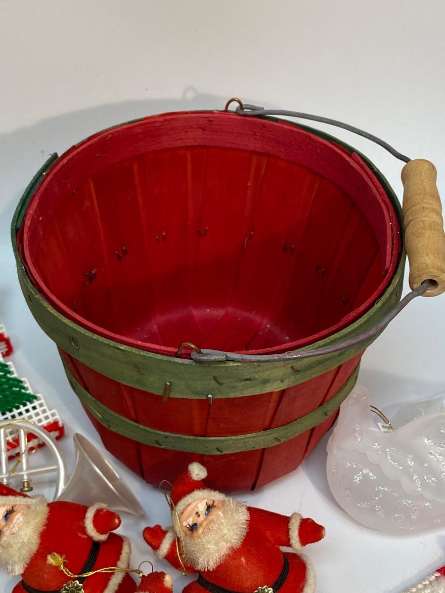 Vintage Assortment of Holiday Christmas Tree Ornaments. Good vintage condition. Small red wood pail included.