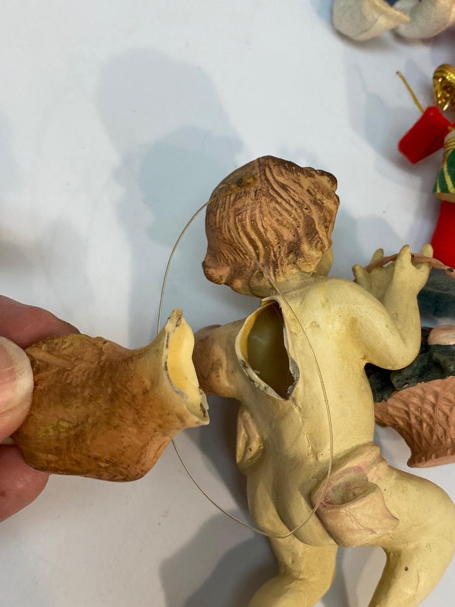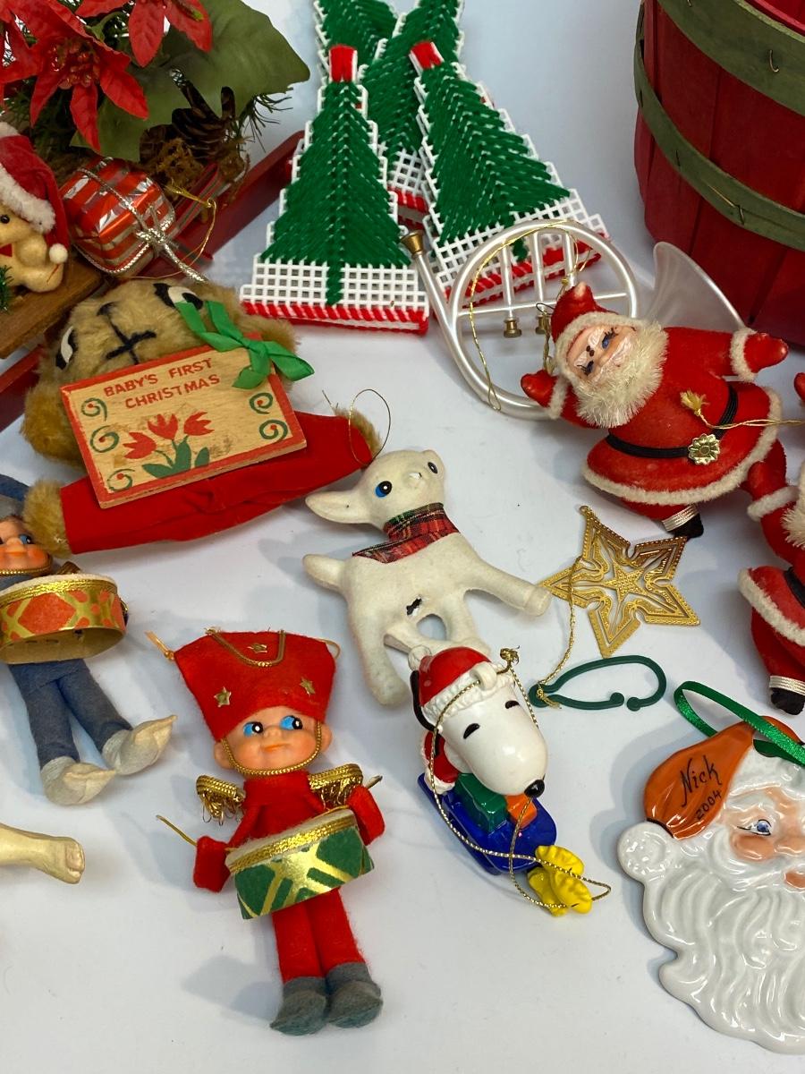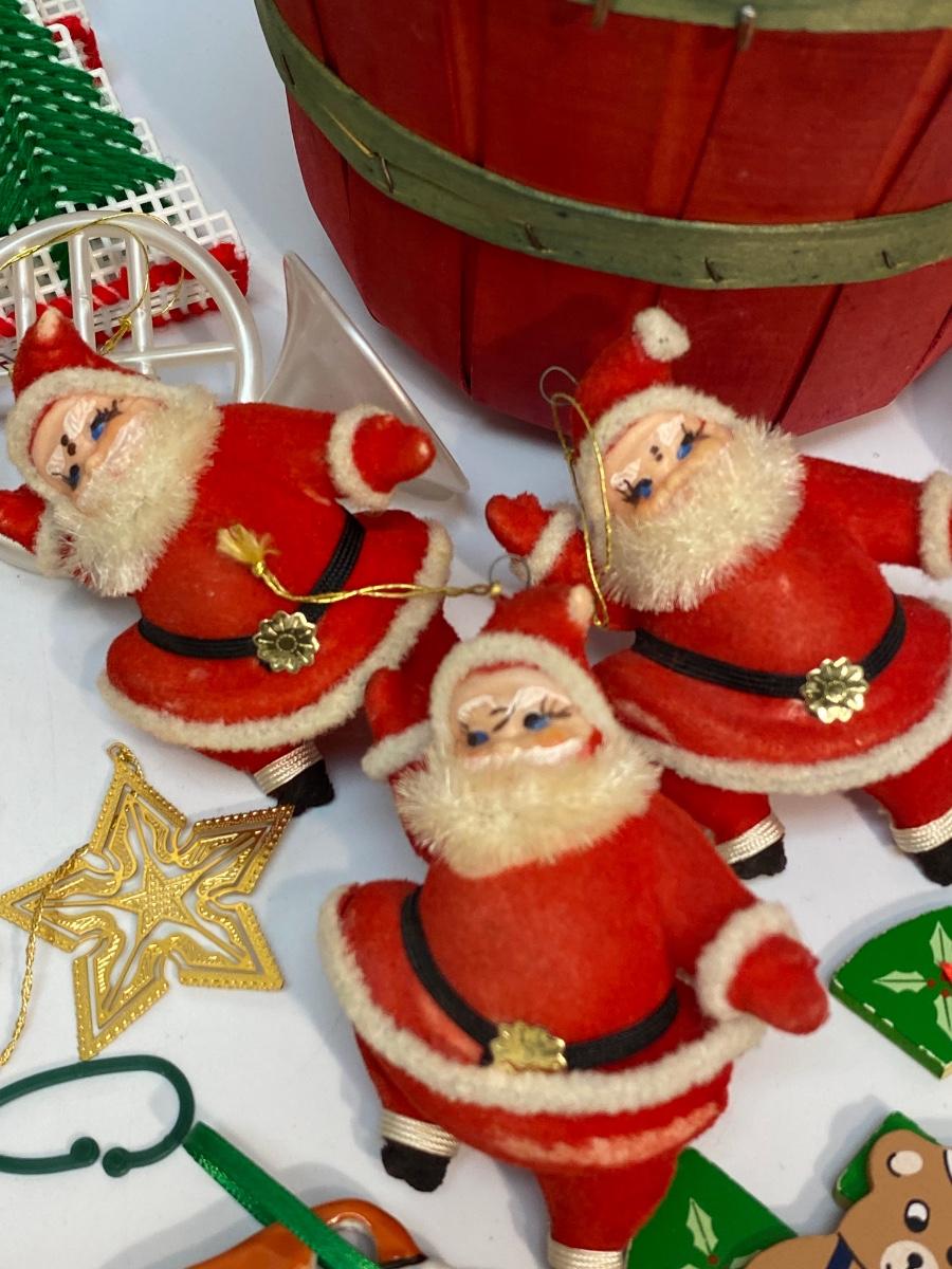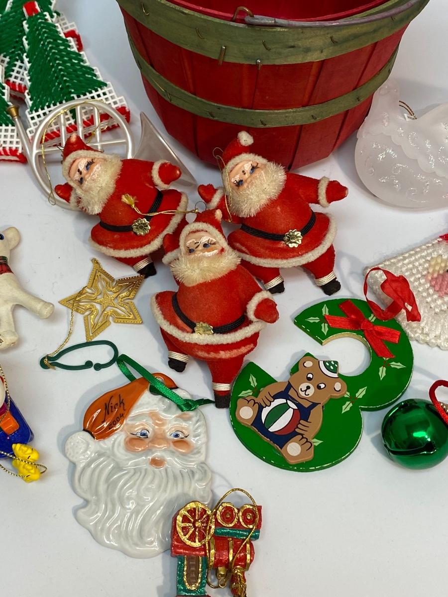 Vintage Assortment of Holiday Christmas Tree Ornaments. Good vintage condition. Small red wood pail included.