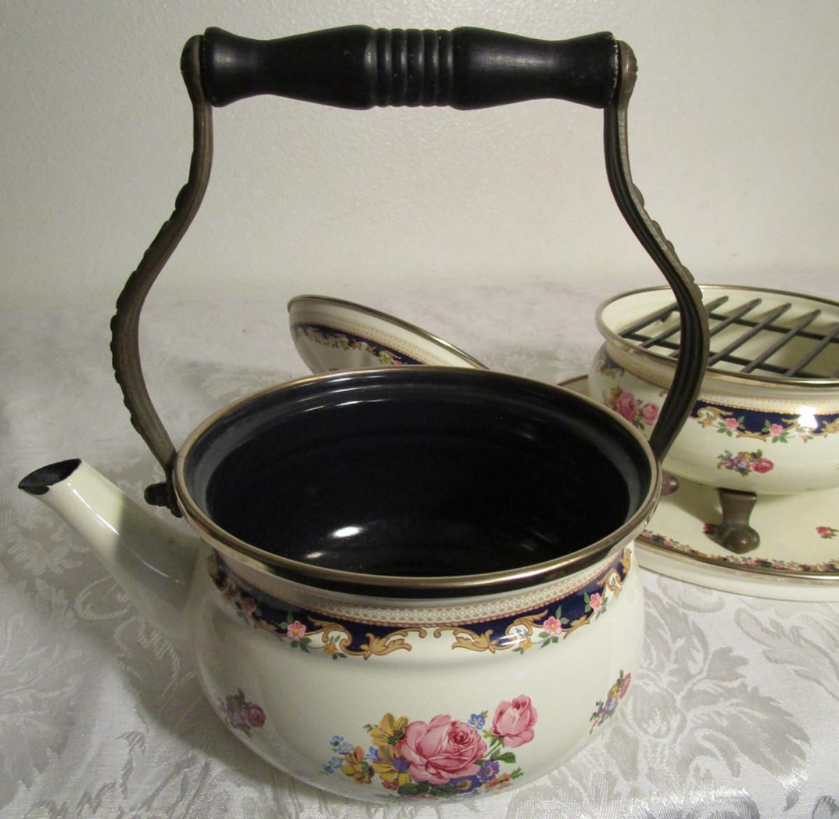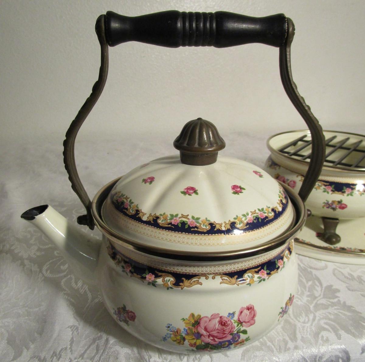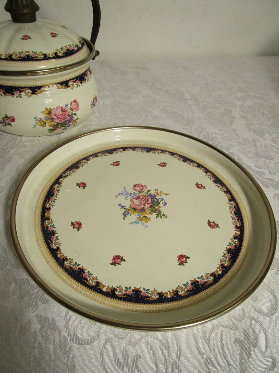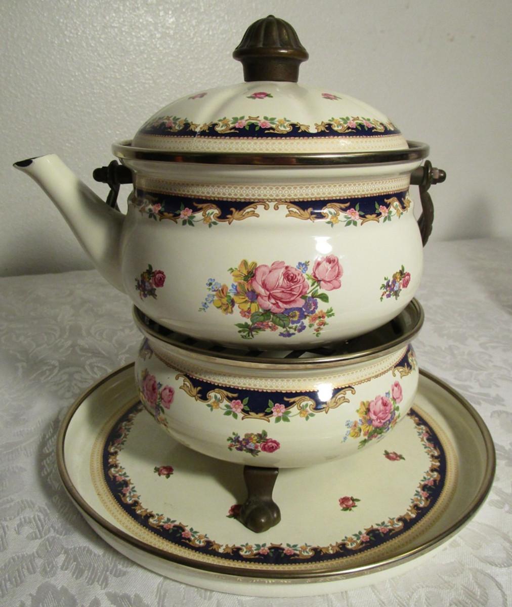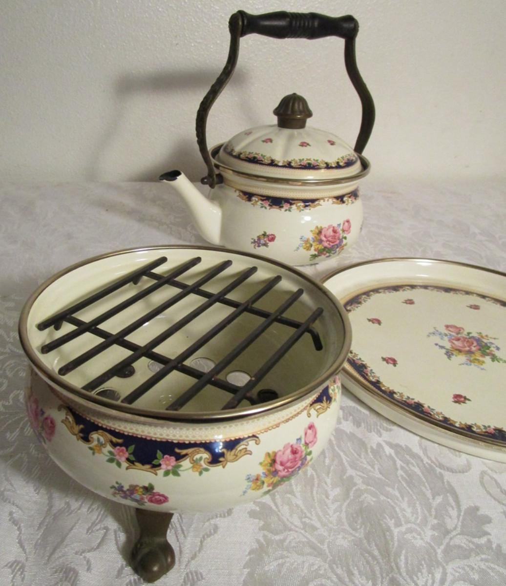 Vintage Asta enamelware teapot, warmer & serving tray