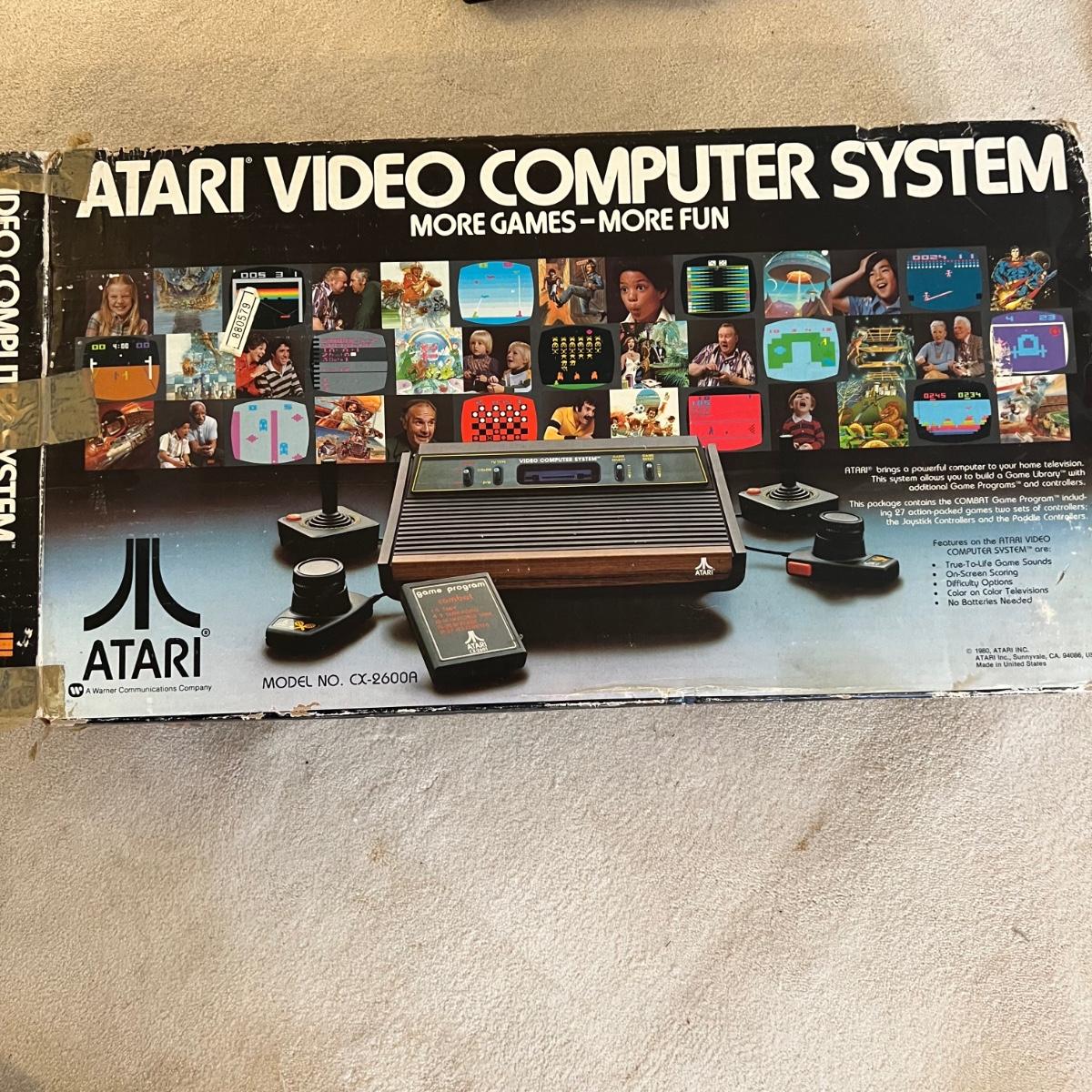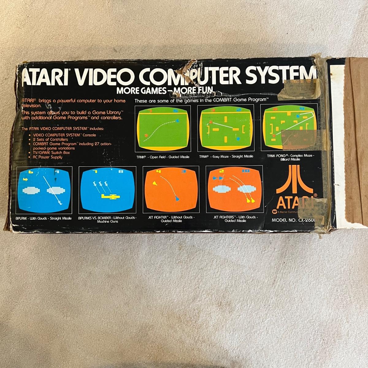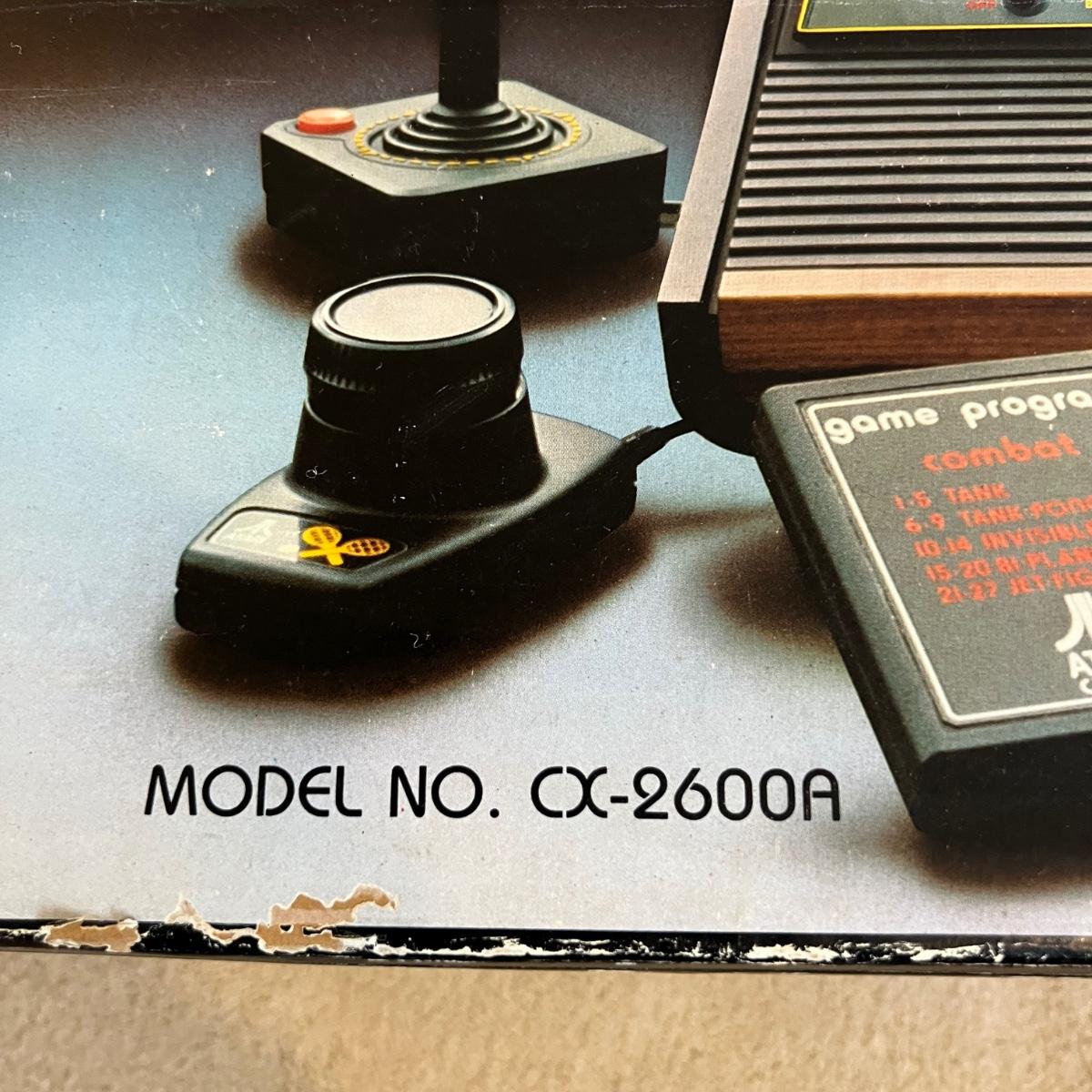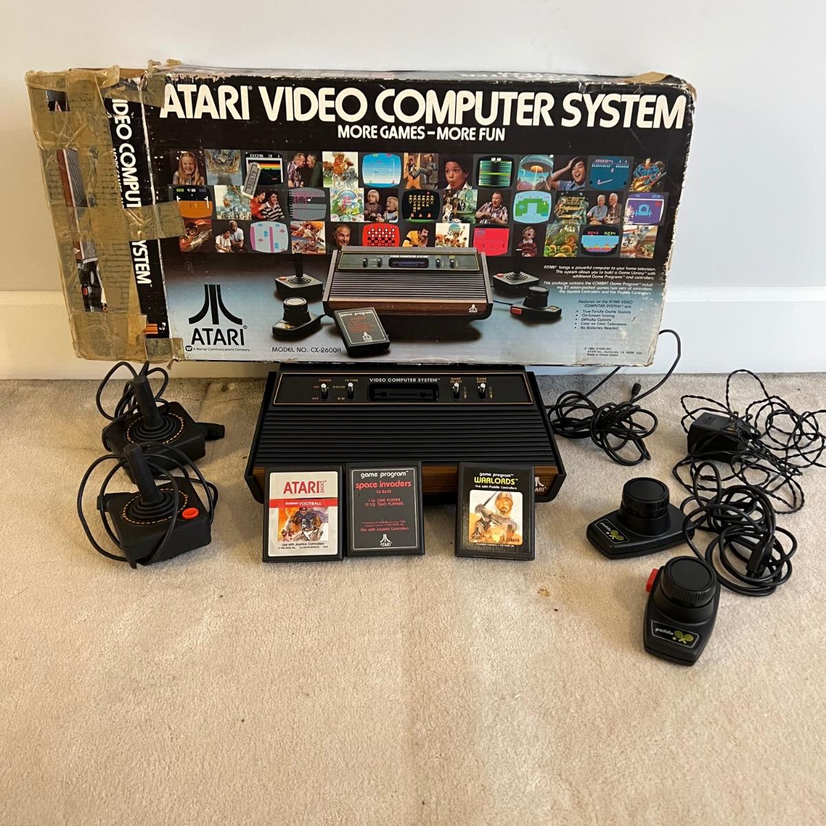 Atari model no. CX-2600A Video Computer System. Package includes the unit itself, two paddle controllers, two joystick controllers. Also includes three games: Space Invaders (played with joystick controller), Atari 2600 Real Sports Football (played with joystick controller) and Game Program Warlords (played with paddle controllers). Unit power cord available and was plugged in, but unable to verify operability because there is no indicator that power is on (light) and unit was not tested with a television. Shipping available. Shipping can be costly. We suggest calling our local UPS store and getting a quote before bidding: (828) 252-6930.