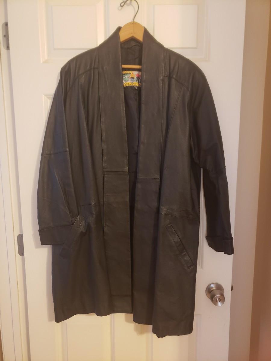 Vintage 1980s Atlantic Beach black leather swing coat.. Women's size M.