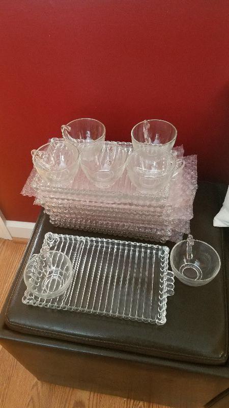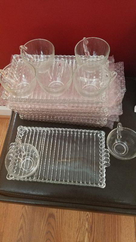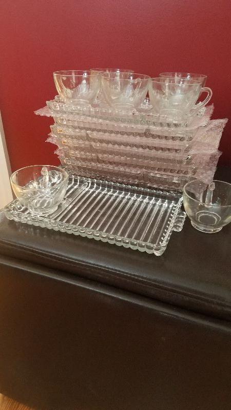 Includes 7 dainty clear glass cups (may not be original glasses)