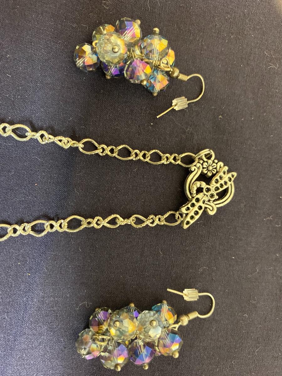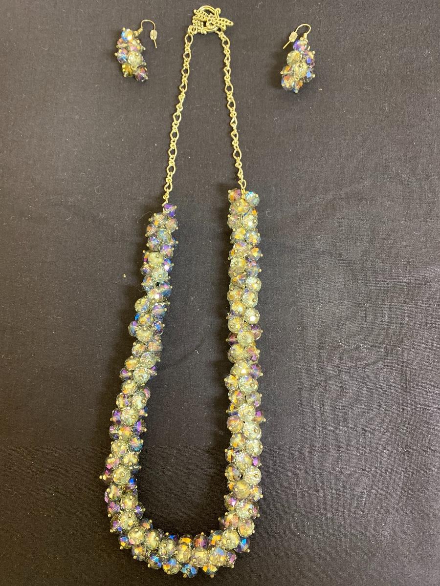 Jewelry Lot D. Aurora Borealis rhinestone cluster necklace & earrings. Has a purple hue - stunning. Necklace has a butterfly clasp, earrings are fishhook pierced.