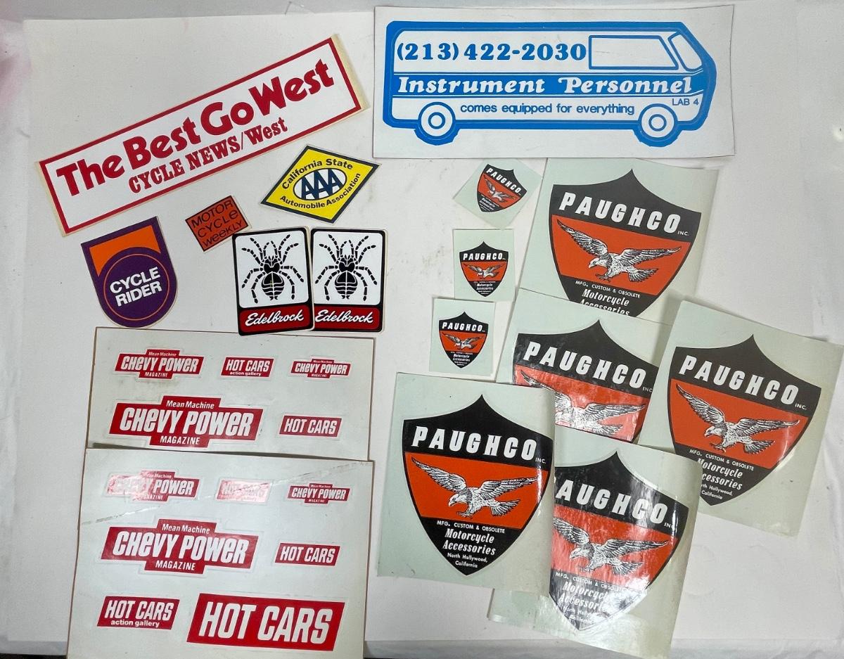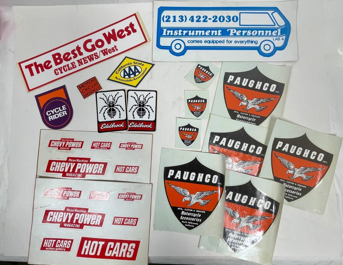 Vintage Automotive & Motorcycle Equipment Sticker Lot - Paughco, Cycle Rider, Hot Cars, Cycle News West, and more.
